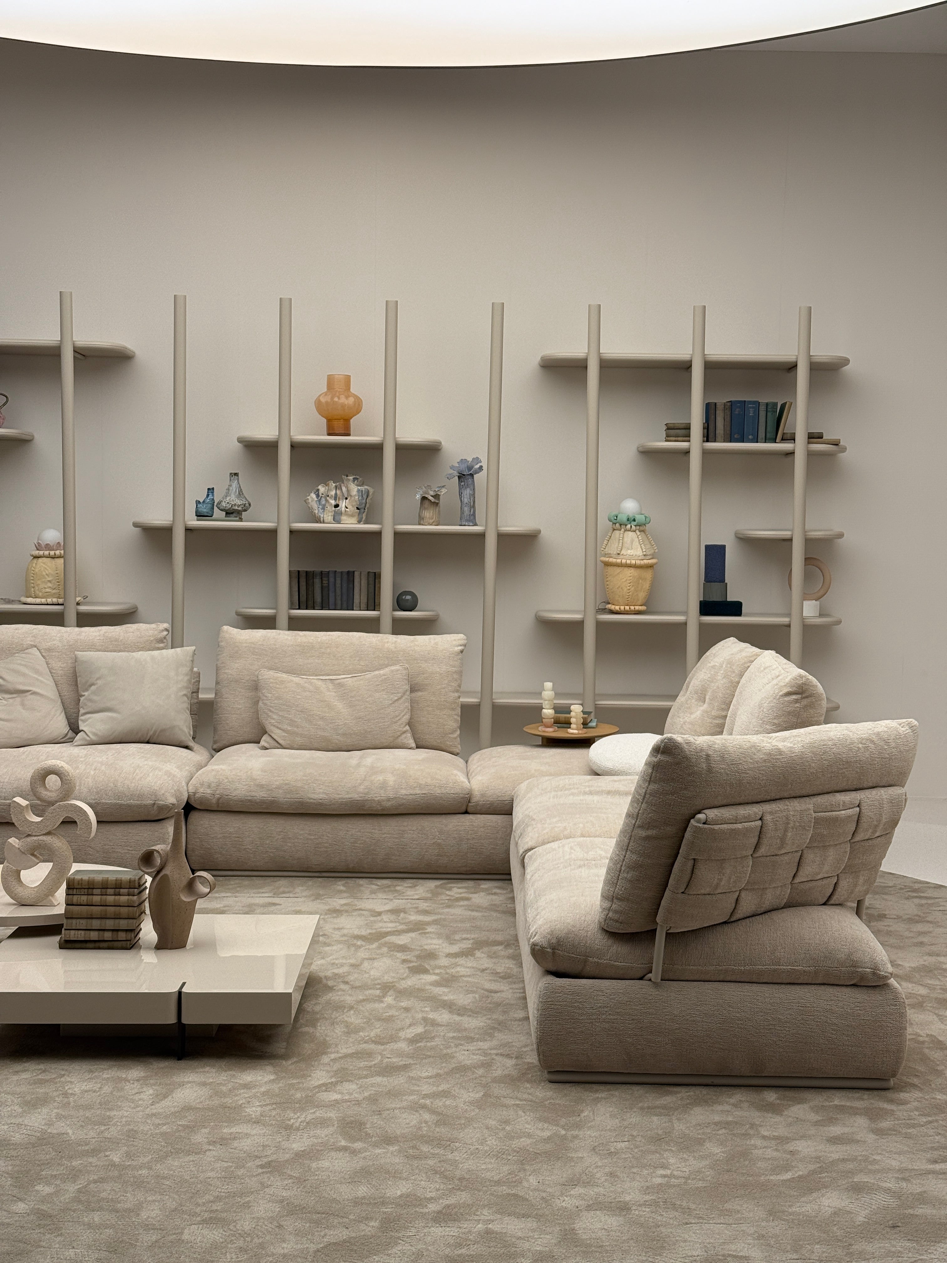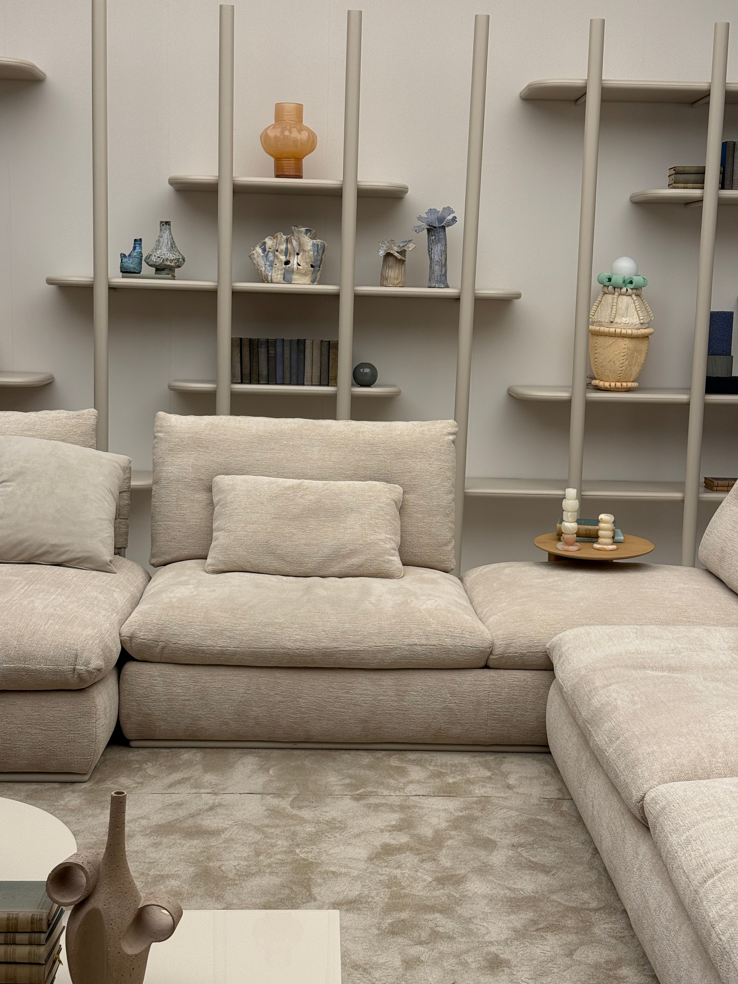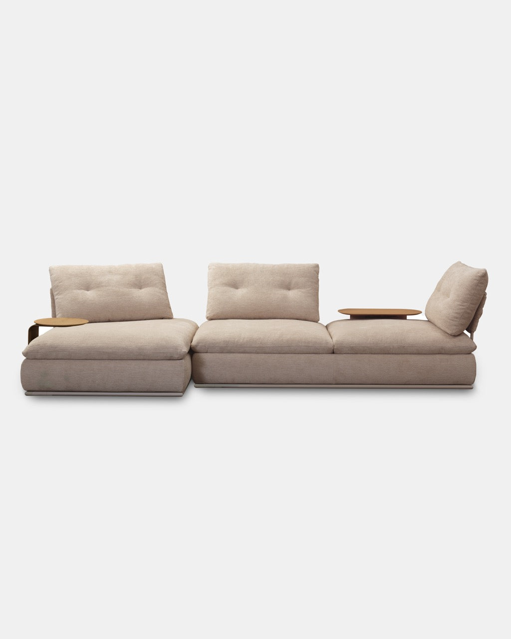 Sofaens fleksible konstruksjon gjør det mulig å endre oppsettet med enkle grep – de individuelle ryggmodulene kan flyttes og omplasseres intuitivt etter behov. Dette gjør Land til et allsidig møbel som like gjerne fungerer som en frittstående enhet som i en større moduloppbygget løsning.