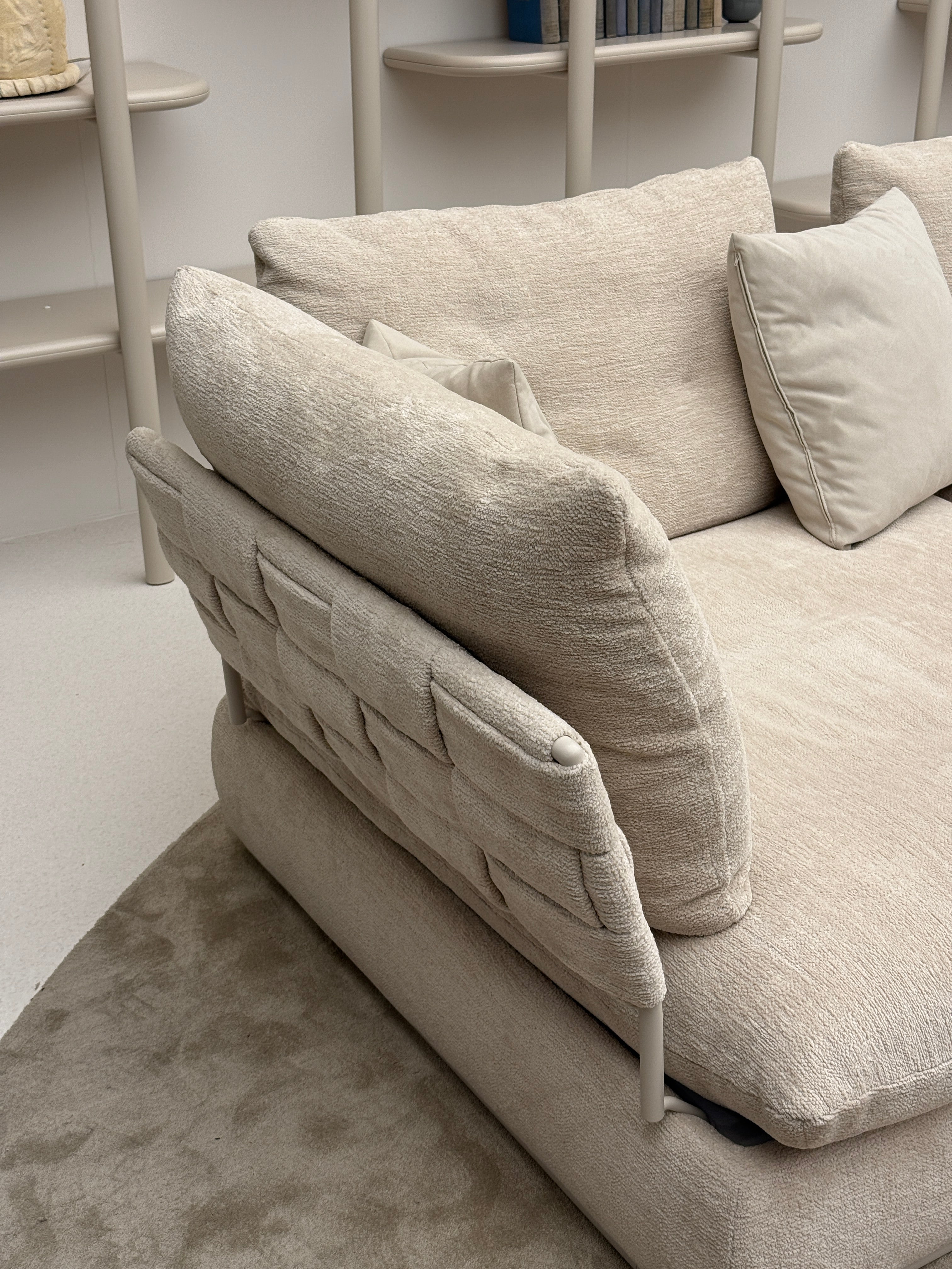 Materialer og utførelse: Rammen er laget i tre og polstret med polyuretanskum (30IP), trukket med velfodera og polyesterfiber. Sitteputene har differensiert skum (40IP og memory foam) og er dekket med en vattert madrass i 100 % polyester med bomullstrekk. Ryggputene er fylt med 100 % polyesterfiber i inndelte rom for ekstra komfort. Sylinderformet og kvadratisk armlene er henholdsvis fylt med skum eller silikonisert mikrofiber. Ben i lakkert stålrør, høyde 3 cm. Sidebordene er i finért kryssfiner med skrå kant og festes til basen med lakkert metallplate og beslag.
