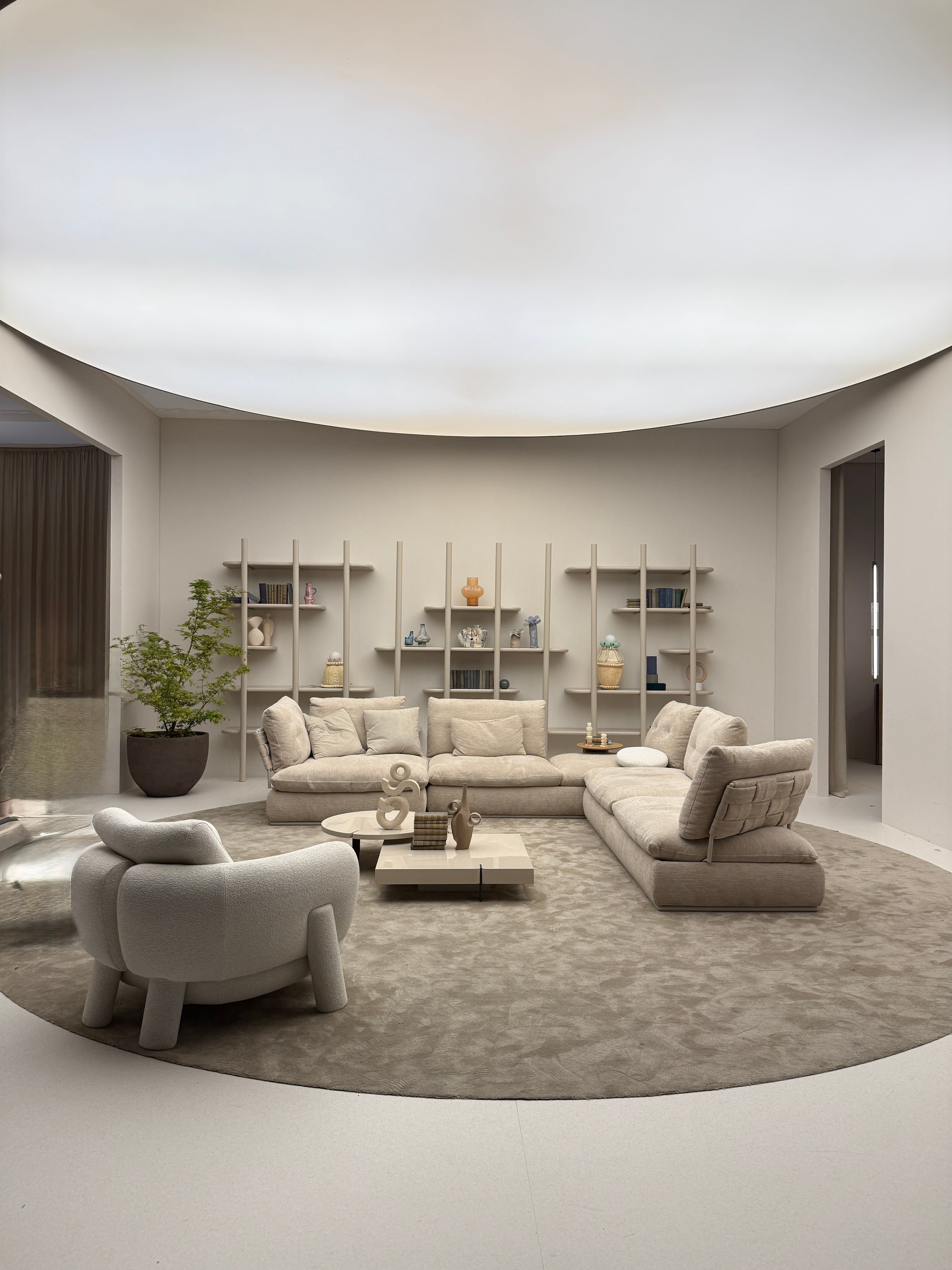 Land er inspirert av ønsket om å gjenerobre gulvet og skape rom som gir en følelse av trygghet og velkomst. Designet preges av en polstret base som hviler på en slank metallramme, med bakpaneler som kombinerer struktur og tekstil med et markant, skreddersydd uttrykk.