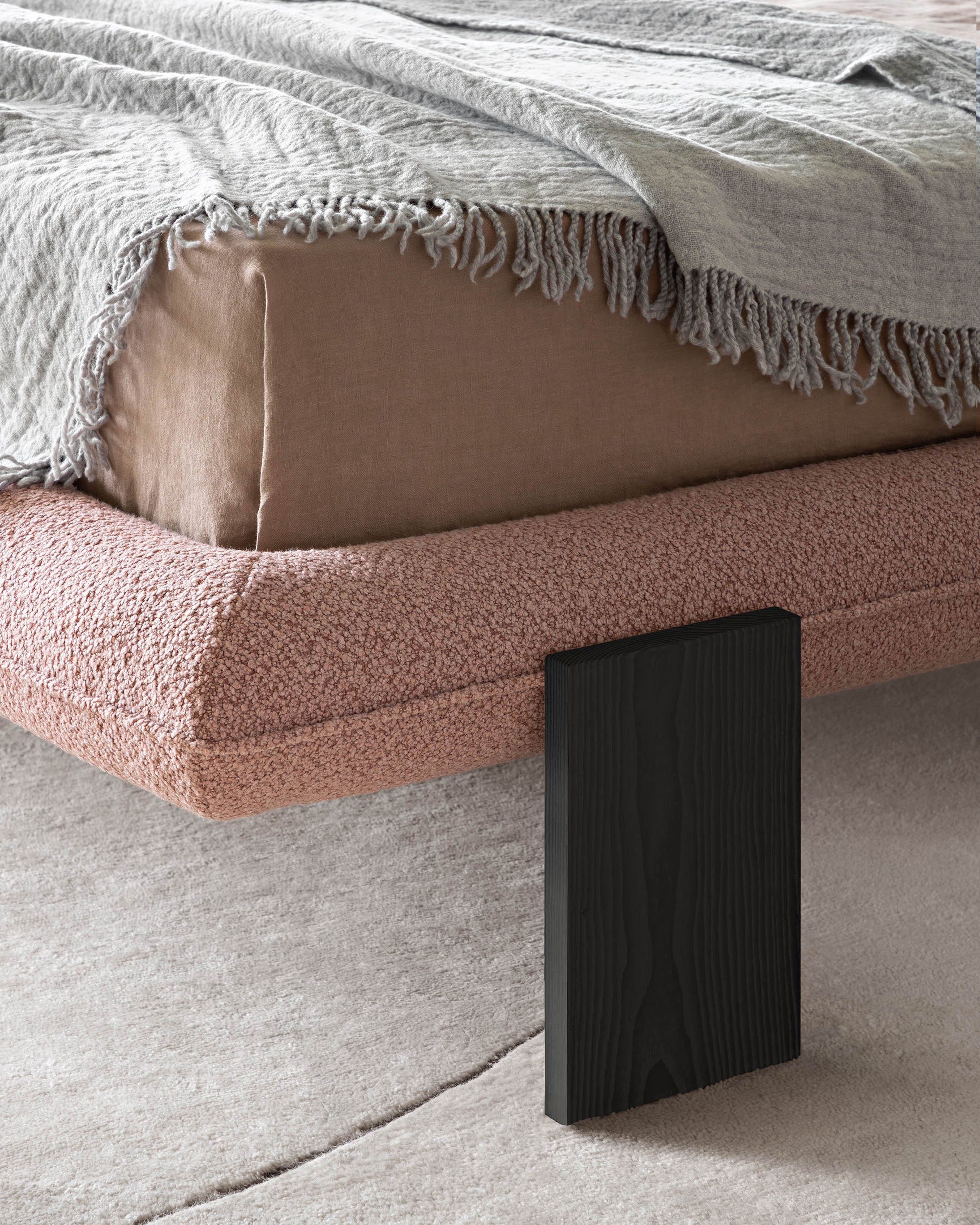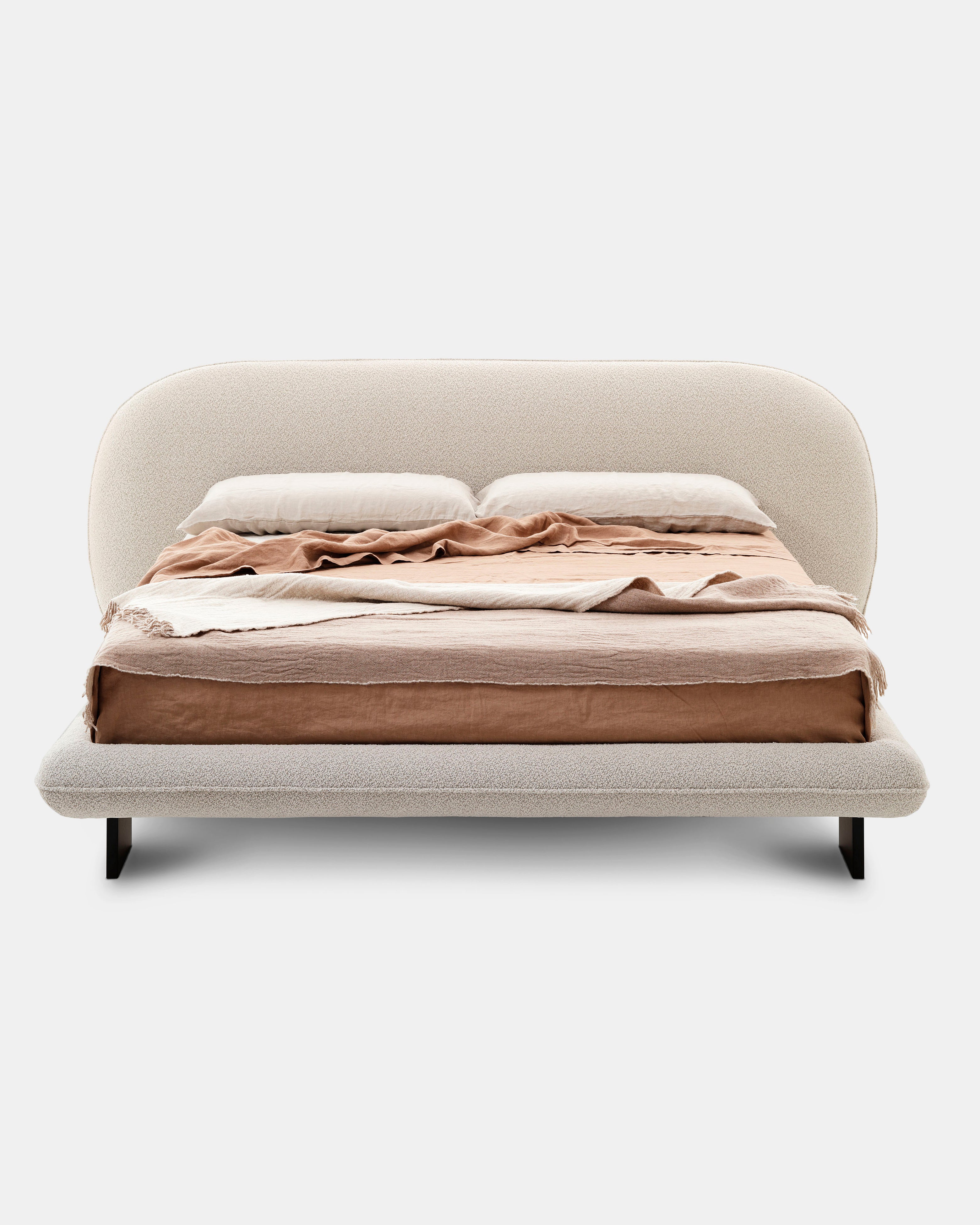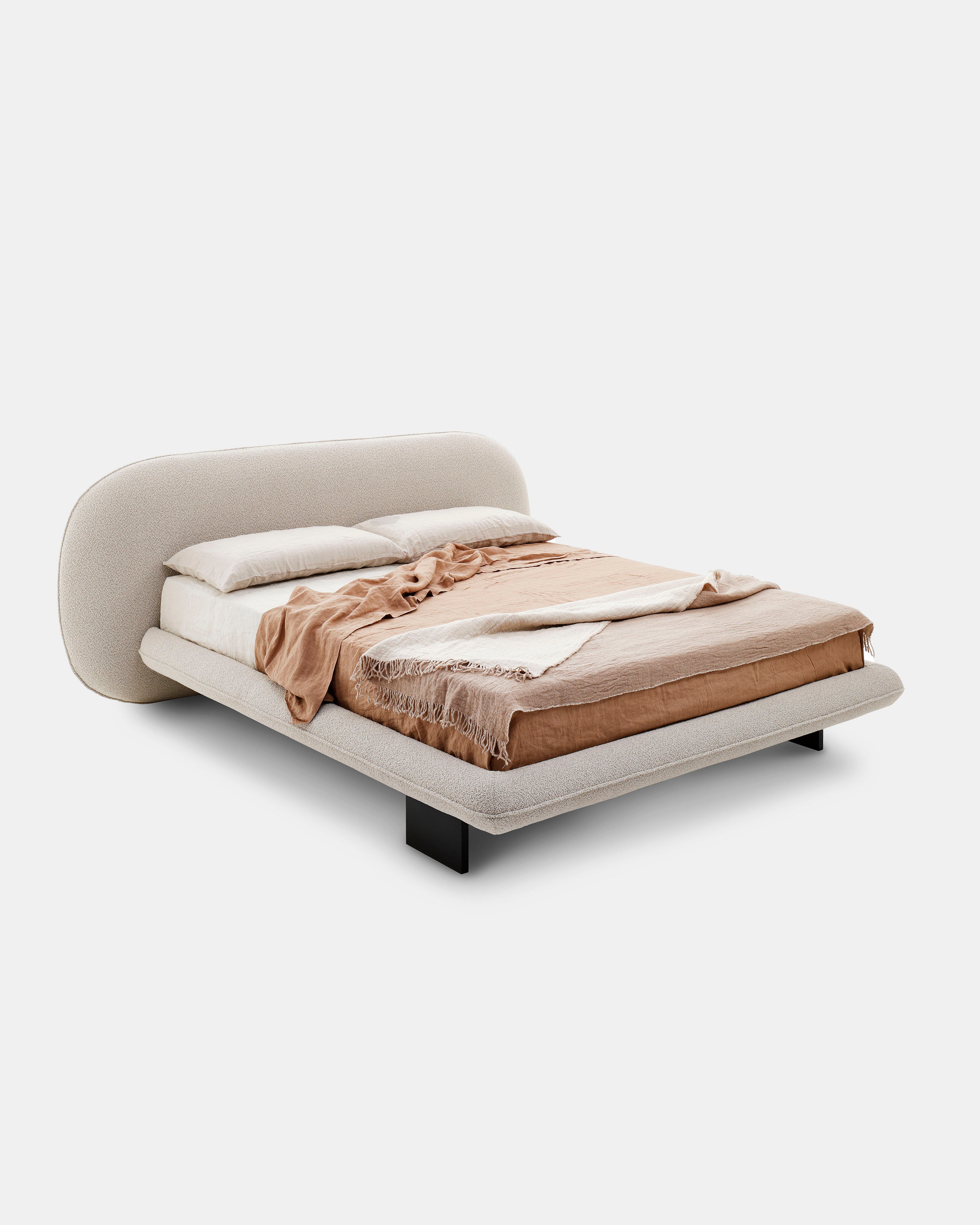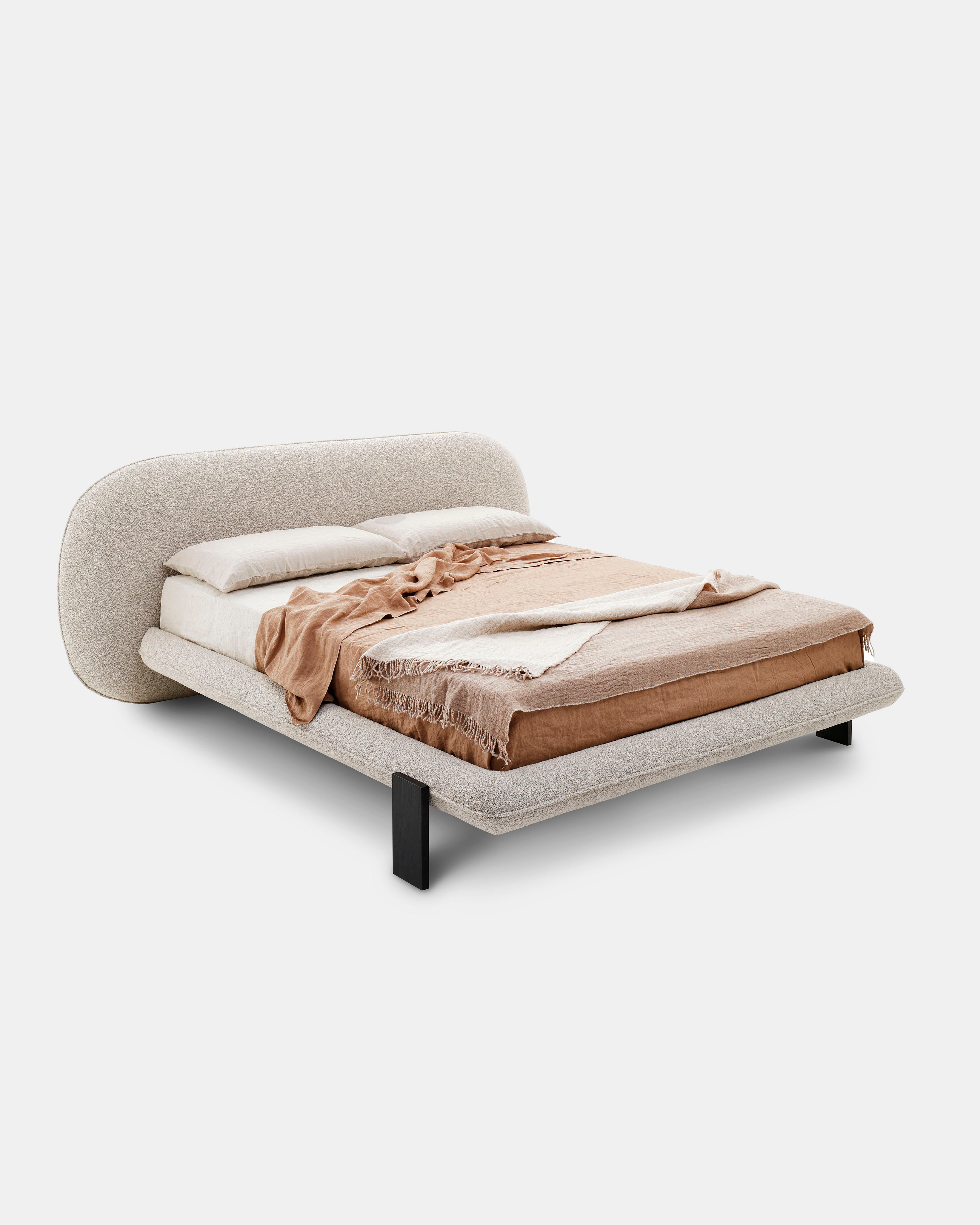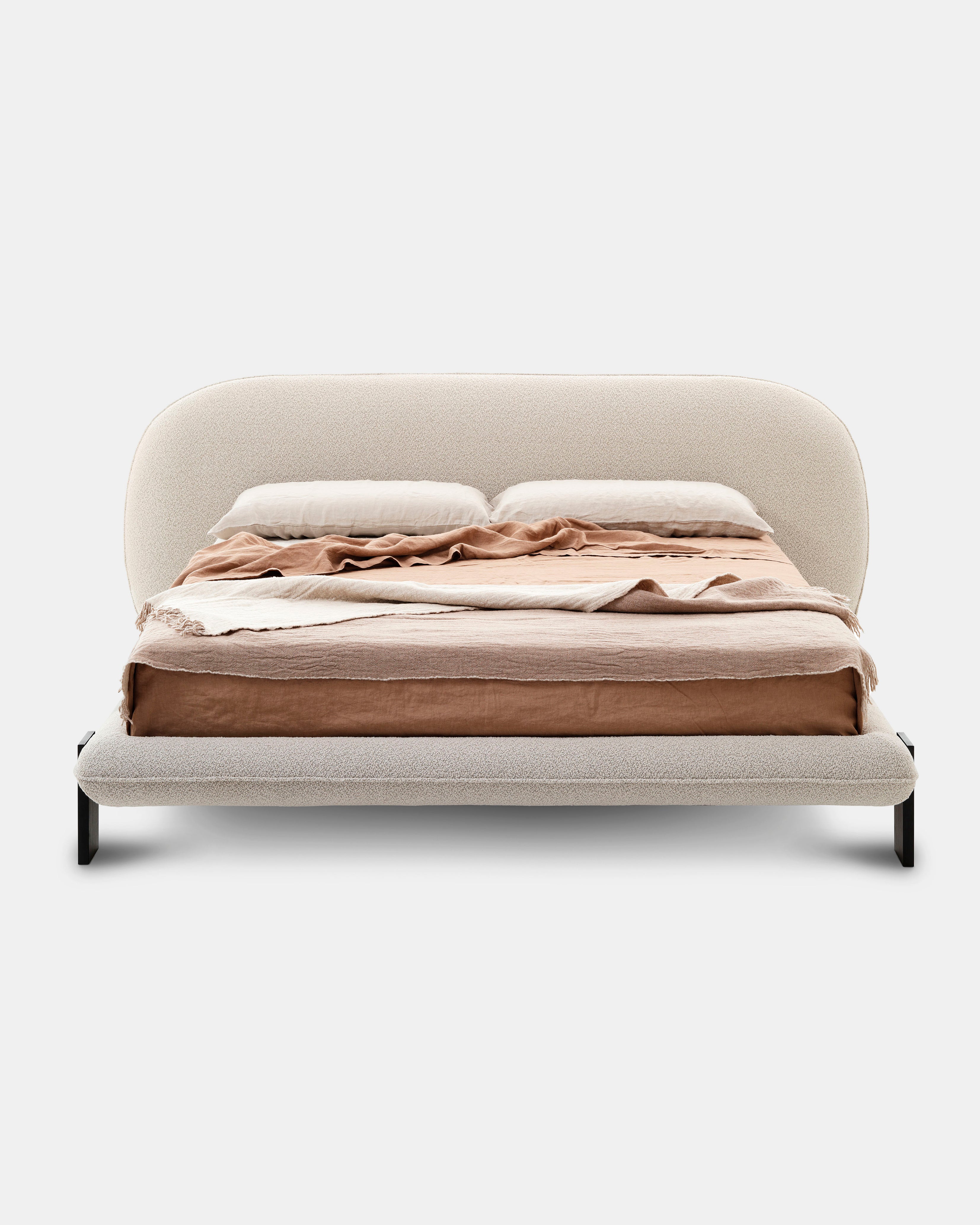 Vi elsker denne nye sengen designet av Alain Gilles, som på en harmonisk måte forener en skulpturell arkitektur med myke kontraster. Et særegent trekk er at bena kan plasseres enten vertikalt utenfor rammen eller horisontalt under den.