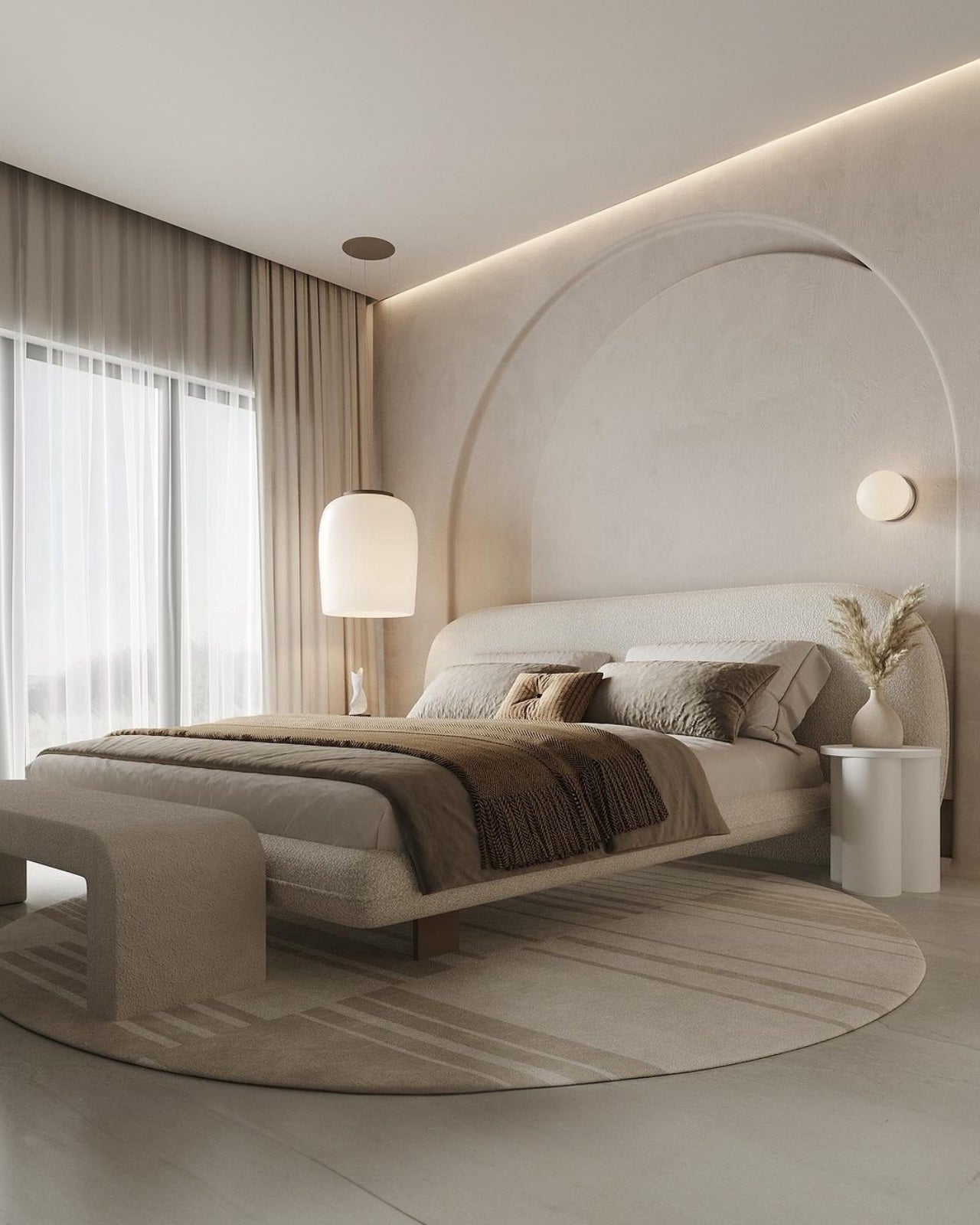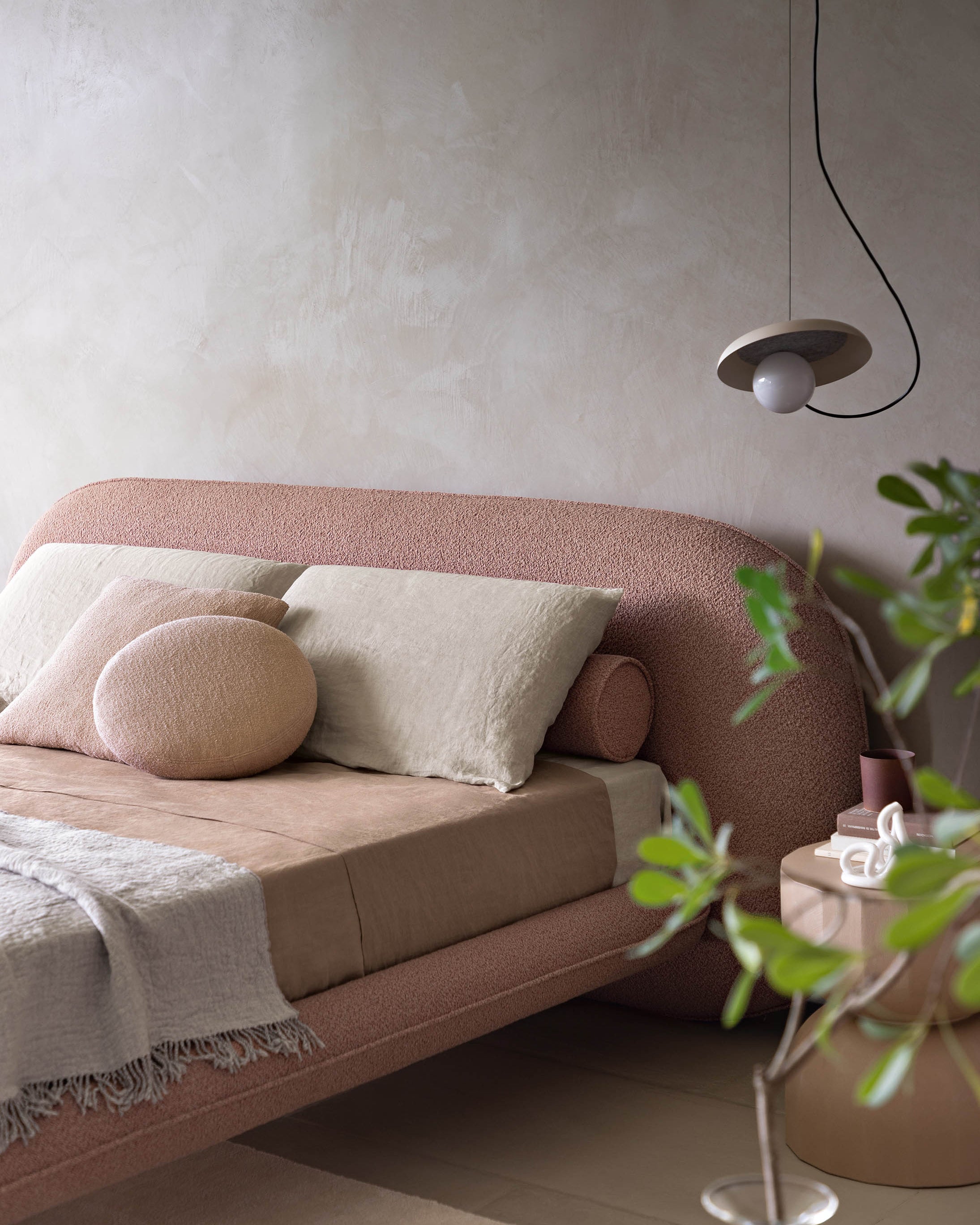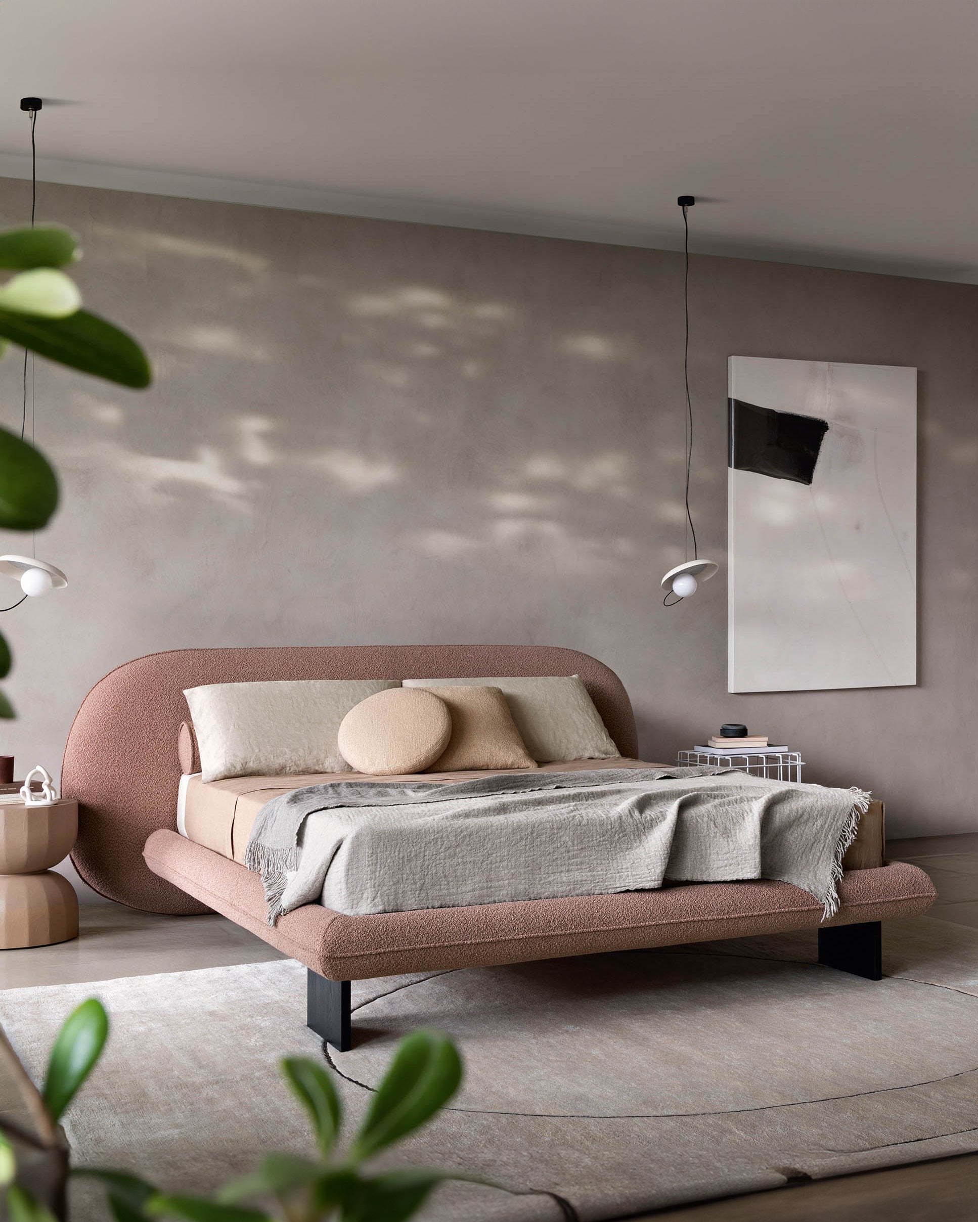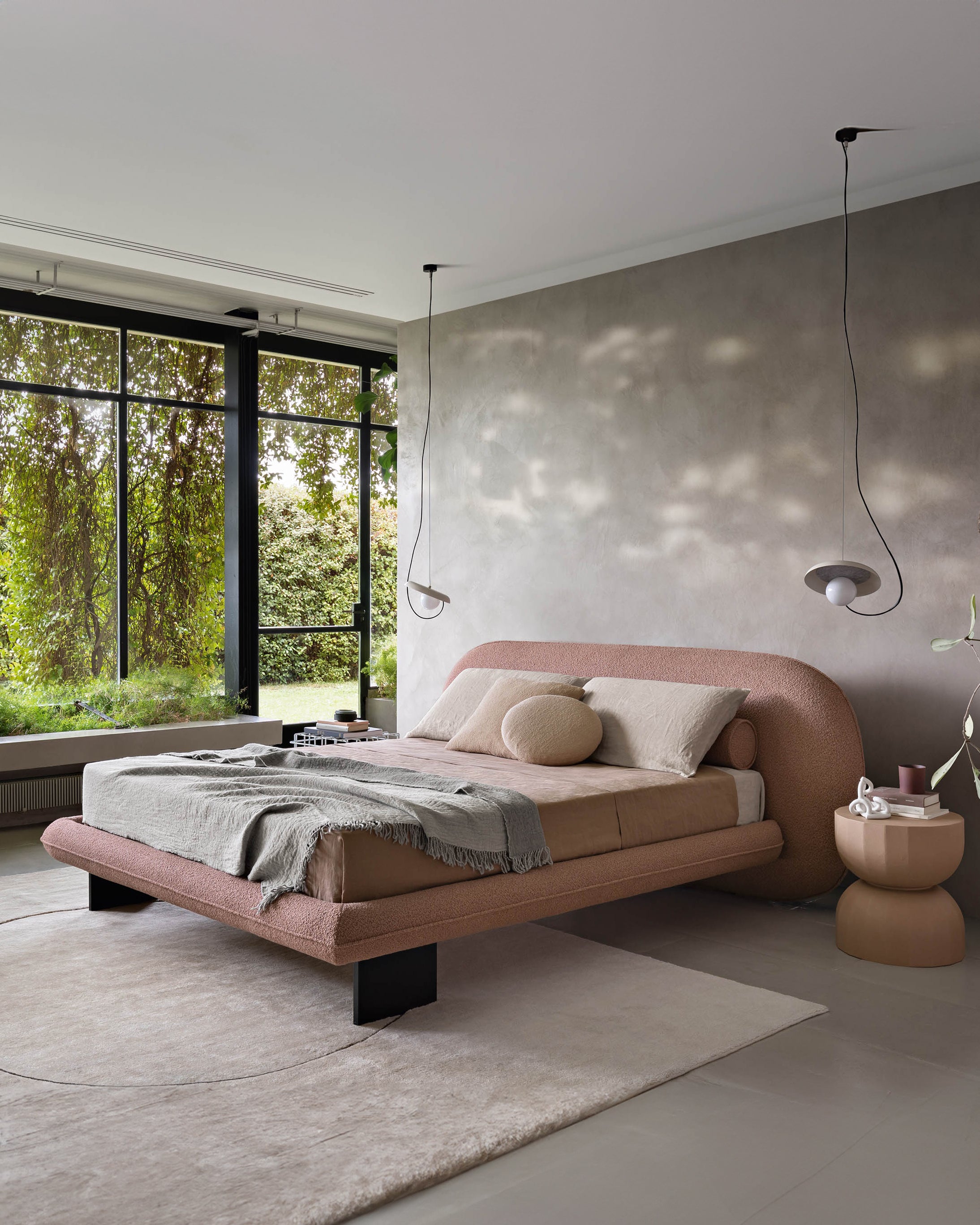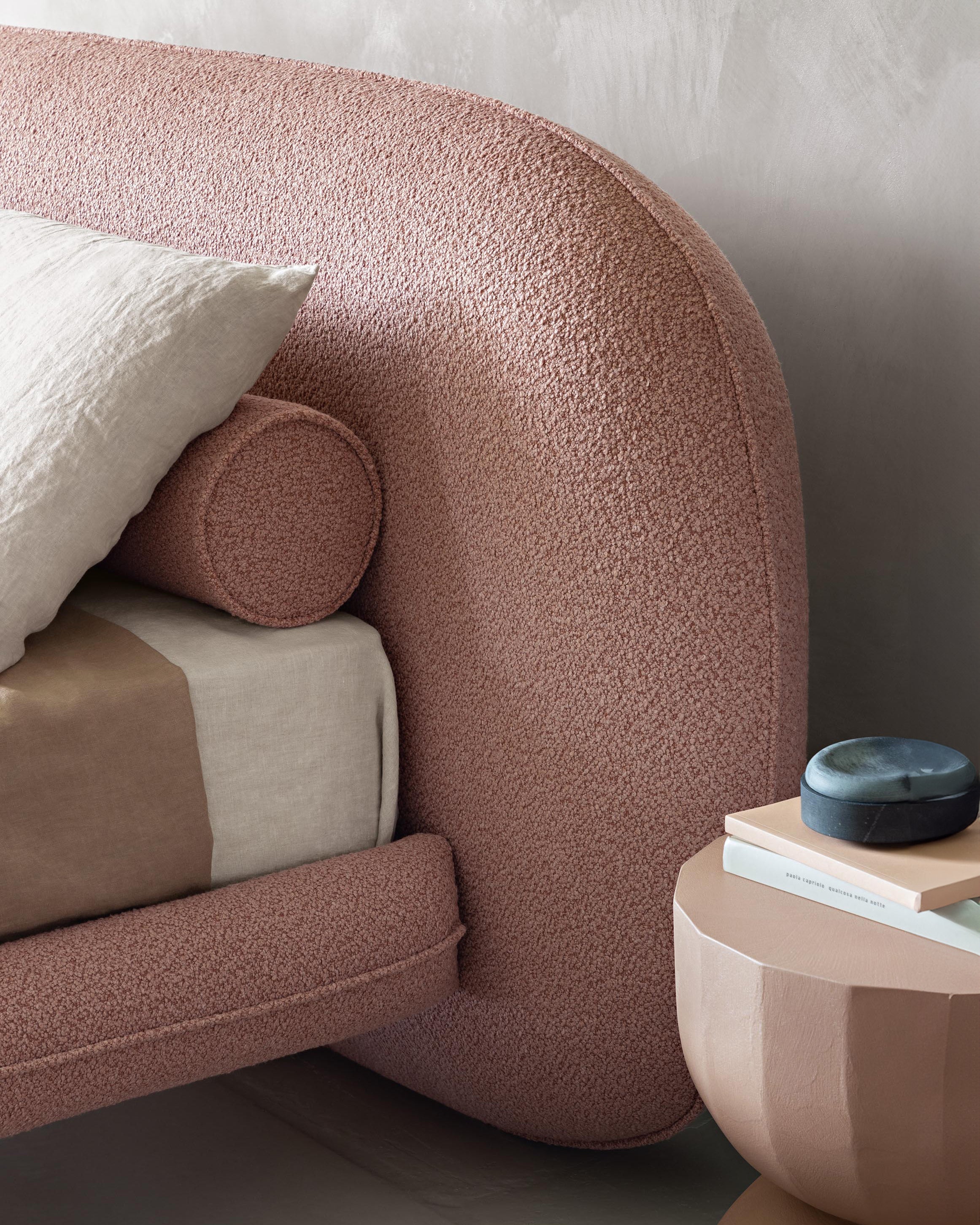 Vi elsker denne nye sengen designet av Alain Gilles, som på en harmonisk måte forener en skulpturell arkitektur med myke kontraster. Et særegent trekk er at bena kan plasseres enten vertikalt utenfor rammen eller horisontalt under den.