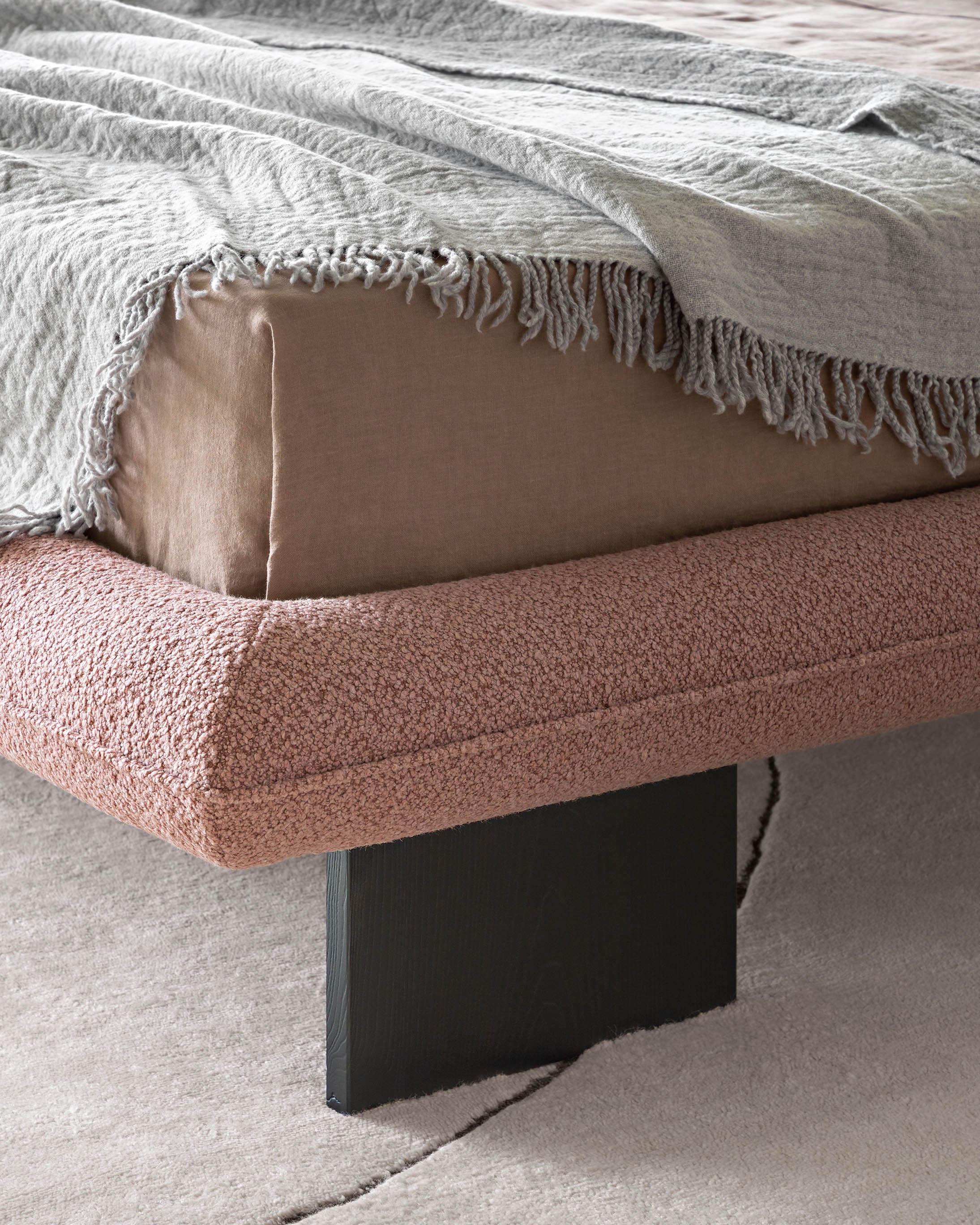 Sengens trekk er helt avtagbart, og langs kanten av sengegavlen og rammen fremheves sømmene med dekorative rør.