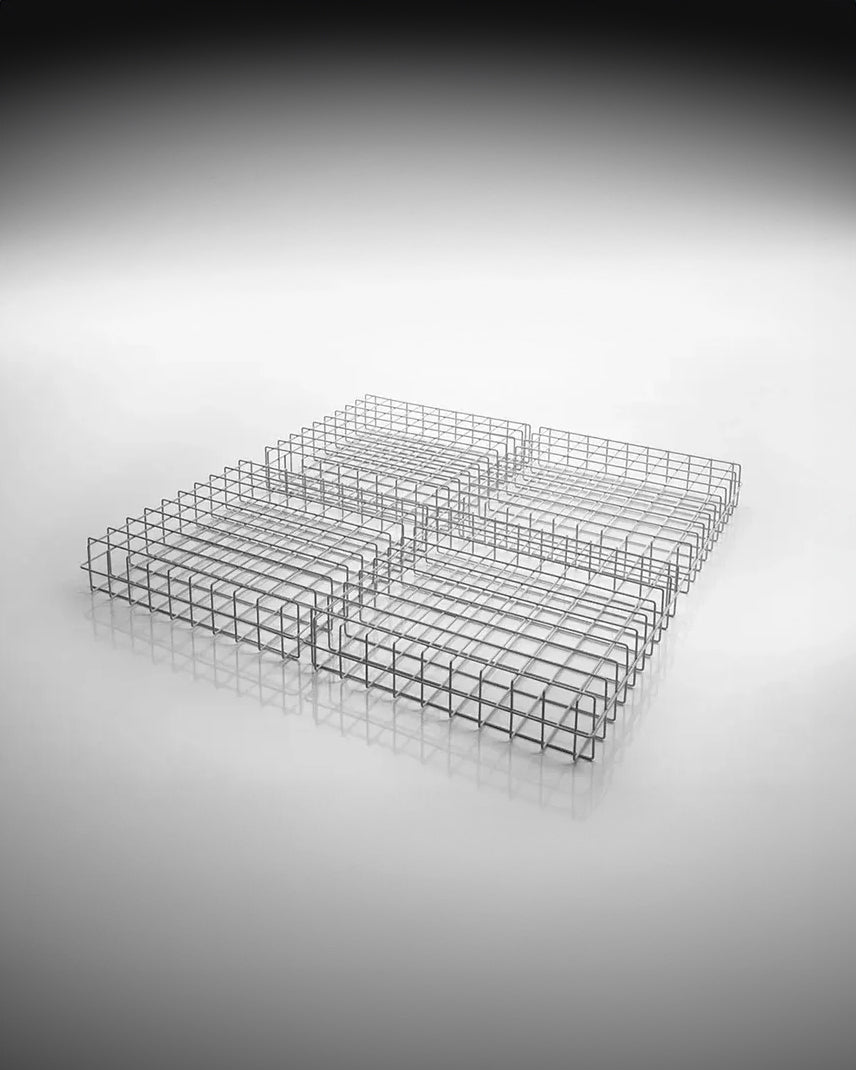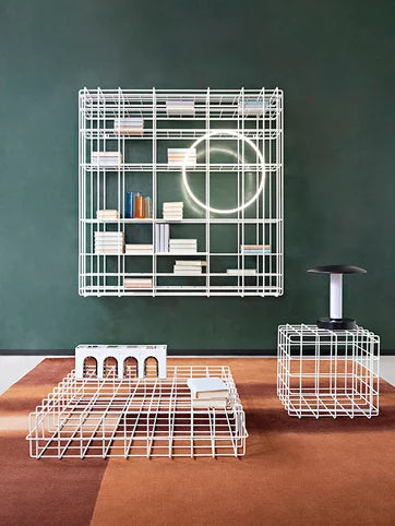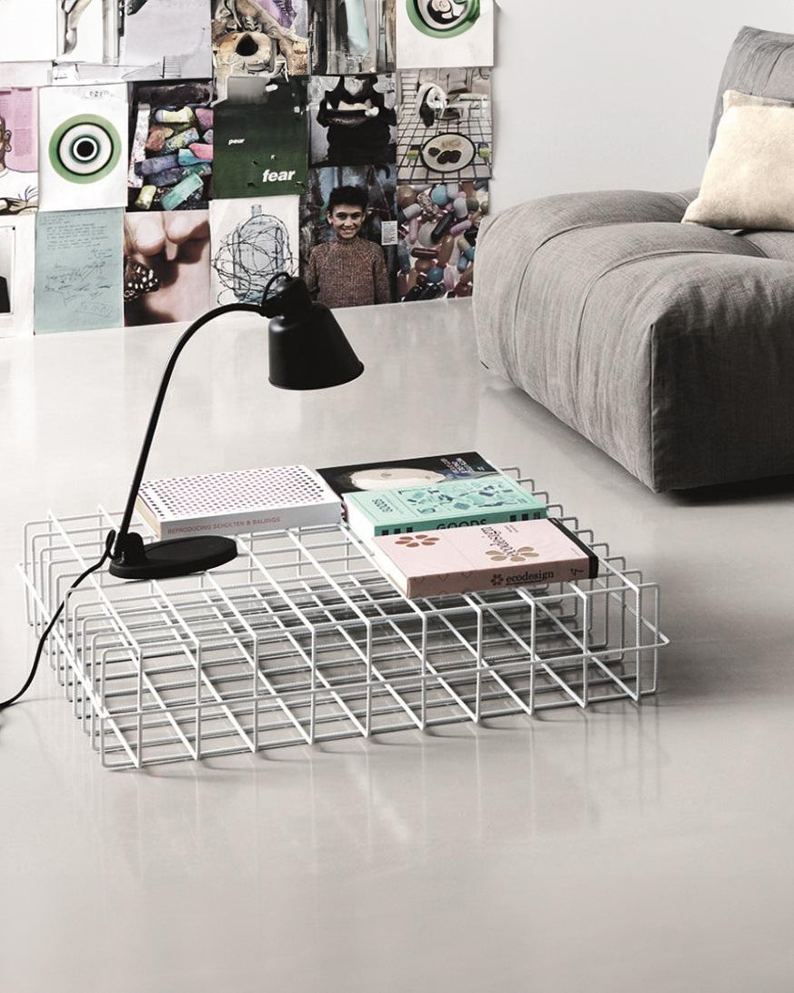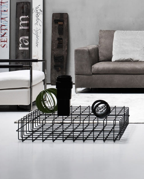 Leyva-bordet er laget av malt jernstang sveiset inn i et gitter av ensartede firkanter. Sofistikert og lite påtrengende dekorerer Leyva stuen med et lett, moderne preg. Leyva-kolleksjonen inkluderer også en bokhylle med gitterverk med samme design, en ren og essensiell silhuett. Dens pilaktige minimale konturer fremkaller en luftig letthet. Perfekt for moderne omgivelser og en sømløs løsning for industrielle omgivelser, den kan også gi en uventet vri på mer klassisk innredning.