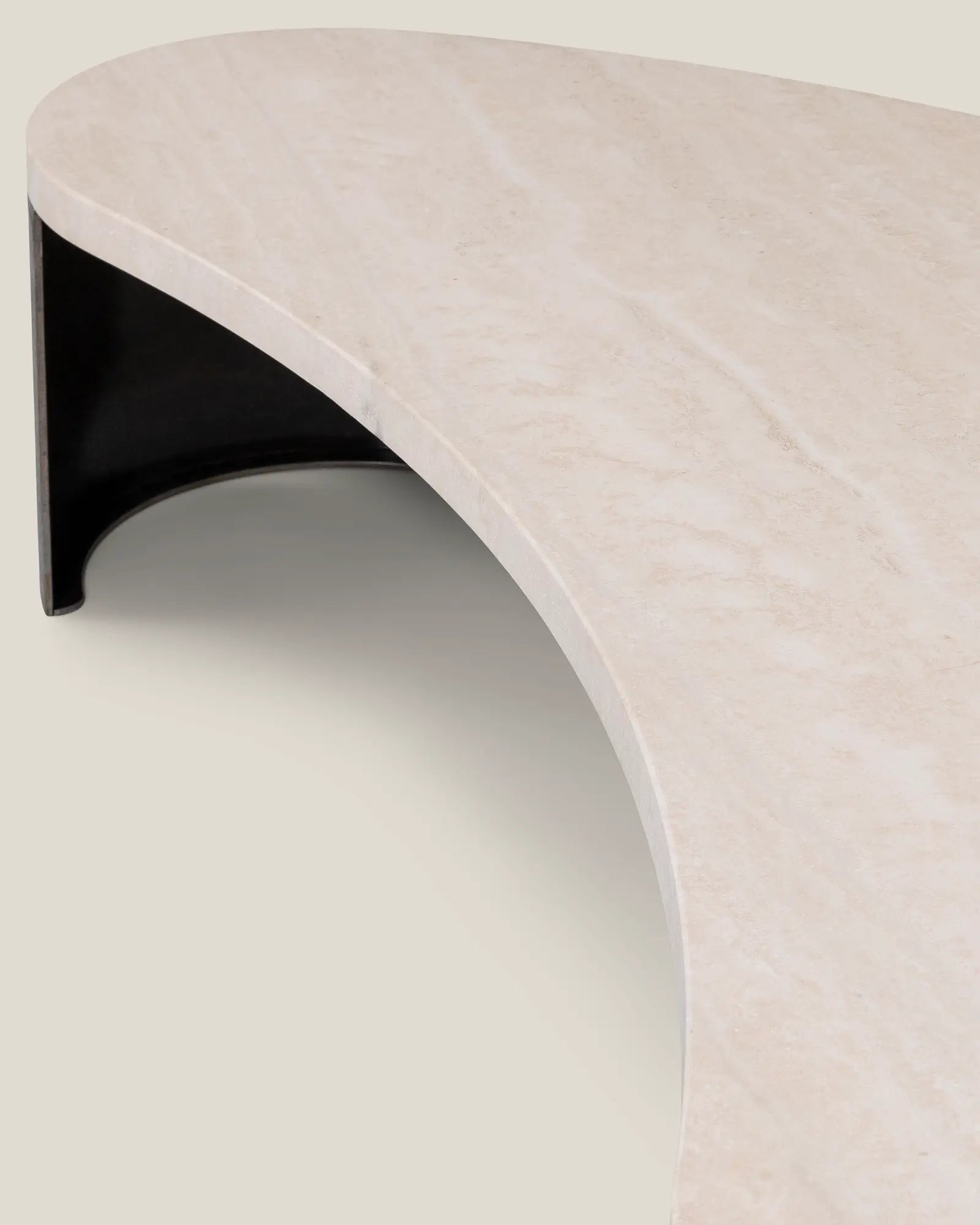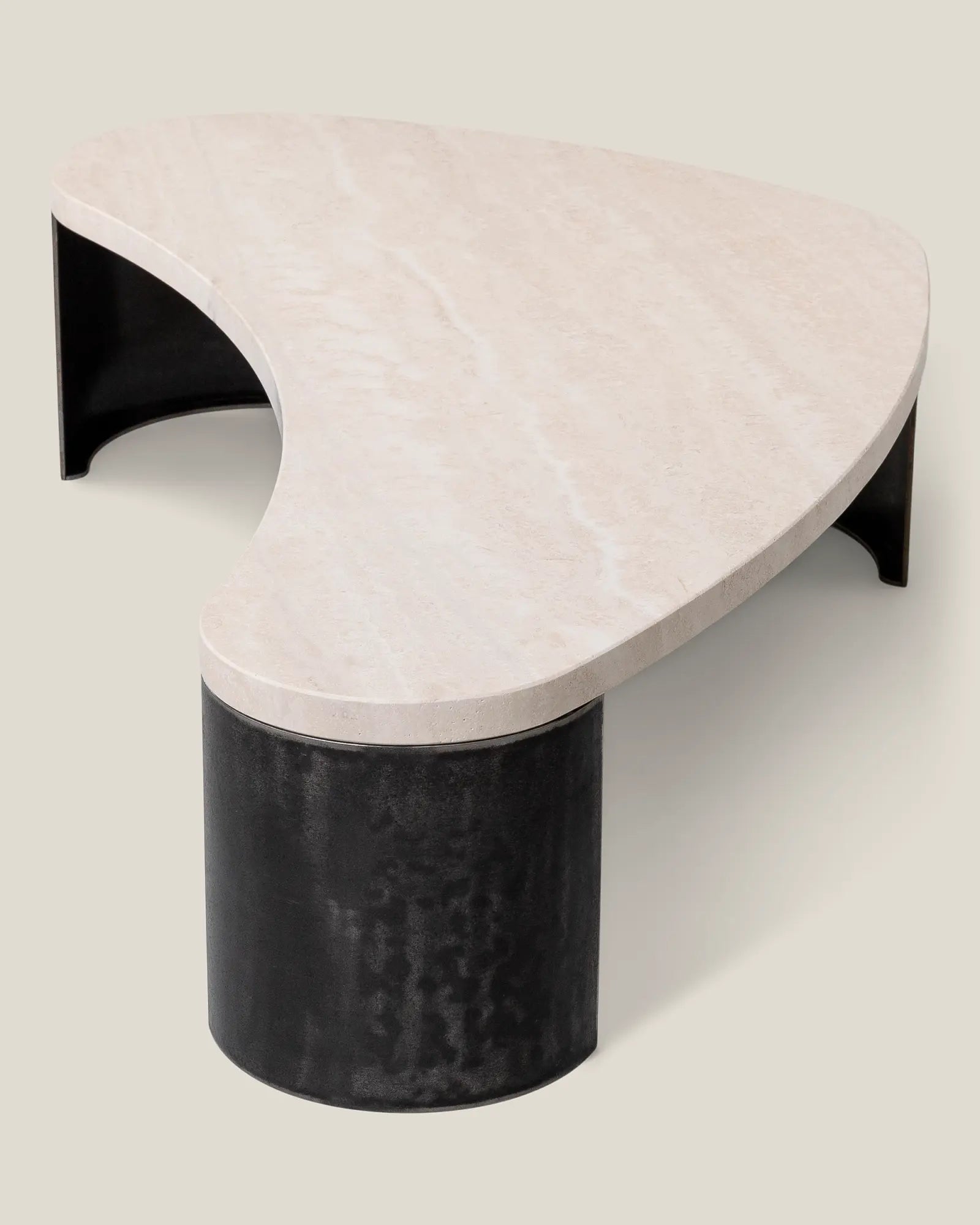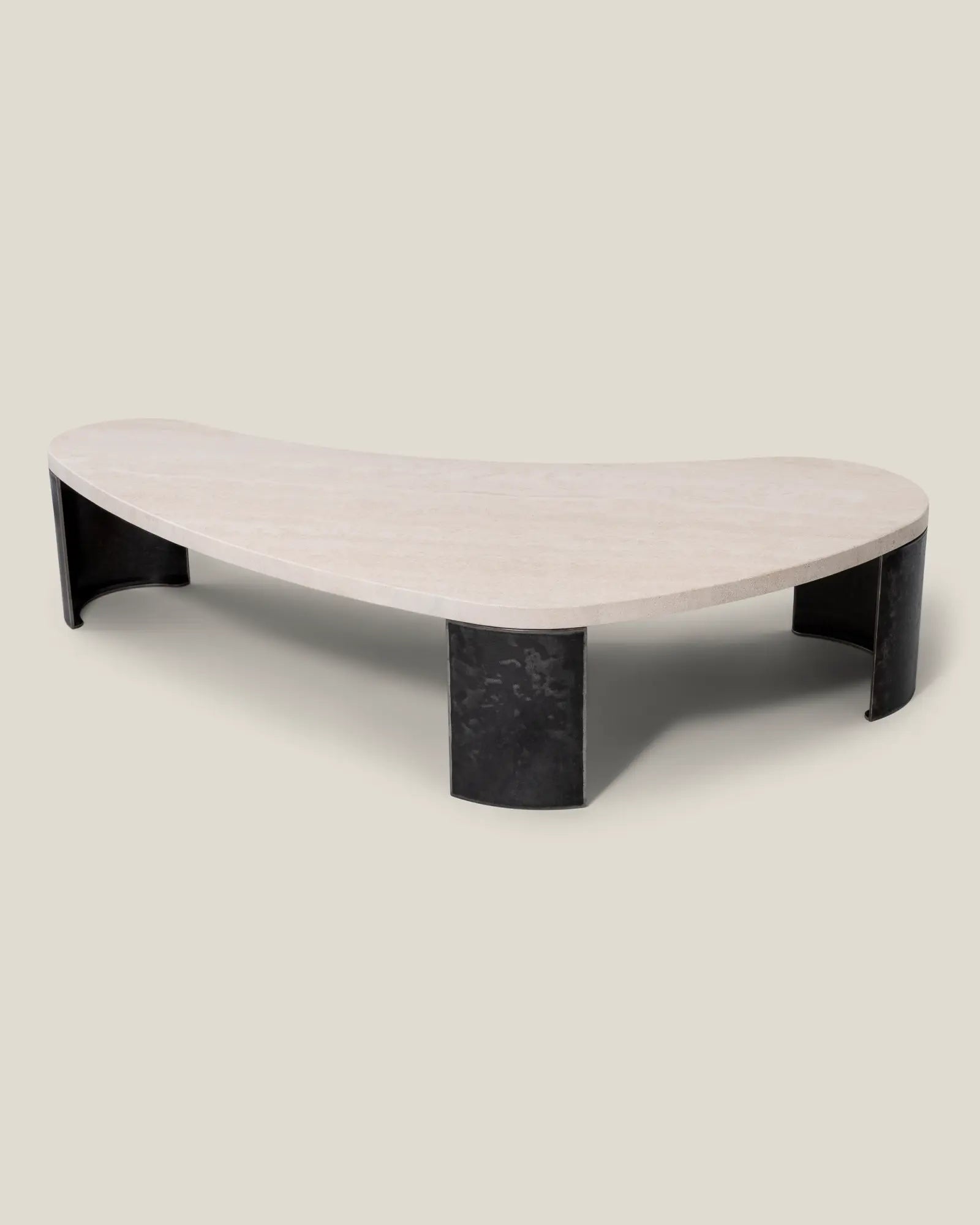 Dette salongbordet bærer preg av tre dedikasjoner: kreativitet, nytte og skjønnhet. Laget med italiensk travertin, støttet av råstål, og inspirert av tradisjonell landlig estetikk, fungerer dette organisk formede bordet som et samlingspunkt i ethvert oppholdsrom. Et sofistikert og funksjonelt arvestykke ment å vare livet ut