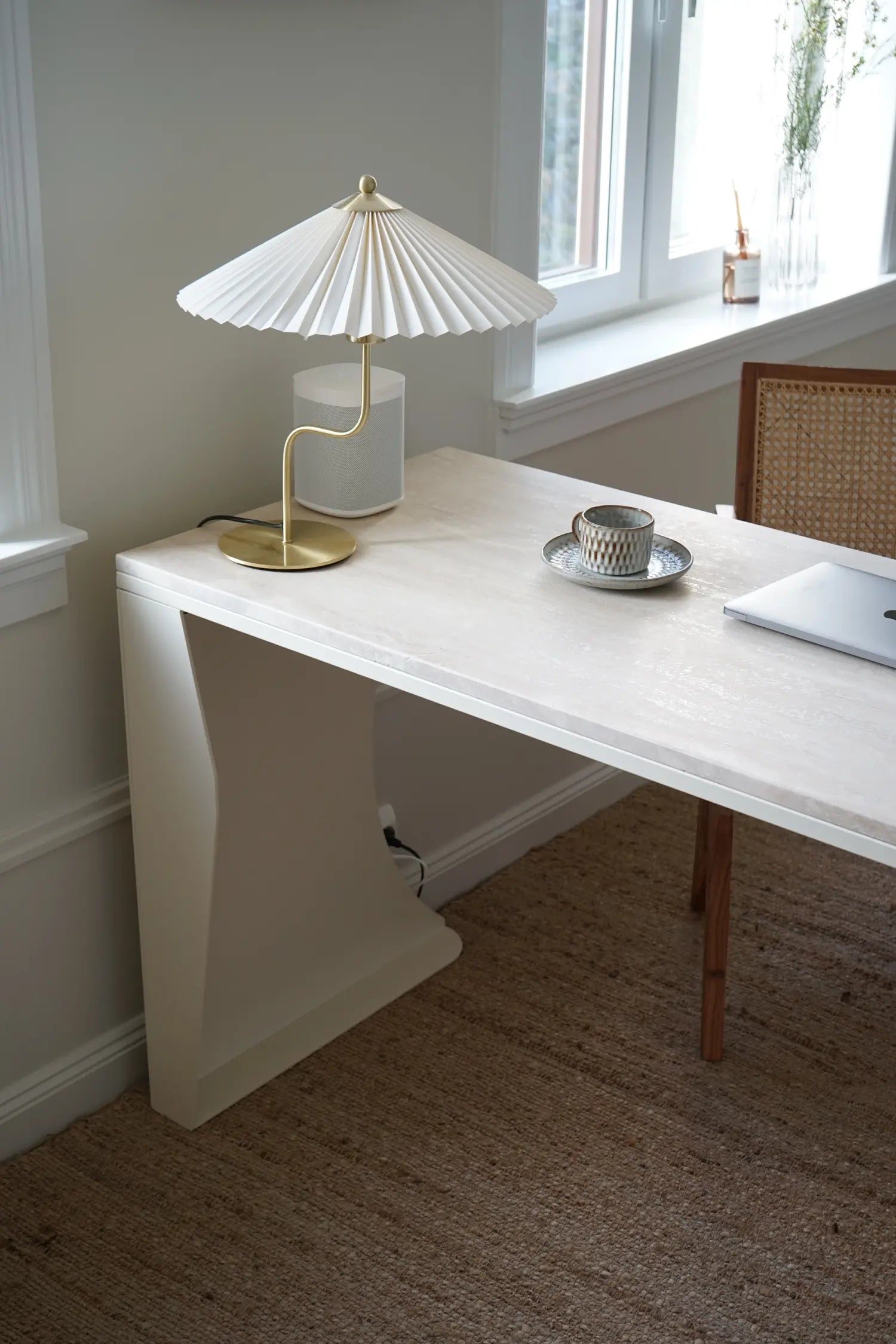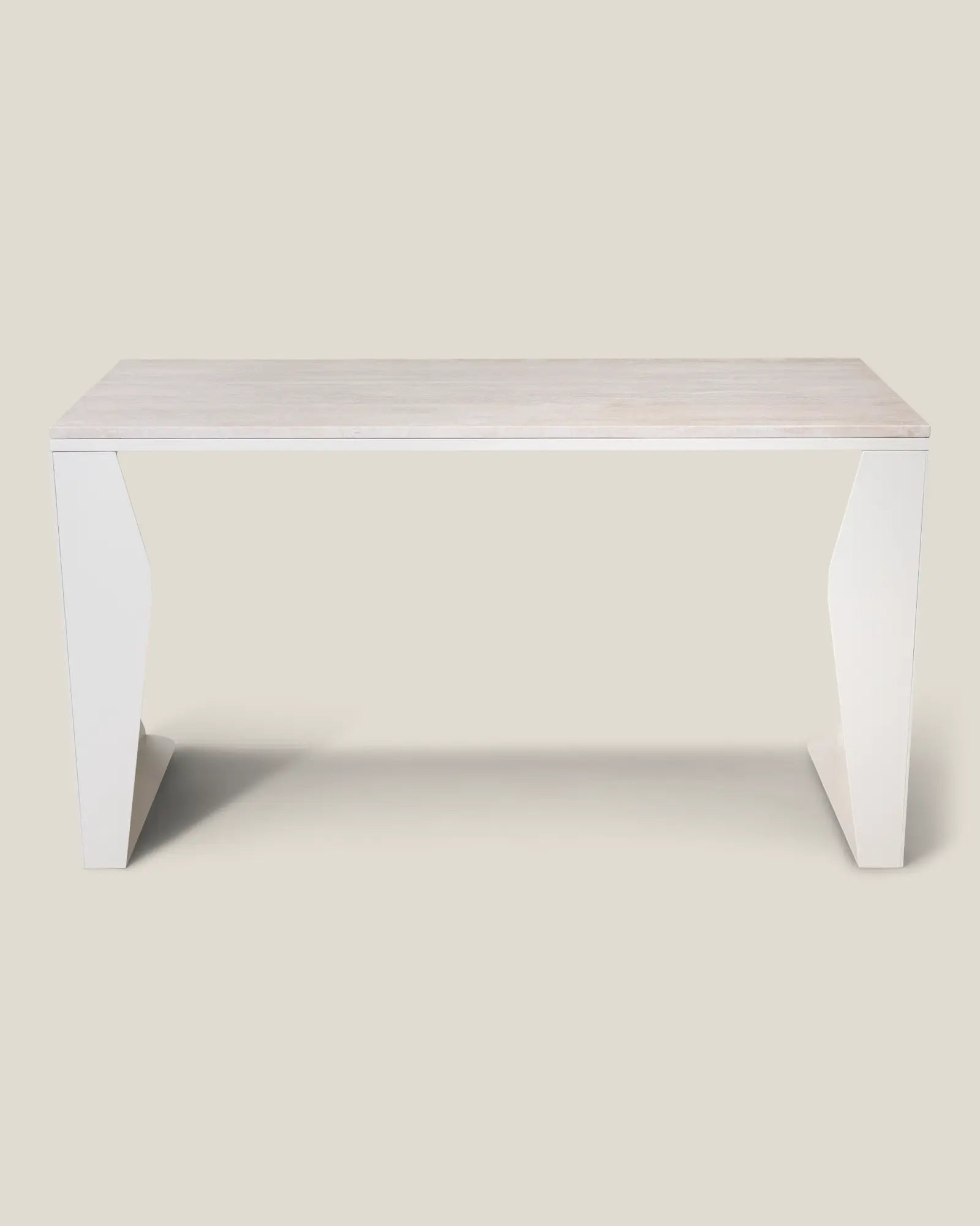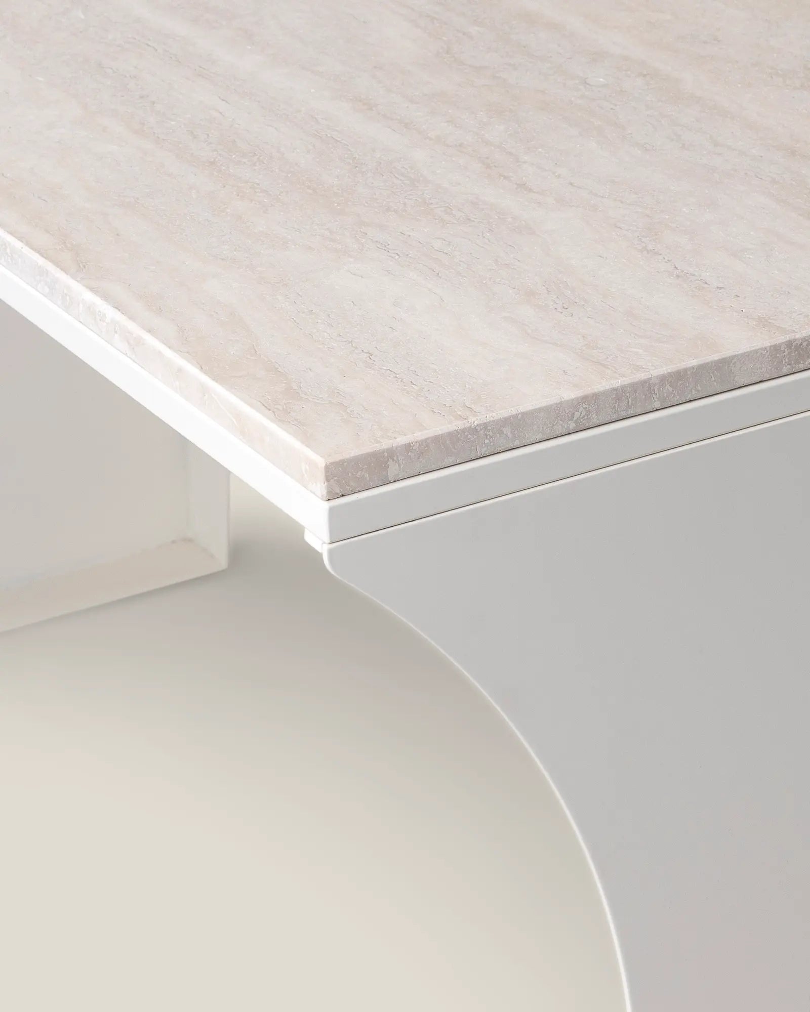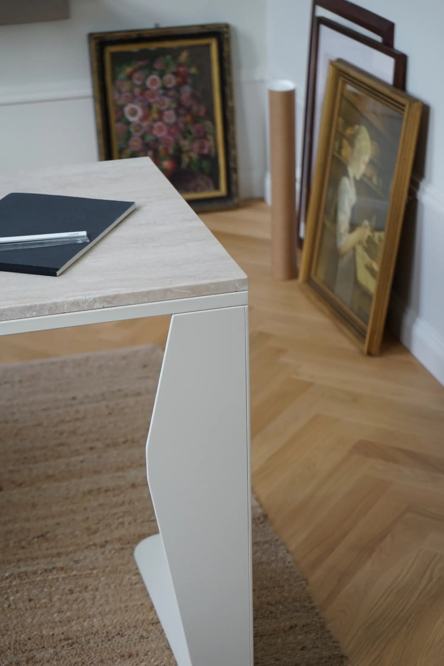 Et skrivebord laget for flyten av produktivitet, der dagene smelter sammen mens du forfølger ditt fjerne mål. En halvmåneformet ramme i laserskåret stål, akkompagnert av en polert italiensk travertinoverflate – dette skrivebordet er laget for inspirasjonen som følger med de sent på kvelden, som strekker seg inn i de tidlige morgenstrålene.