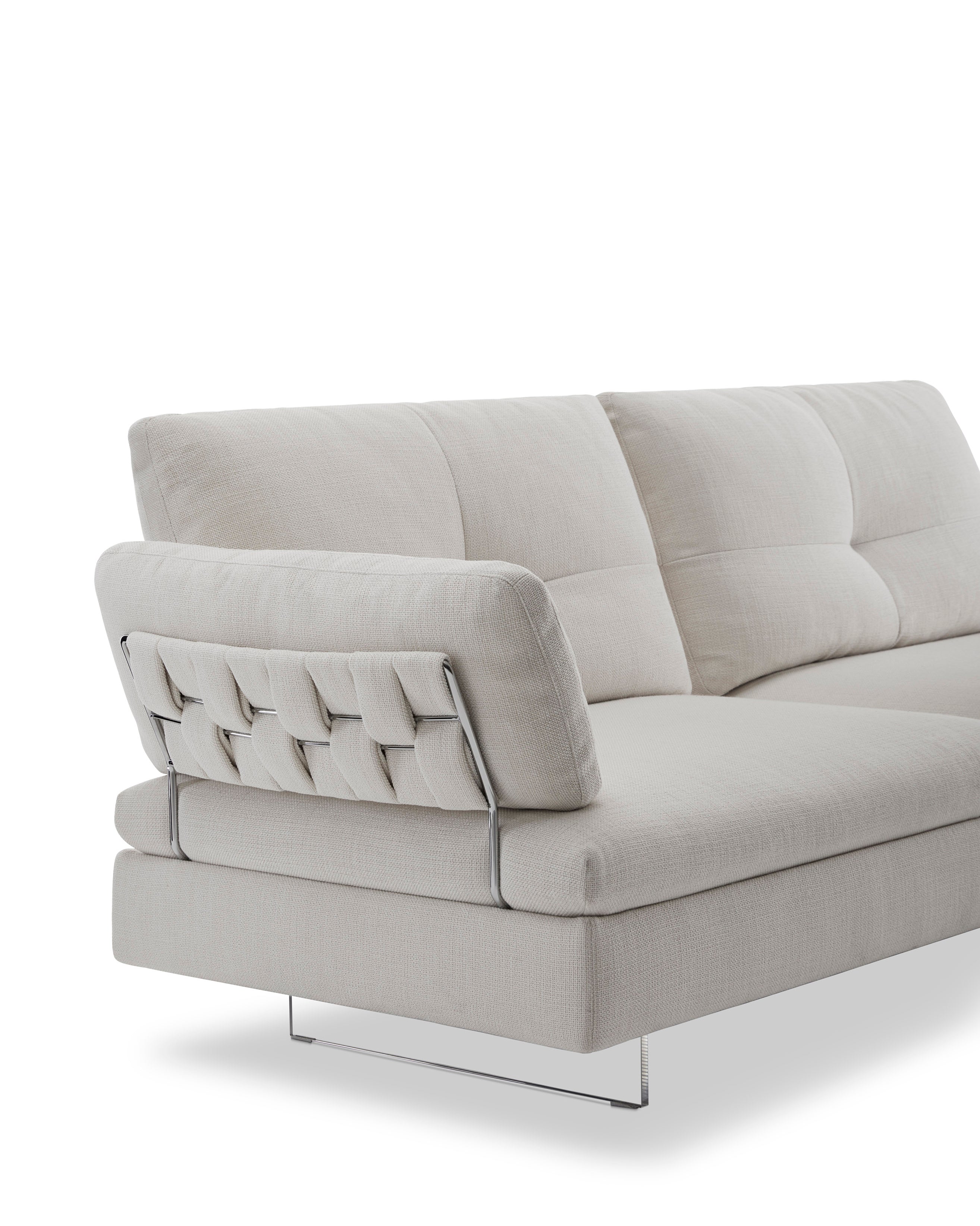 Struktur: Sofaen har en ramme i tre, polstret med 30IP skum, trukket med velfodera og bakside i polyesterfiber (150 gr/kvm). Rygg- og armlenestøtter er i metall med en blank krom- eller svart nikkelfinish, tilgjengelig med stofftrekk eller stoffbånd kombinert med presset 300 gr/kvm.