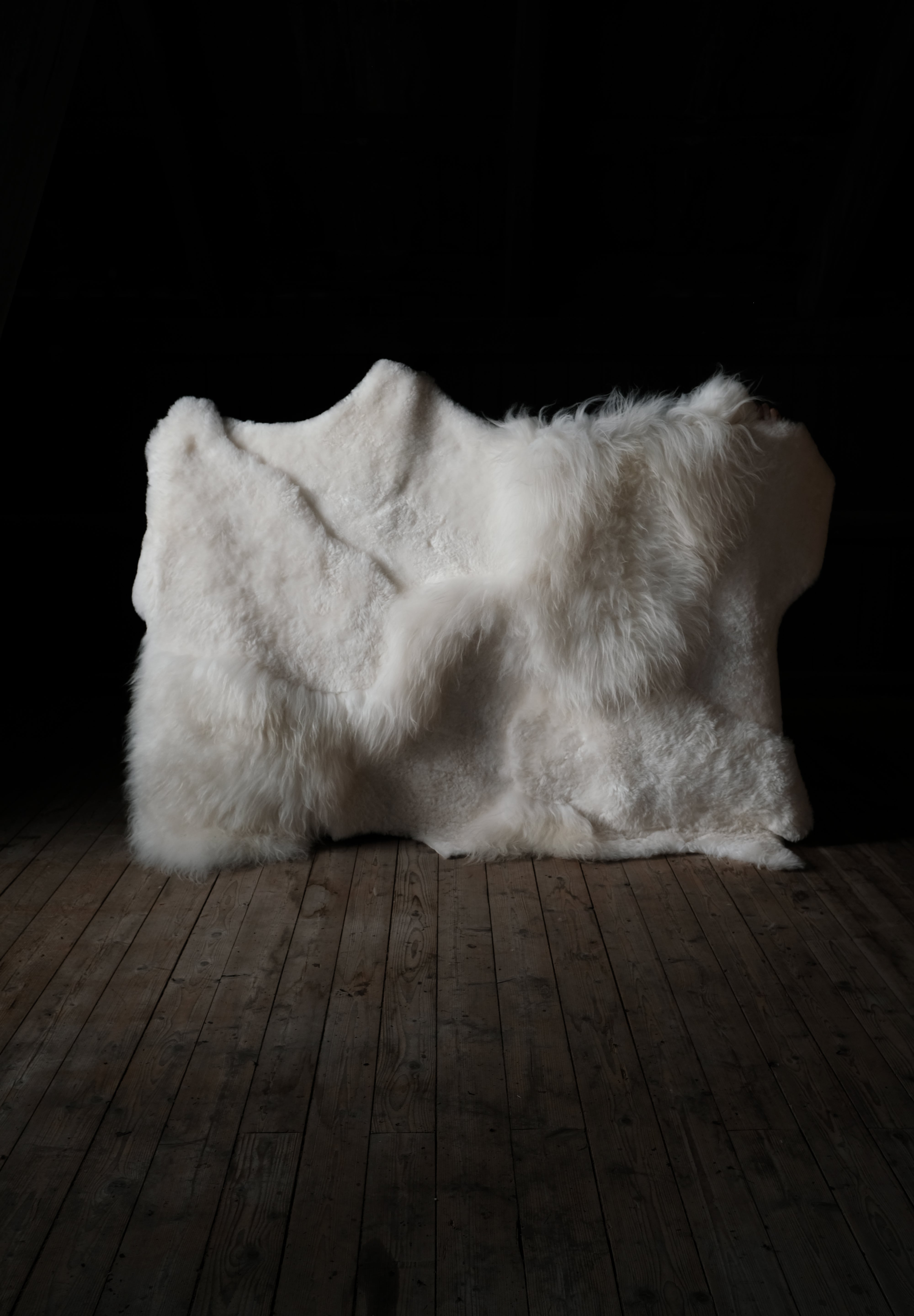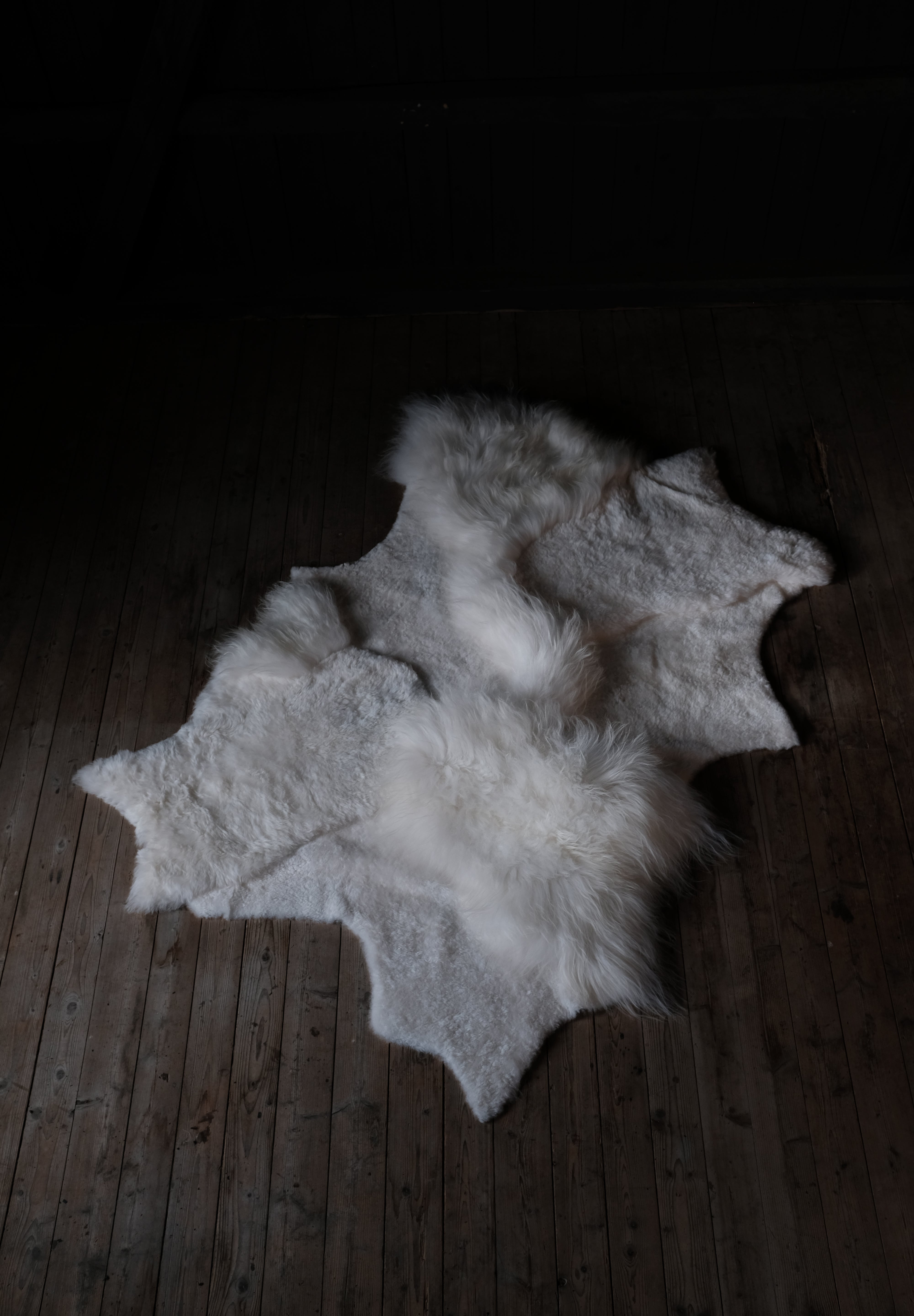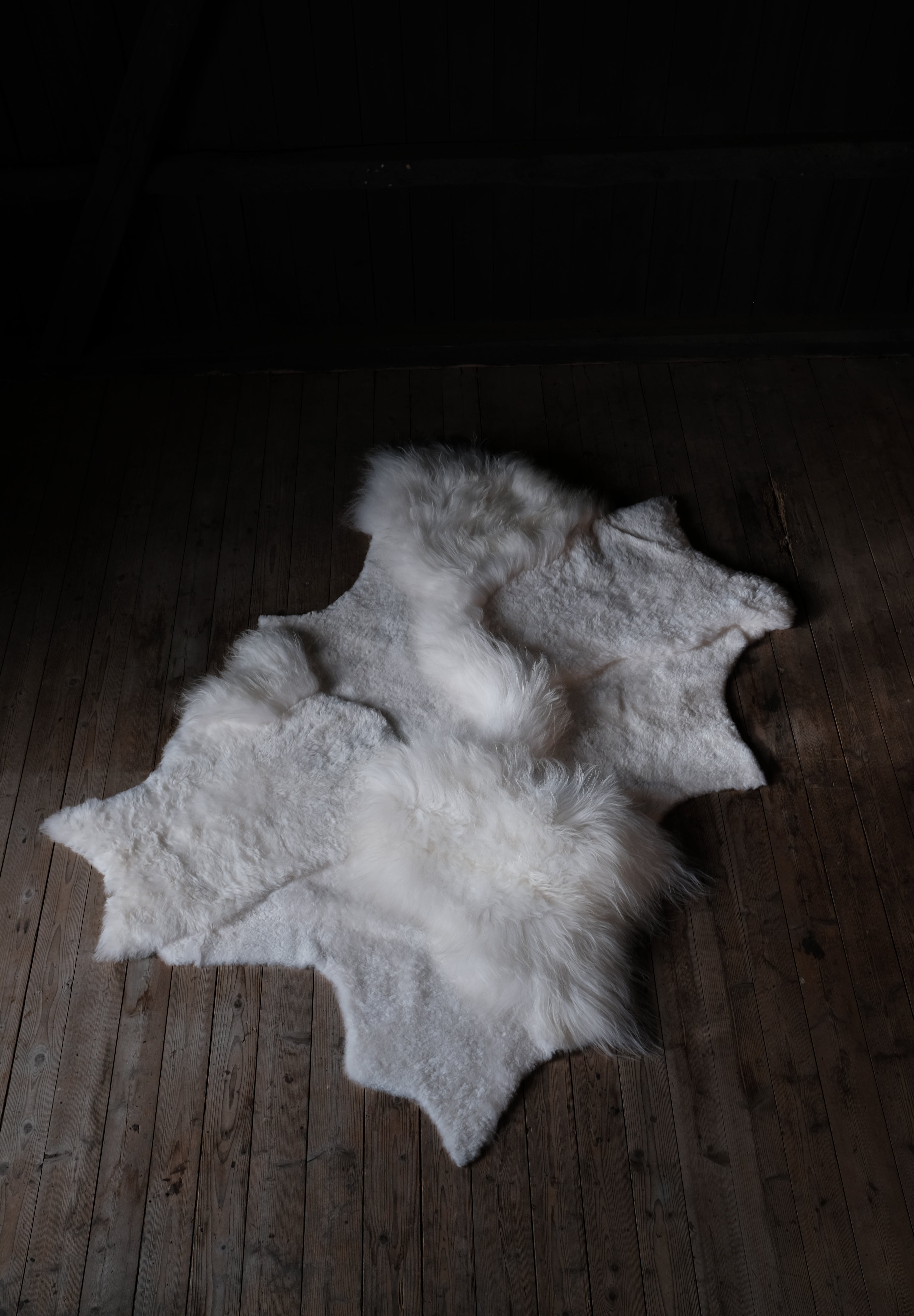 Et et unikt og utrolig vakkert teppe! Laget av ulike hvite saueskinn som er sydd sammen. Hvert teppe er forskjellig i utseende og er derfor helt unikt. Vakkert som et teppe, men det er også et skikkelig blikkfang som et veggteppe eller art piece på veggen!