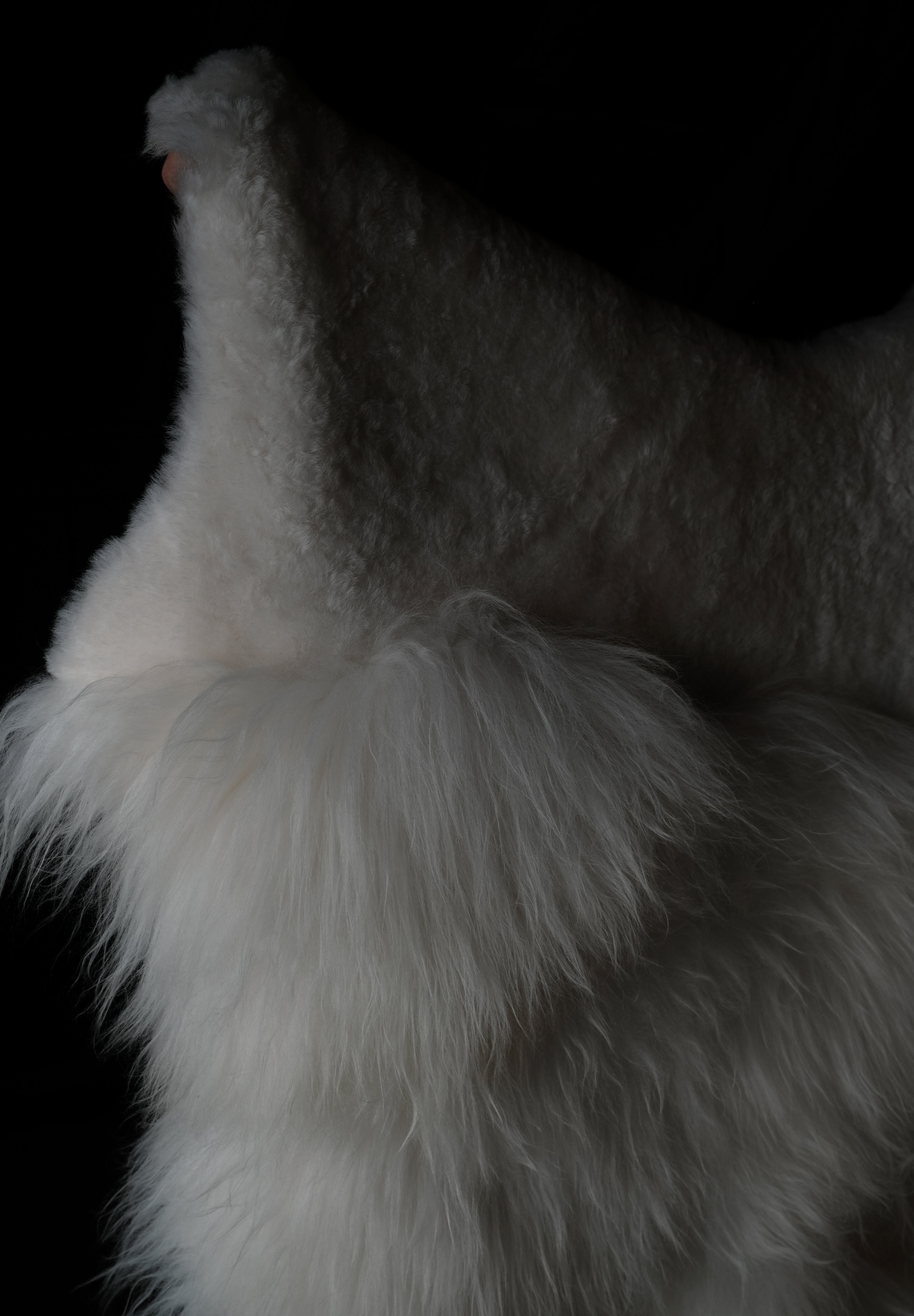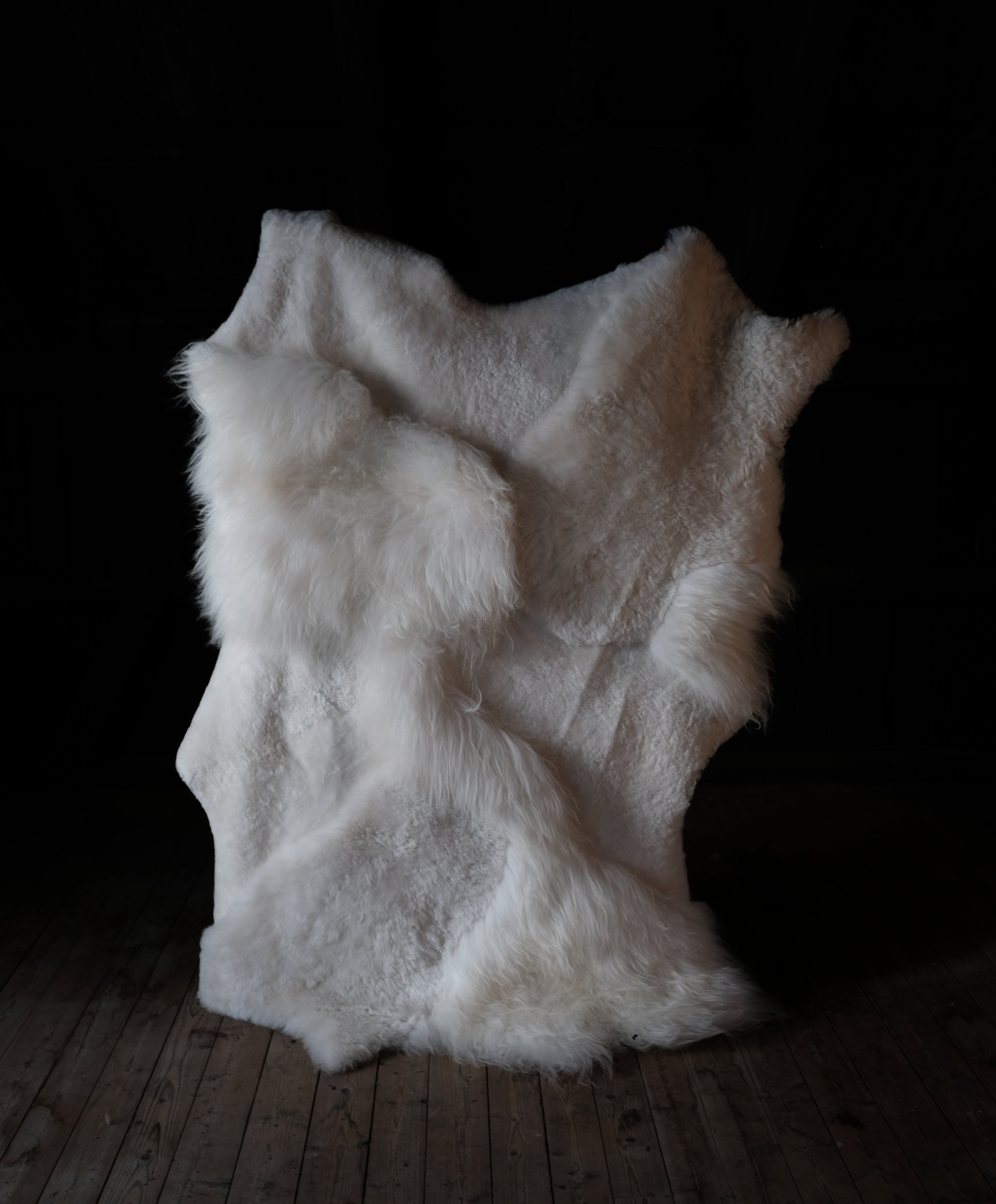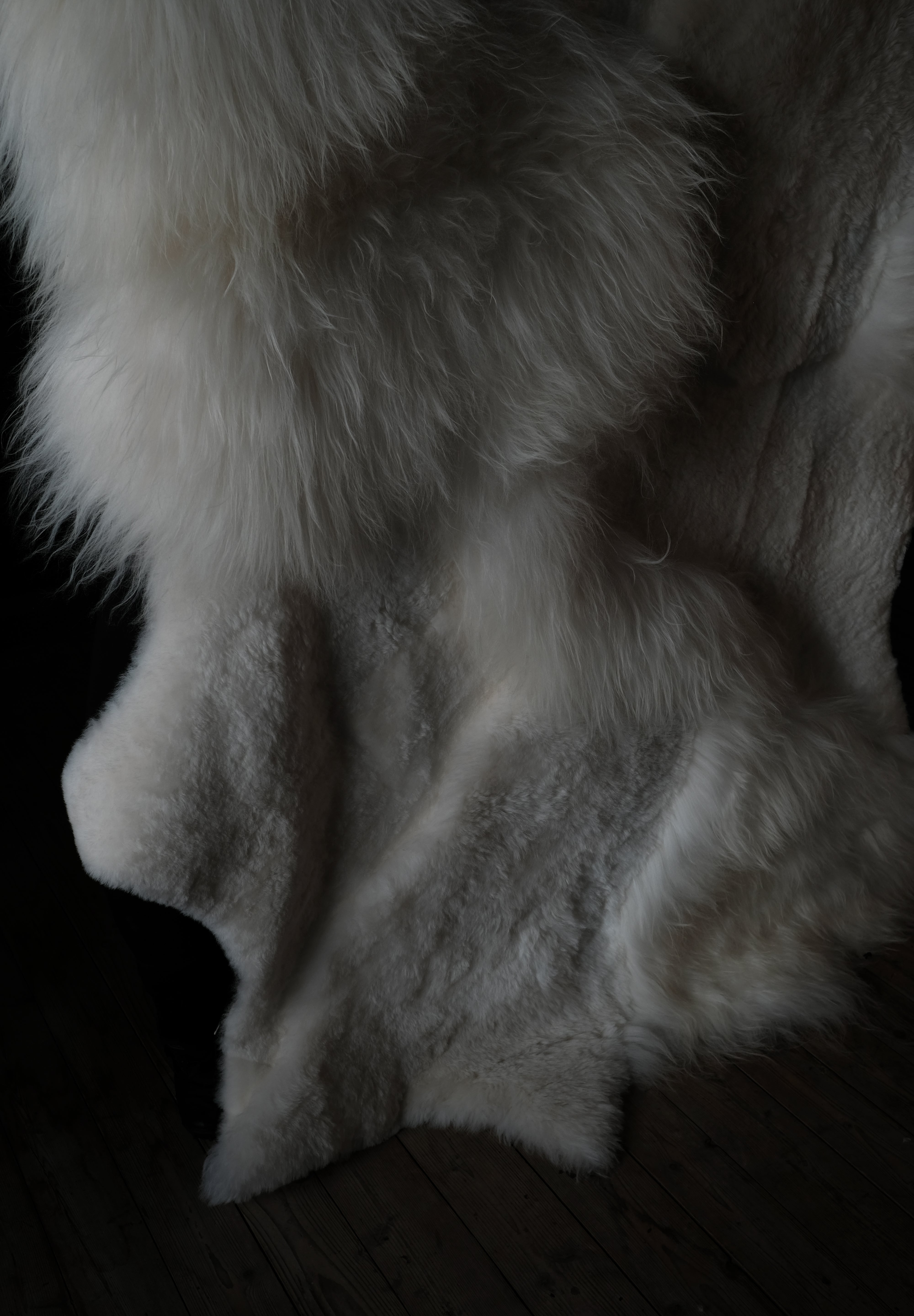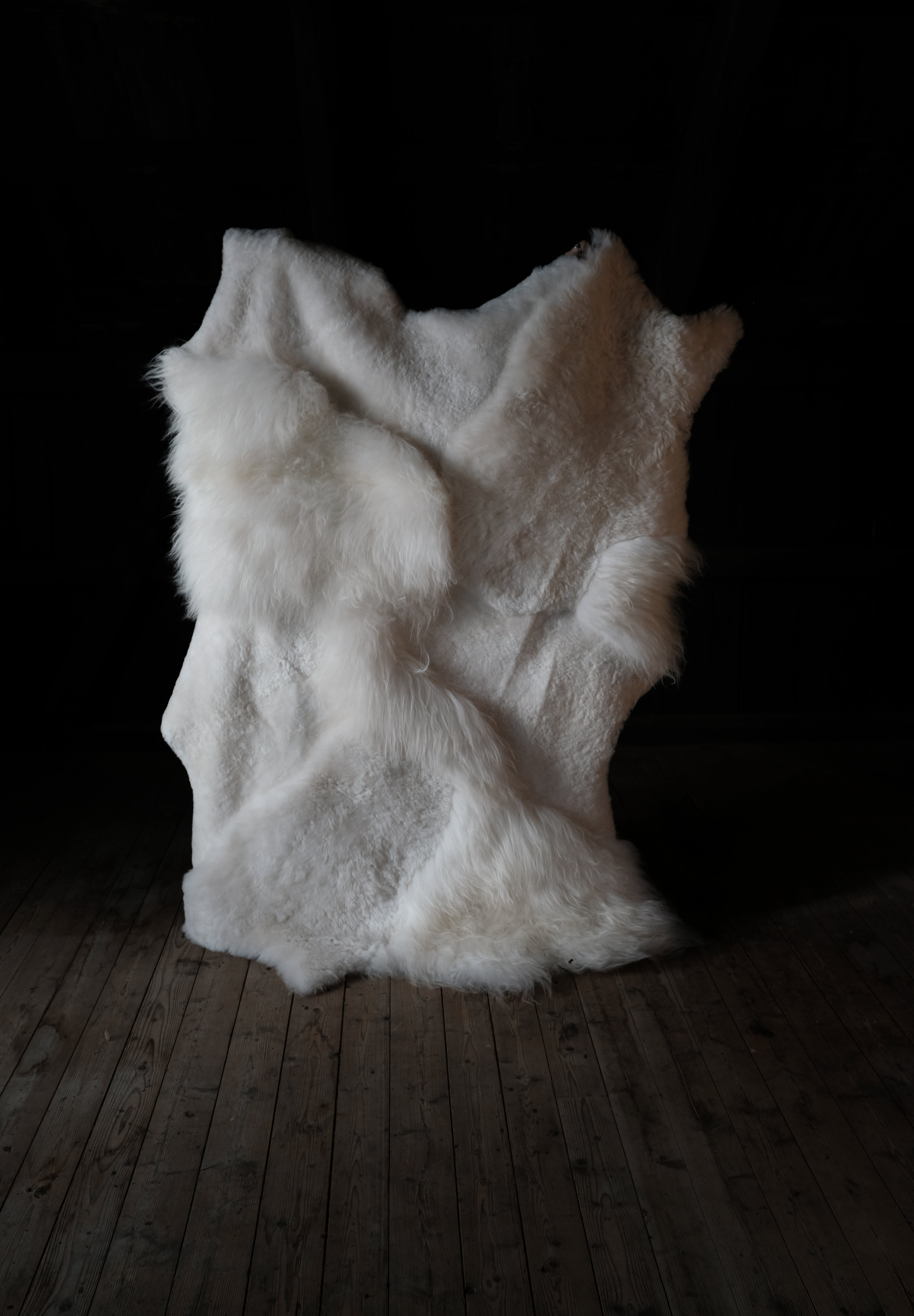 Et et unikt og utrolig vakkert teppe! Laget av ulike hvite saueskinn som er sydd sammen. Hvert teppe er forskjellig i utseende og er derfor helt unikt. Vakkert som et teppe, men det er også et skikkelig blikkfang som et veggteppe eller art piece på veggen!