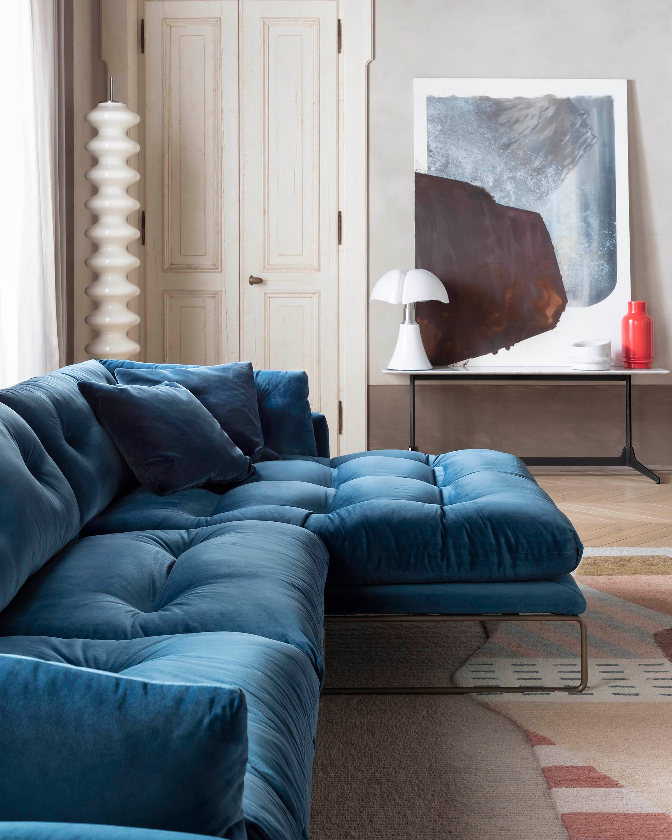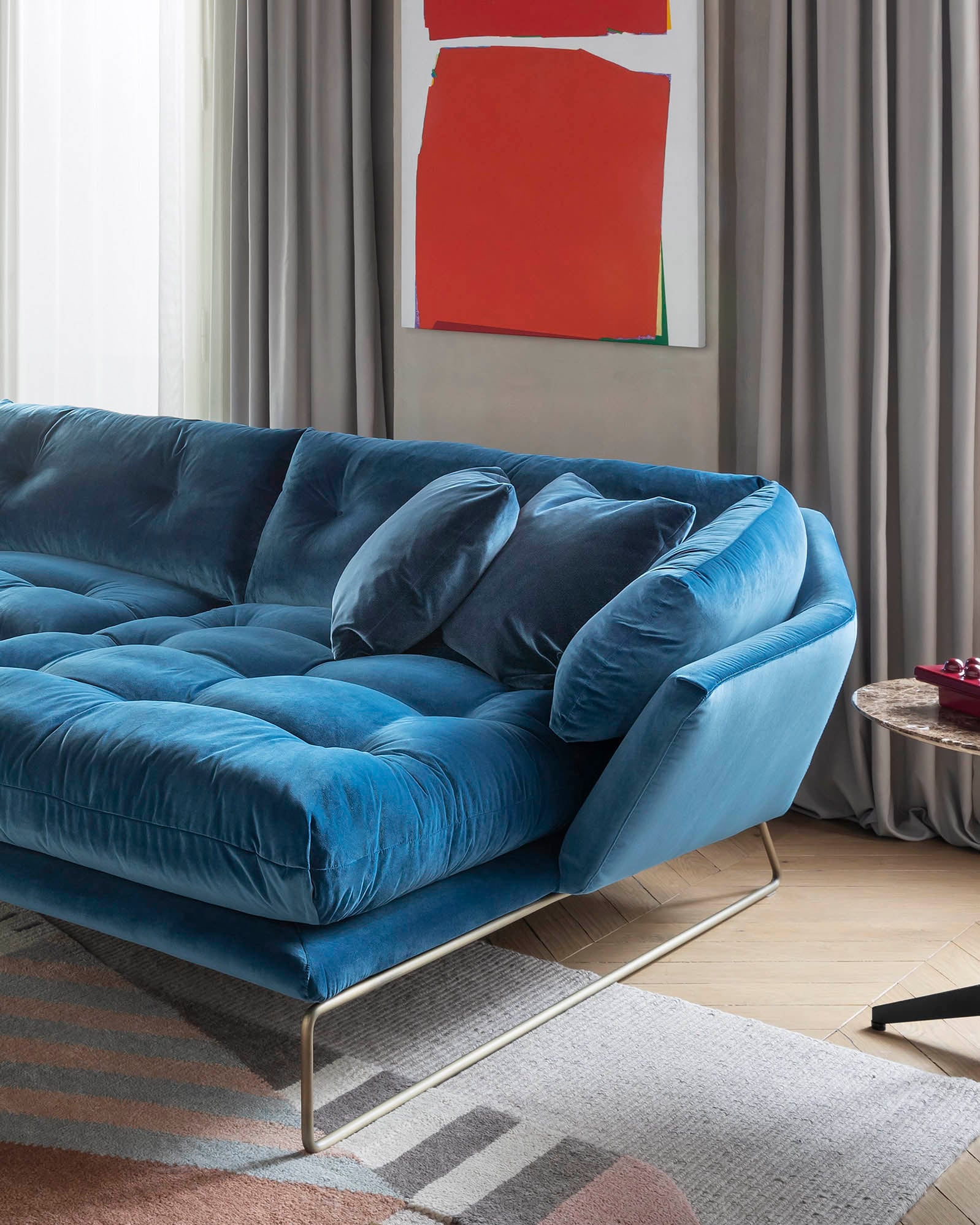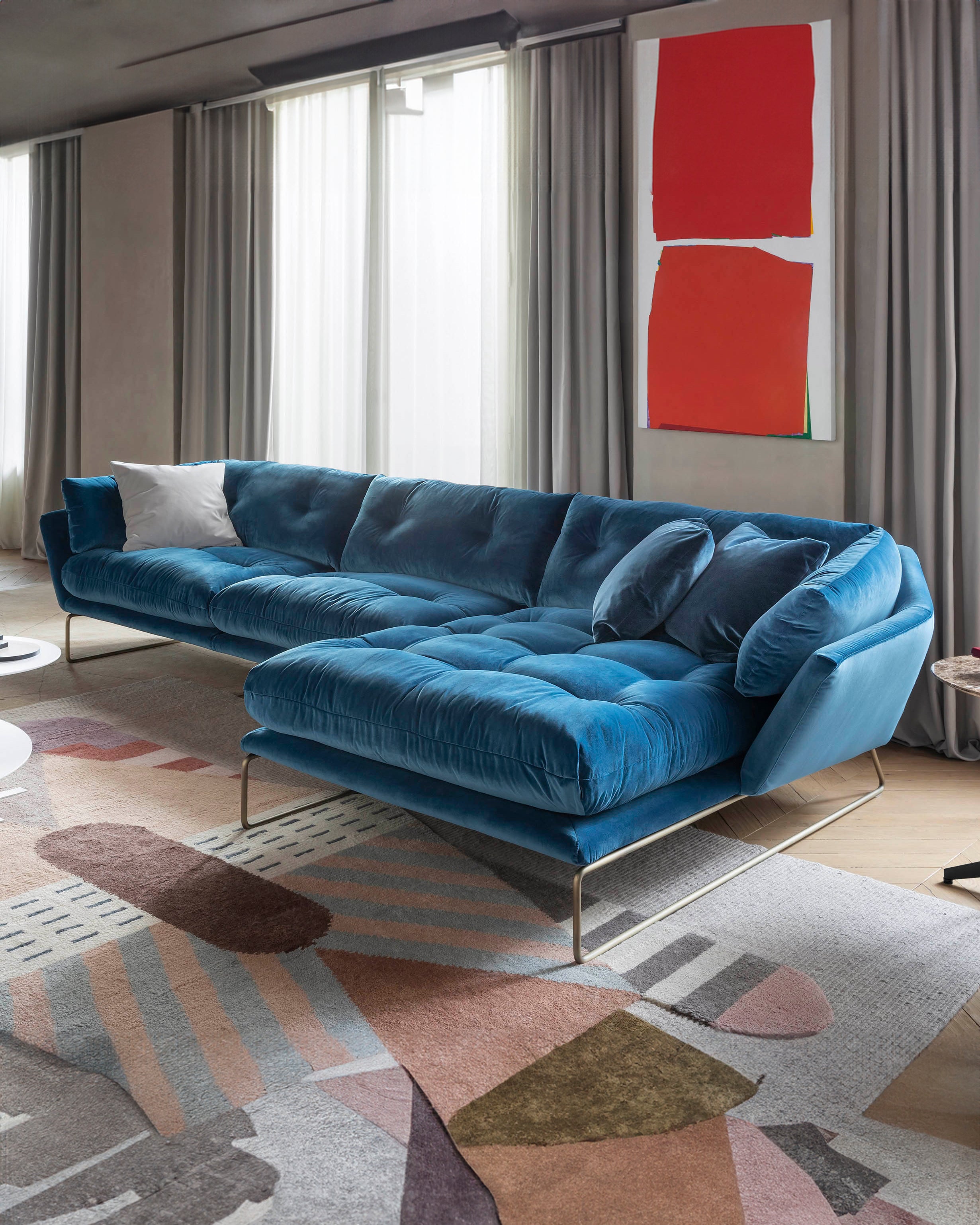 New York-kolleksjonen designet av Sergio Bicego kombinerer moderne sjel og tidløs eleganse. Med quiltede puter inspirert av retro-stil, skaper designet en nostalgisk atmosfære med et futuristisk preg. Den urbane stilen forsterkes av en hexagonal ramme som hviler på slanke stålben, noe som gir møblene et lett og sofistikert uttrykk. New York Suite er både myk og innbydende, også i mindre versjoner som maxi-lenestolen og en kompakt 155 cm sofa som komfortabelt rommer to personer – perfekt for kontraktsprosjekter.