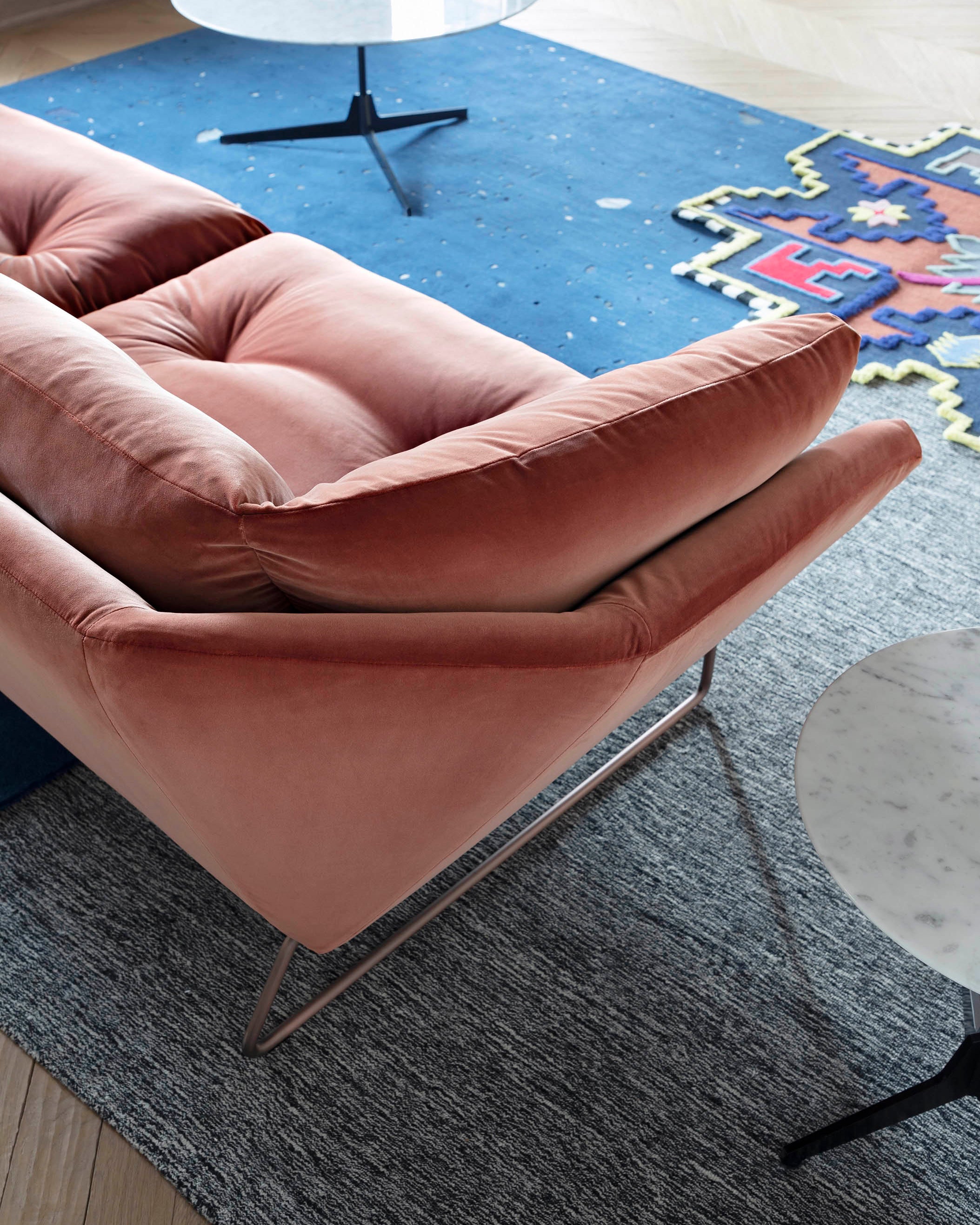 New York-kolleksjonen designet av Sergio Bicego kombinerer moderne sjel og tidløs eleganse. Med quiltede puter inspirert av retro-stil, skaper designet en nostalgisk atmosfære med et futuristisk preg. Den urbane stilen forsterkes av en hexagonal ramme som hviler på slanke stålben, noe som gir møblene et lett og sofistikert uttrykk. New York Suite er både myk og innbydende, også i mindre versjoner som maxi-lenestolen og en kompakt 155 cm sofa som komfortabelt rommer to personer – perfekt for kontraktsprosjekter.