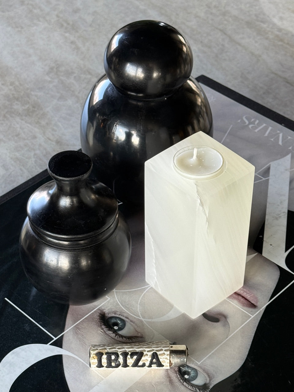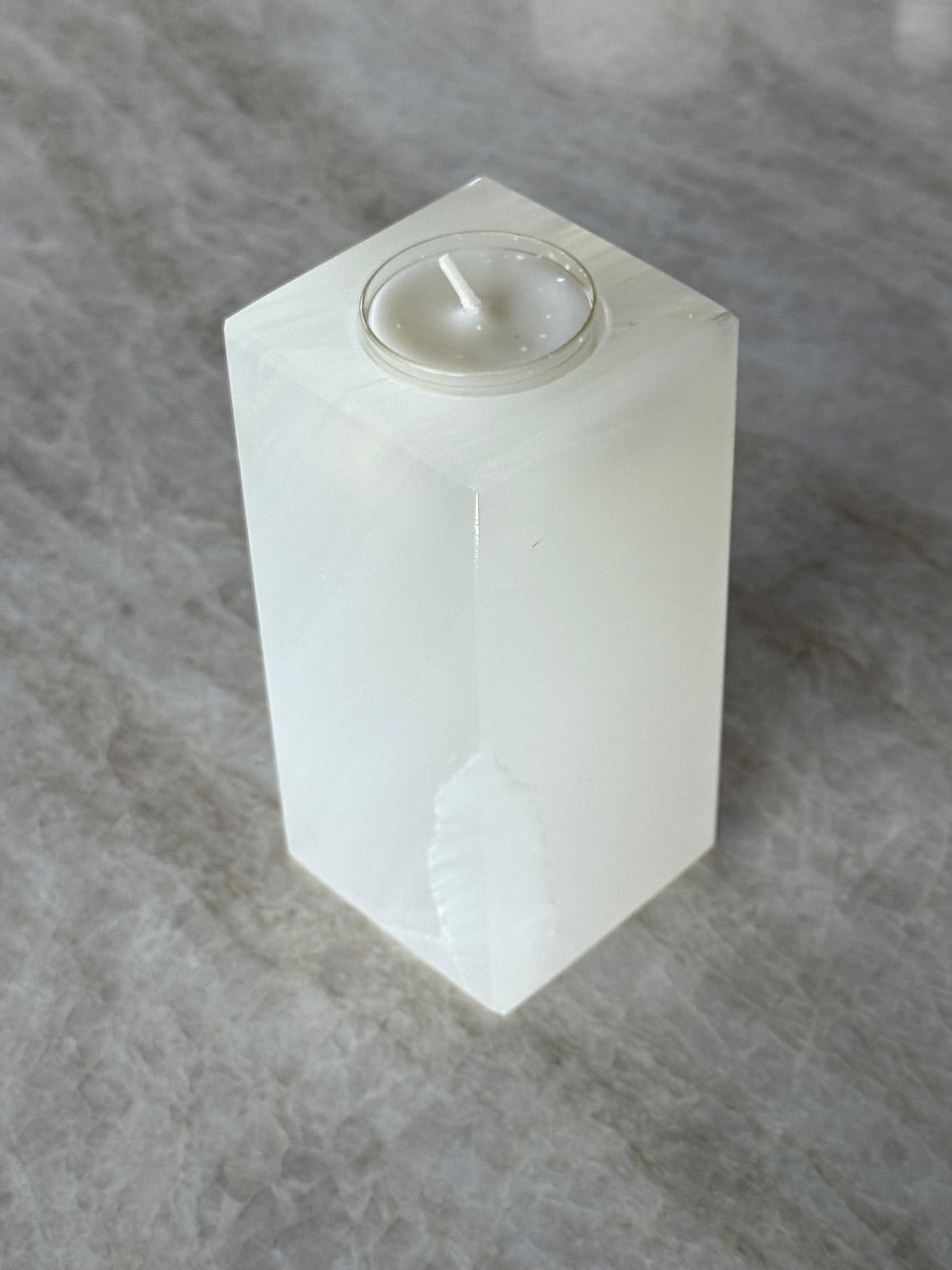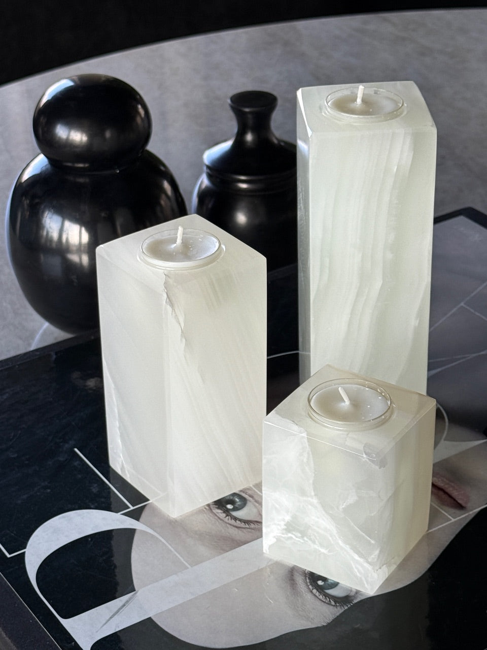 Onyx er et naturmateriale, og hver telysholder er unik. Farge og mønster vil variere noe.