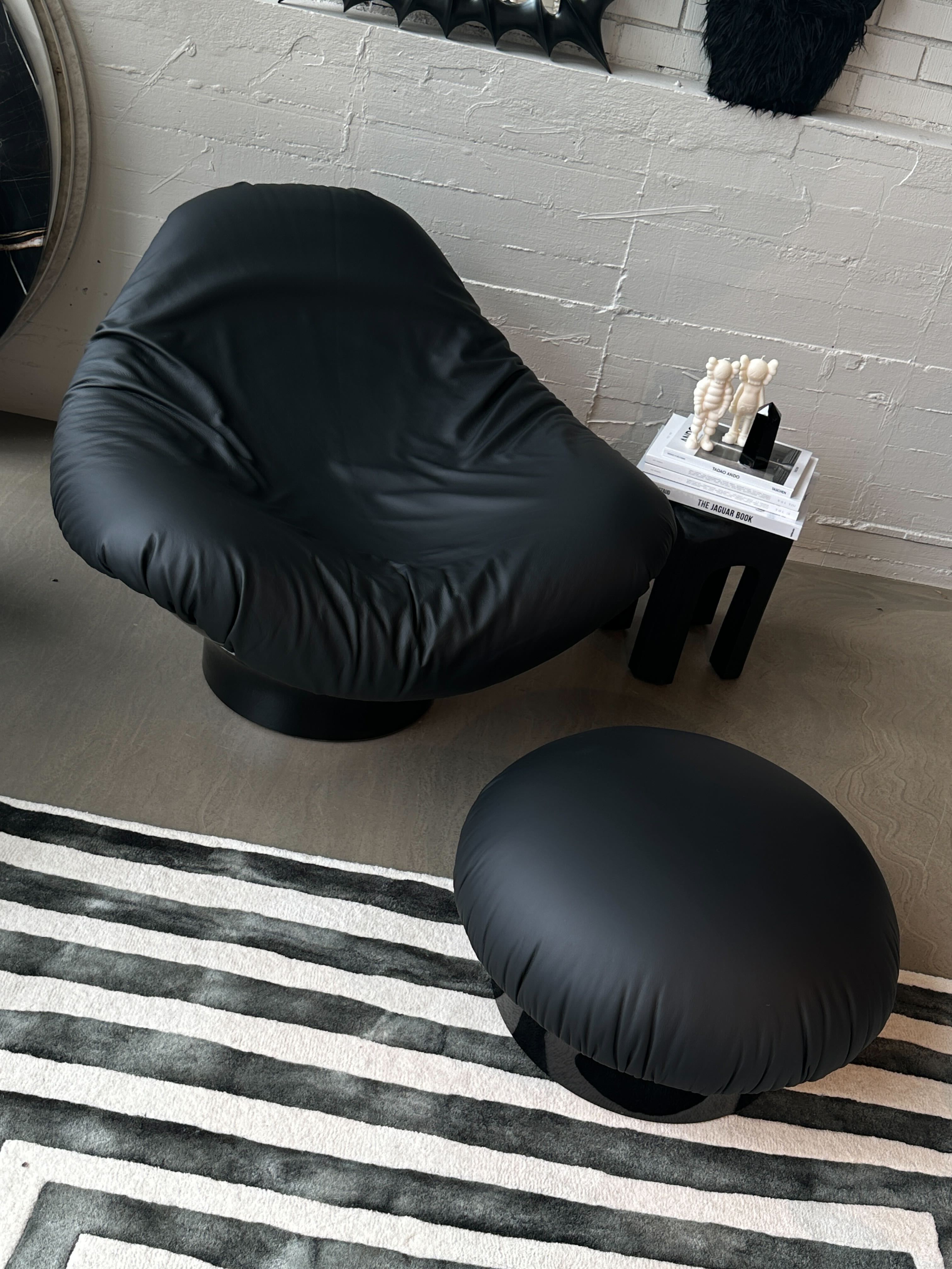 Lenestol satt på fast base, øvre del av stolen er roterbar. Stolen er tilgjengelig i mange forskjellige stofffinisher.