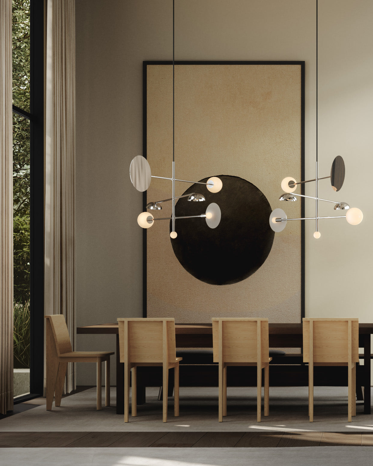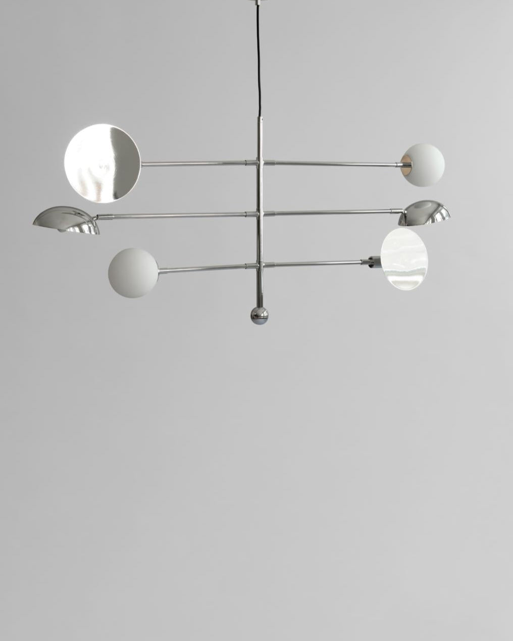 Inspirert av 70-talls futuristisk design og romalder, handler Sahn Chandelier om bevegelse og fleksibilitet. Hver lampearm og lampeskjerm kan snu og vri seg i forskjellige retninger, og understreker en unik og skulpturell belysning av rommet.