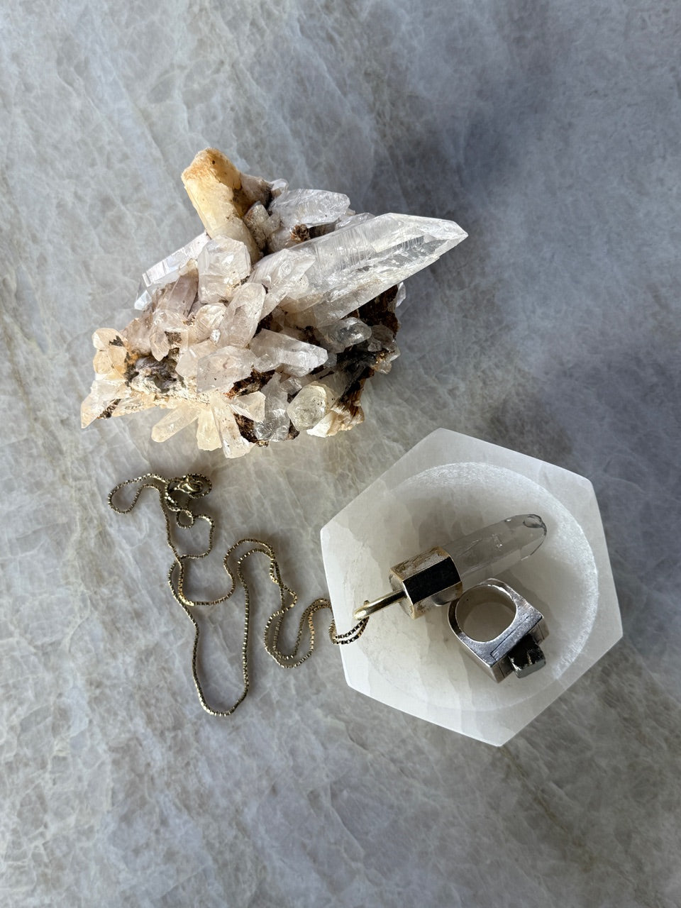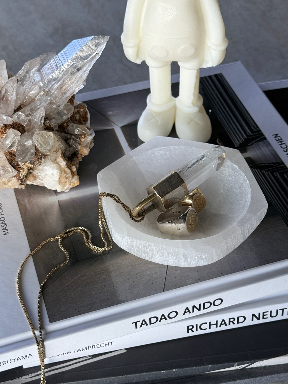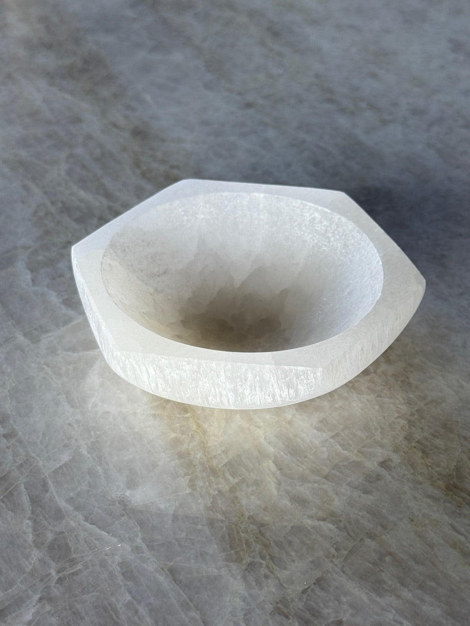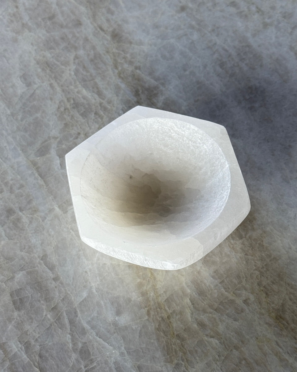 Vakker liten hexagonformet skål i selenitt! Perfekt for oppbavaring av smykker, andre små krystaller, krydder eller småting. Selenitt renser og lader andre krystaller!