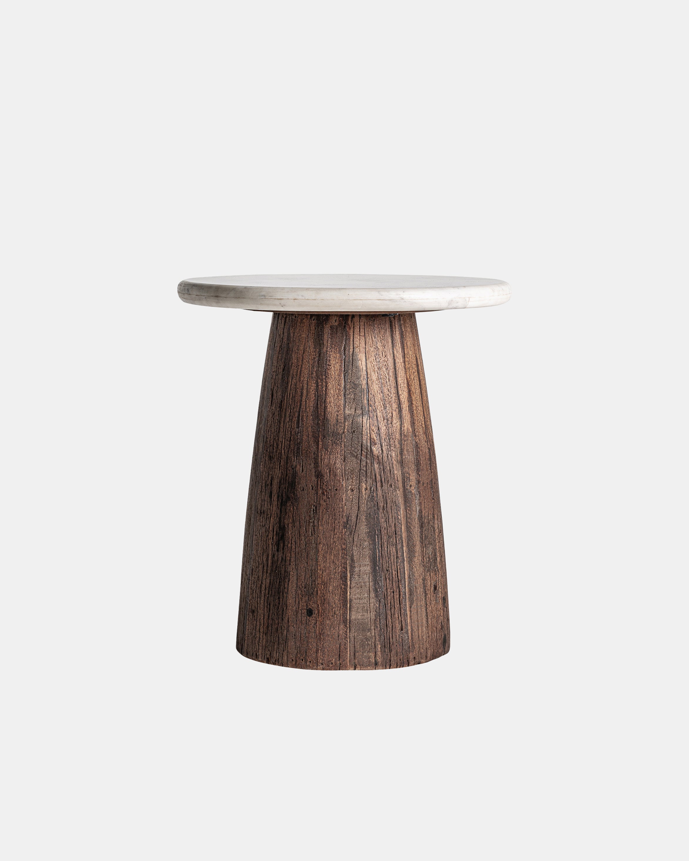 Skorup sidebord har en rustikk stil og er laget av gjenvunnet tre i brunt med en antikk finish. Bordets plate er i hvit marmor og er en fin kontrast til treverket.