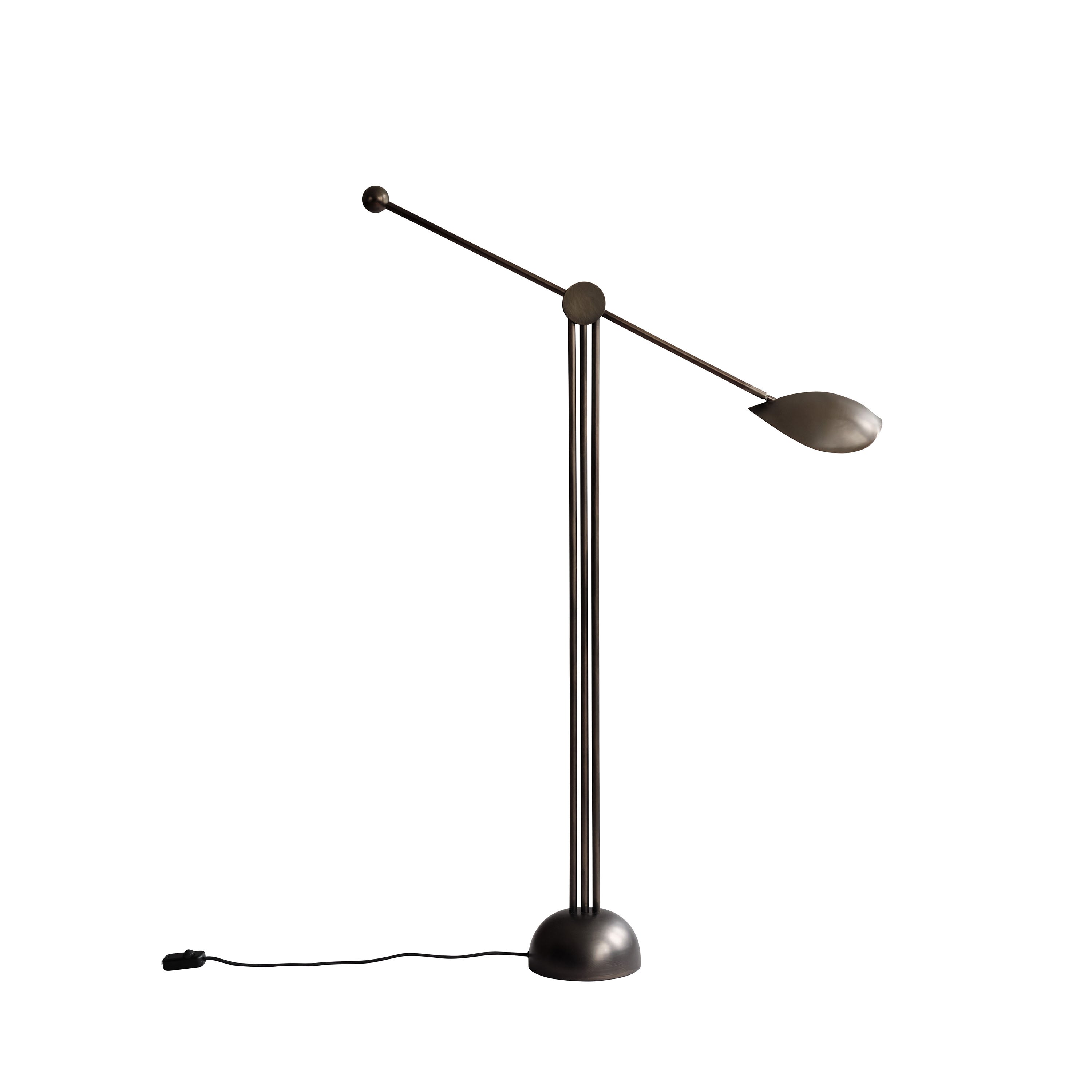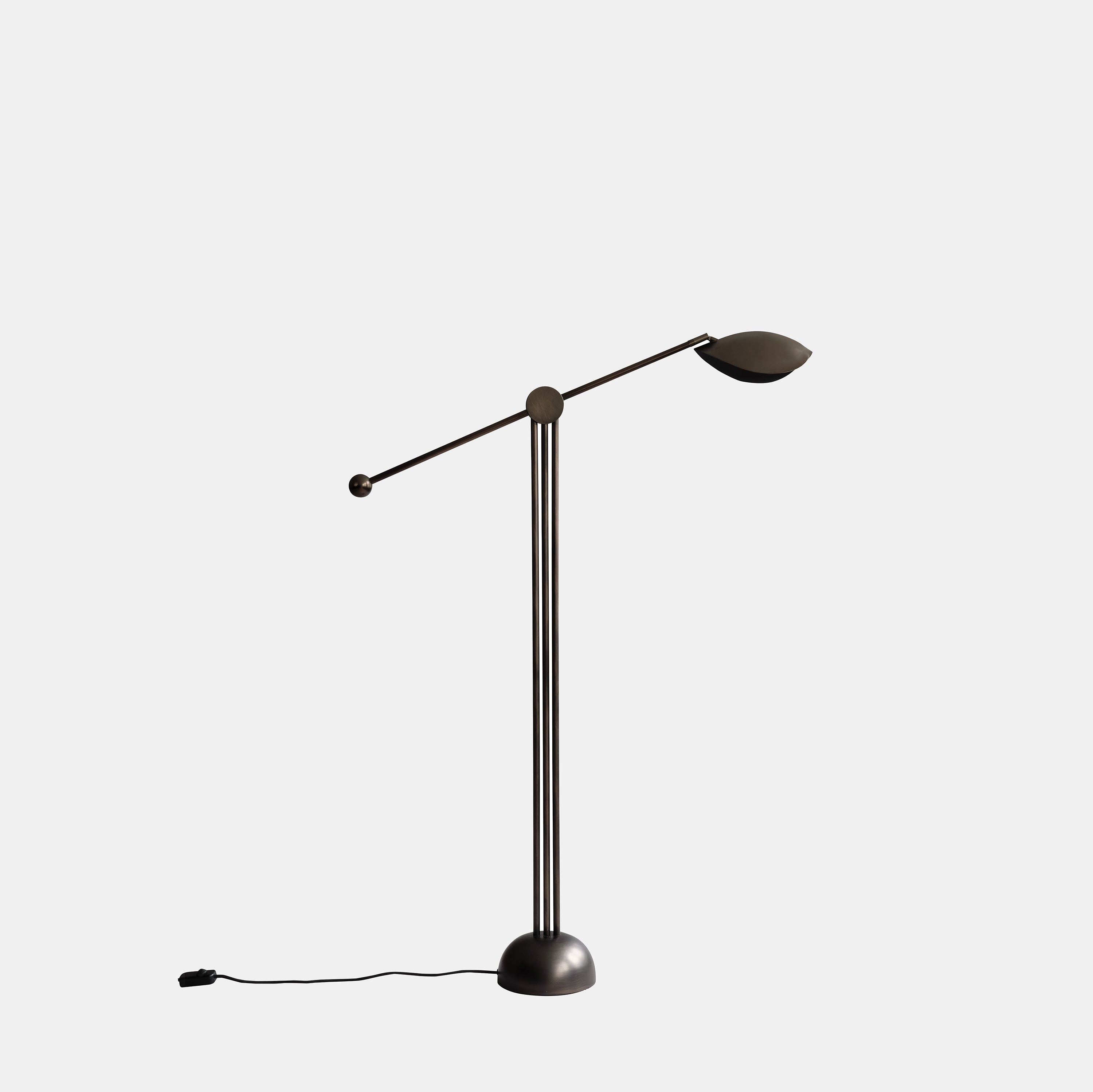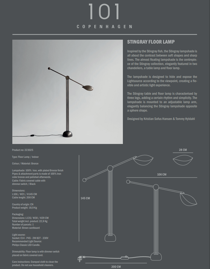 Inspirert av Stingray-fisken, er Stingray-lampeskjermen kontrasten mellom myke former og skarpe linjer. Den nesten flytende lampeskjermen er midtpunktet i Stingray-kolleksjonen, som består av to lysekroner,en bordlampe og denne gulvlampen. Lampeskjermen er designet for å skjule og avsløre Lyskilde i henhold til synspunkt samtidig som den skaper en fleksibel og kunstnerisk lysopplevelse. Lampeskjermen er montert på en justerbar lampearm, elegant balanserer Stingray-lampeskjermen på motsatt side en kuleform.