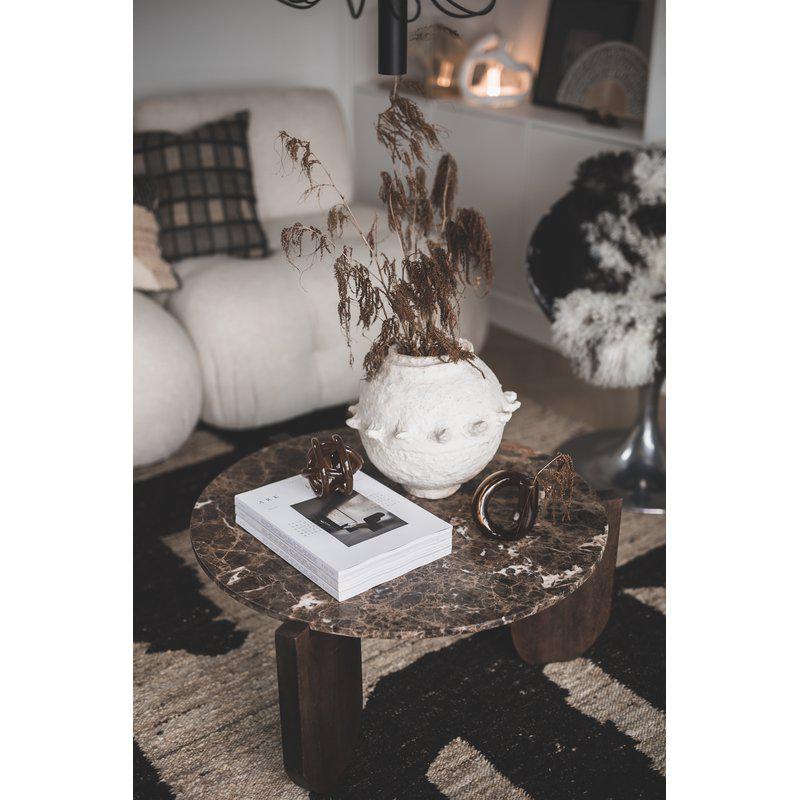 Et ekte statement-bord i Ampredo-marmor. Bordet har en understell laget av robust mangotre, som gir det et varmt og naturlig preg. Bena er også avrundet, noe som gir en myk følelse til hele bordets design, og sammen med det rå utseendet til marmor får Tabella en virkelig fin balanse av både myke og harde designelementer. Siden marmor er et naturmateriale, kan det forekomme variasjoner i farge og mønster – noe som betyr at bordet ditt blir unikt, men hvem elsker ikke unike møbler og personlighet i interiøret? Så la dette marmorbordet bli stjernen i hjemmet ditt som du alltid har ønsket deg. Med sin unike design og stil vil den fange blikket og få hjemmet ditt til å skille seg ut på beste måte.
