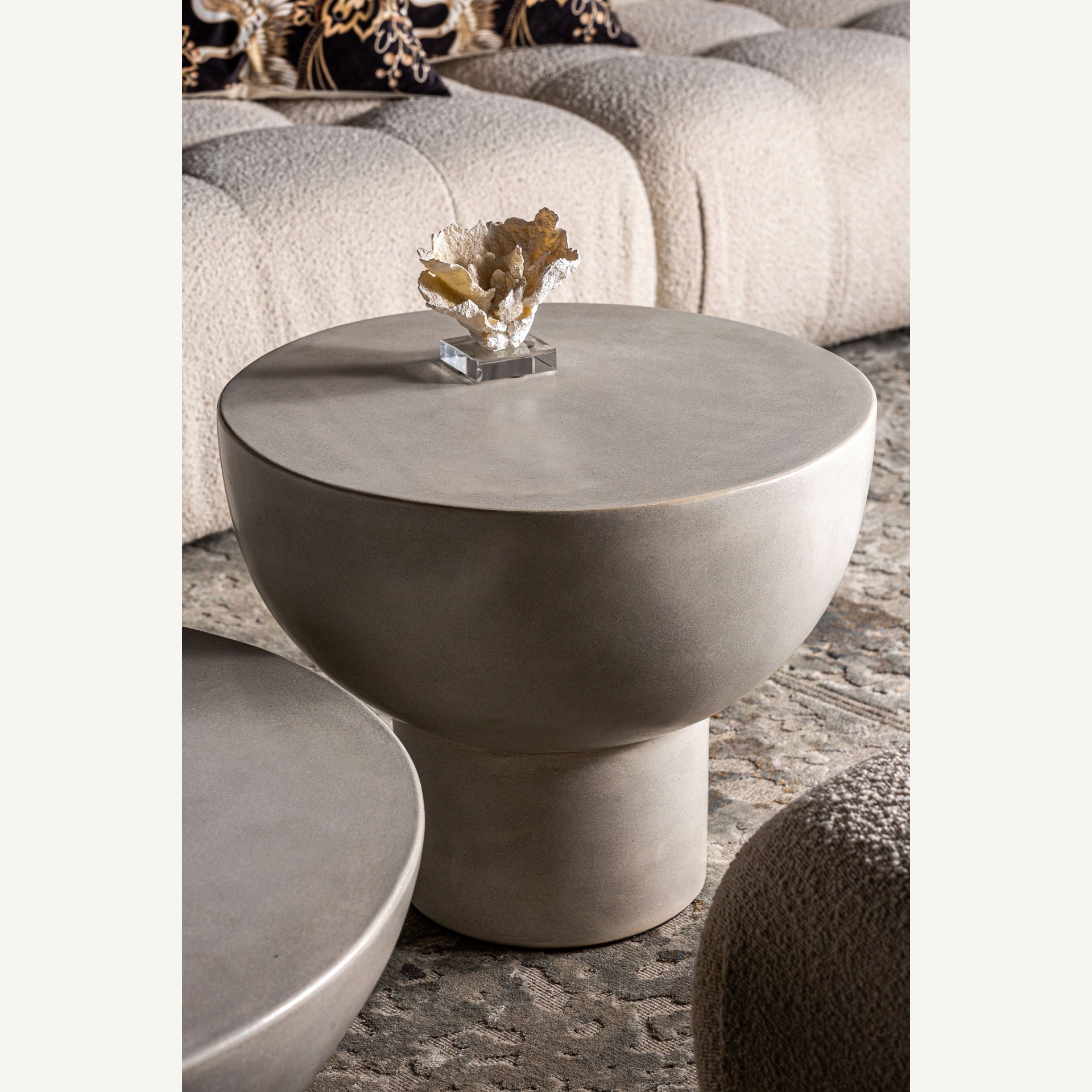Telfs sidebord fra Vical er laget av grå sement med et kjegleformet design. Dette gir bordet et moderne og elegant preg. Det gir holdbarhet og stil, og er perfekt for de som leter etter et særegent stykke til hjemmet ditt. Perfekt som et lite sidebord i stuen eller gangen, men kan også brukes som et nattbord.