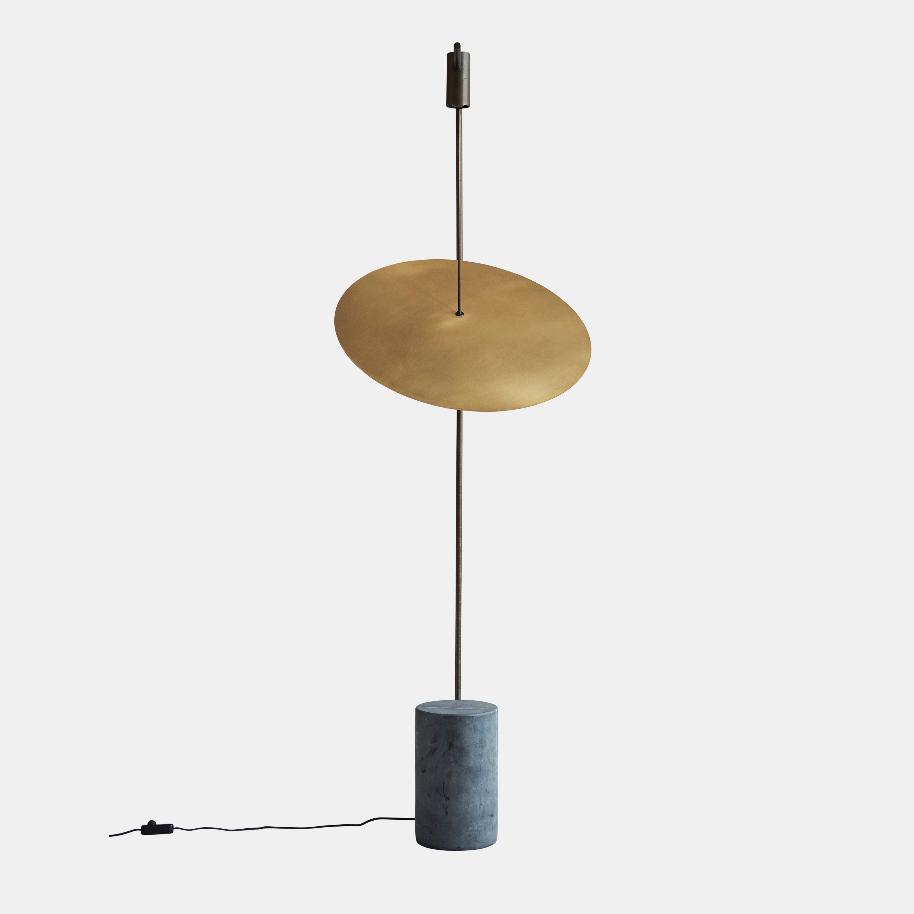 Lampen har to lyskilder plassert som komposisjonelle fikspunkter langs en oksidert messingarm. En stor sirkulær lampeskjerm henger fra lampearmen som en flytende reflektor i rommet.