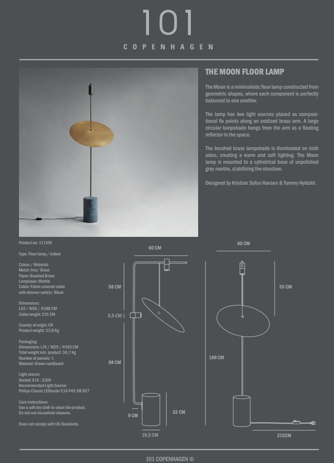 The Moon er en minimalistisk gulvlampe inspirert av minimal kunst og industrielle skulpturer. Lampen er en nøye konstruert geometri, hvor hver komponent er perfekt veid i forhold til hverandre.
