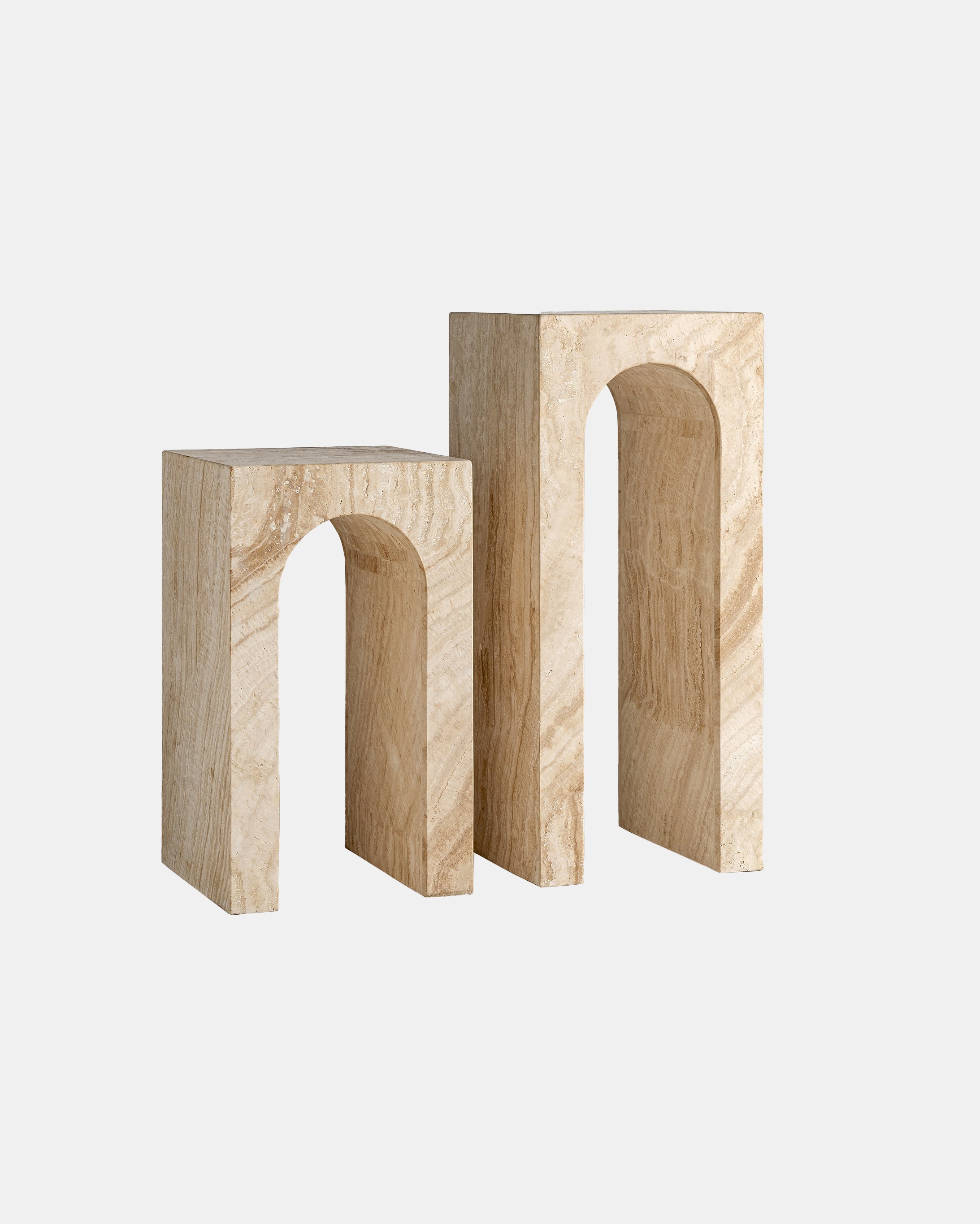 Opplev sofistikasjonen og elegansen travertine bordet Thiennes. Borddet kommer i to størrelser og er veldig fine sammen men kan også stå alene. Laget i lysebrun travertin og inspirert av art deco-stilen, gir dette eksklusive stykket et snev av luksus til enhver plass. Hev interiøret ditt med dette tidløse og smakfulle statement-stykket.