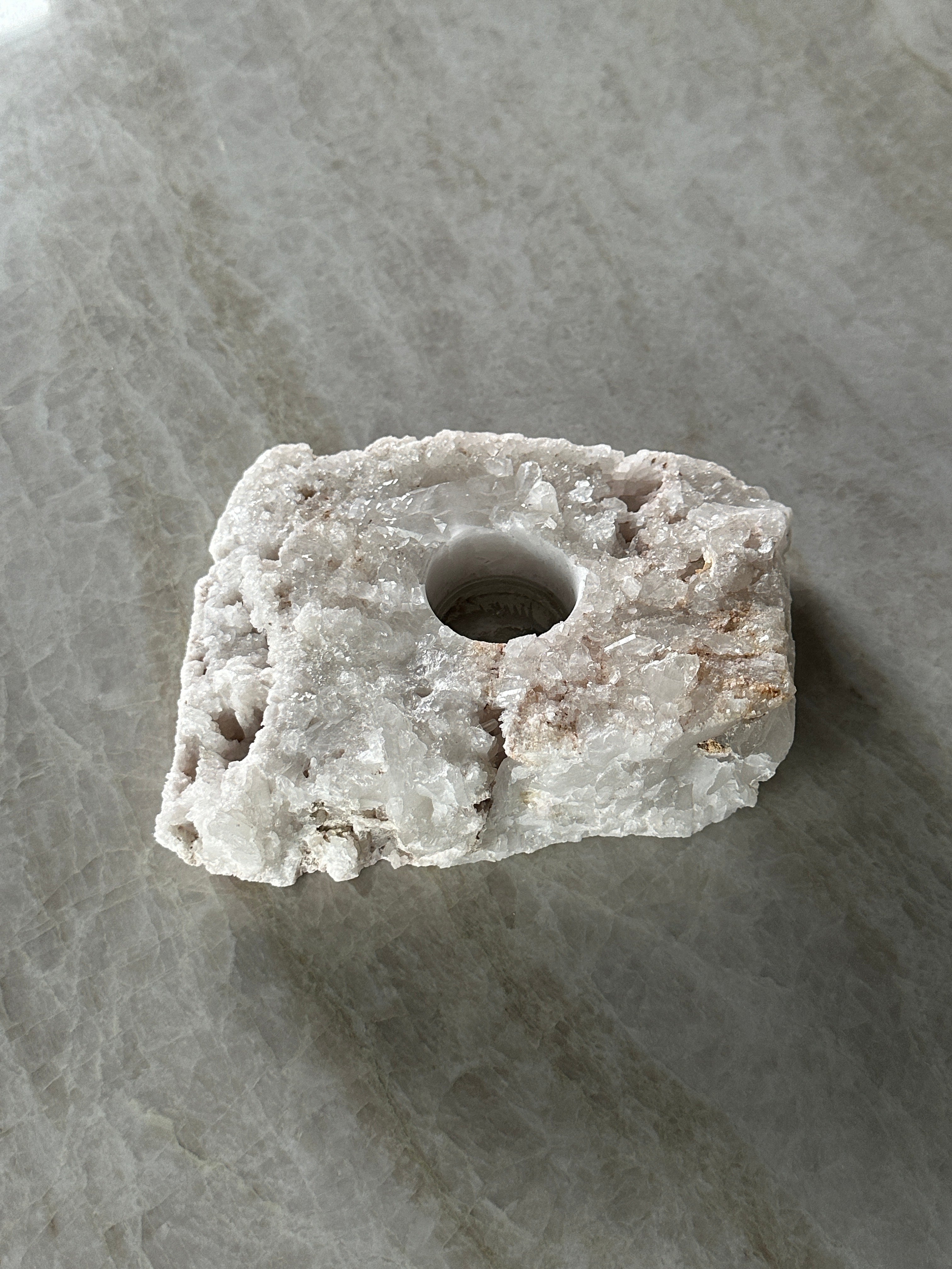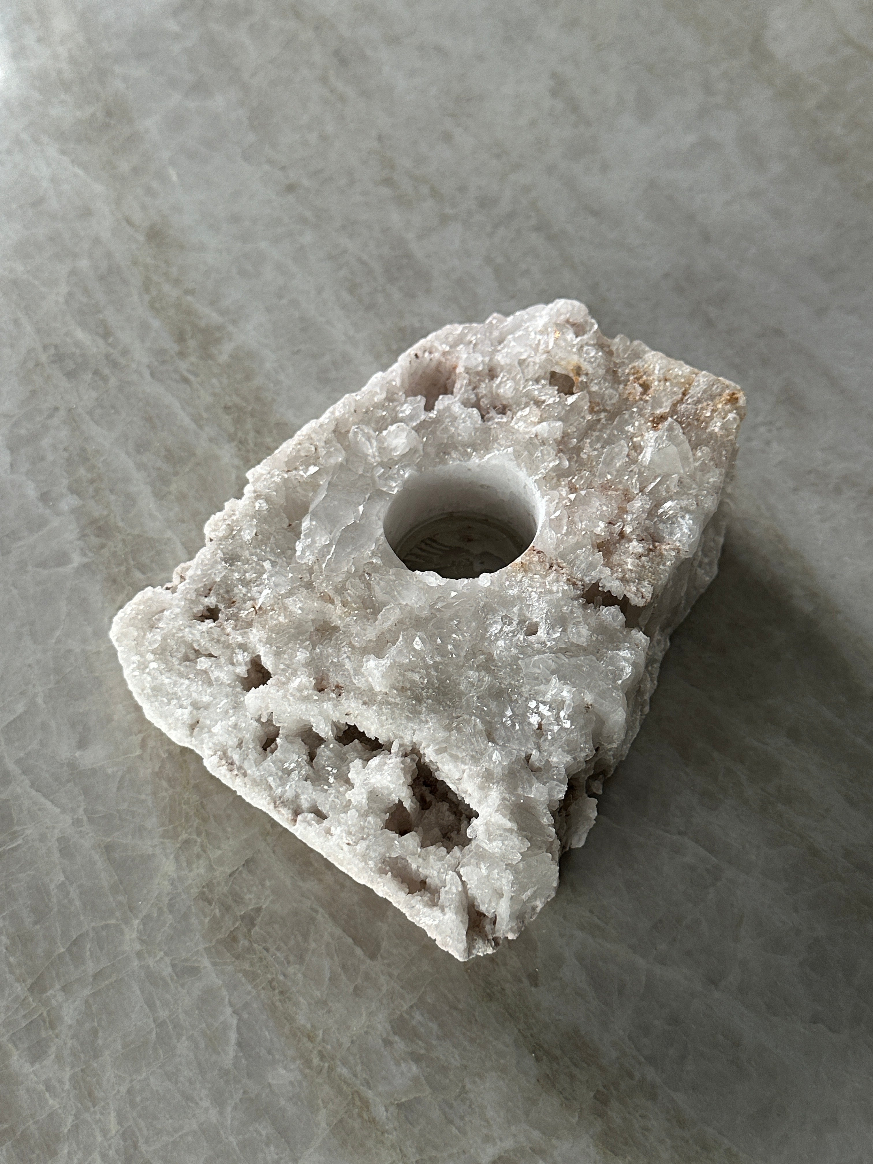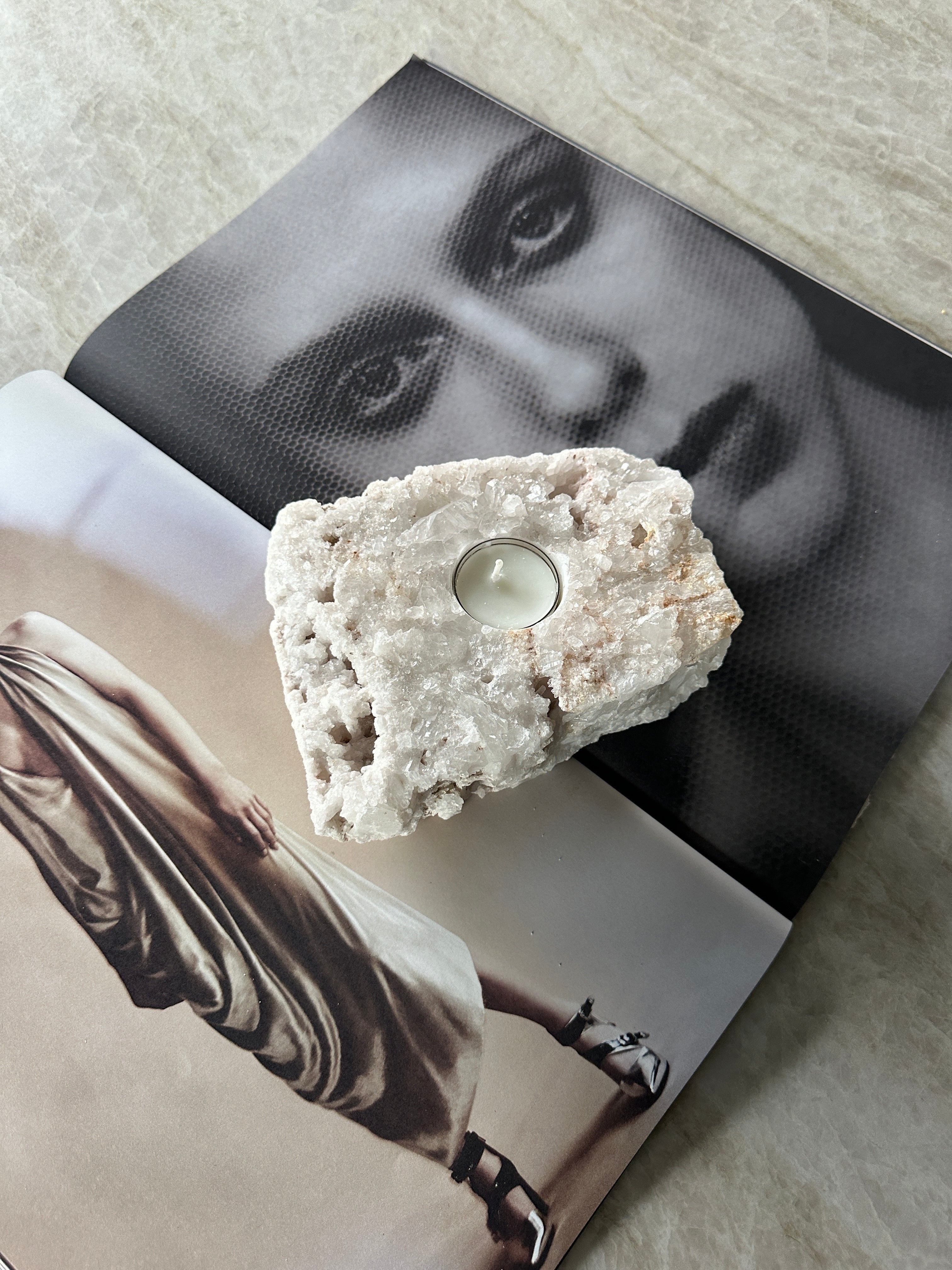 Unik telysholder i kvarts krystall! Hver og en er helt unik og setter prikken over i´en i en hver stue! Gir veldig god stemning med en tent telys samtidig som det er et dekorelement i seg selv når den ikke er i bruk.