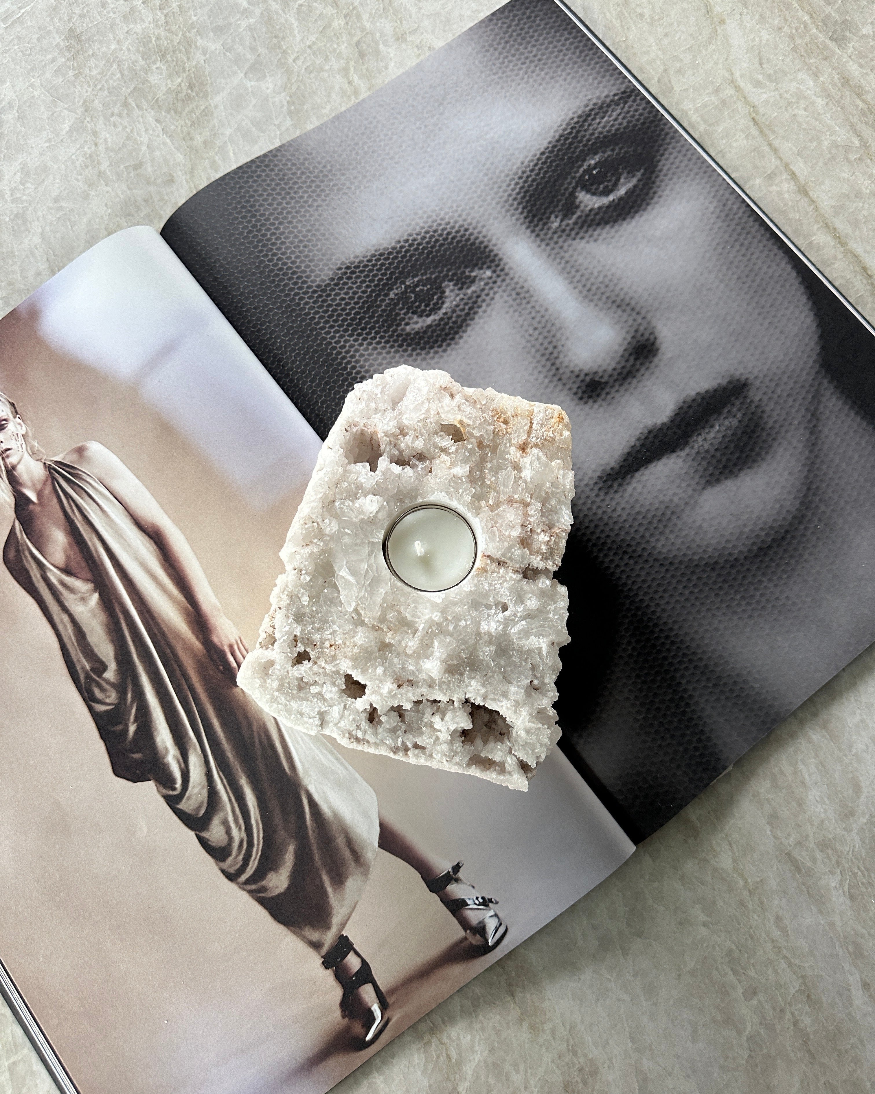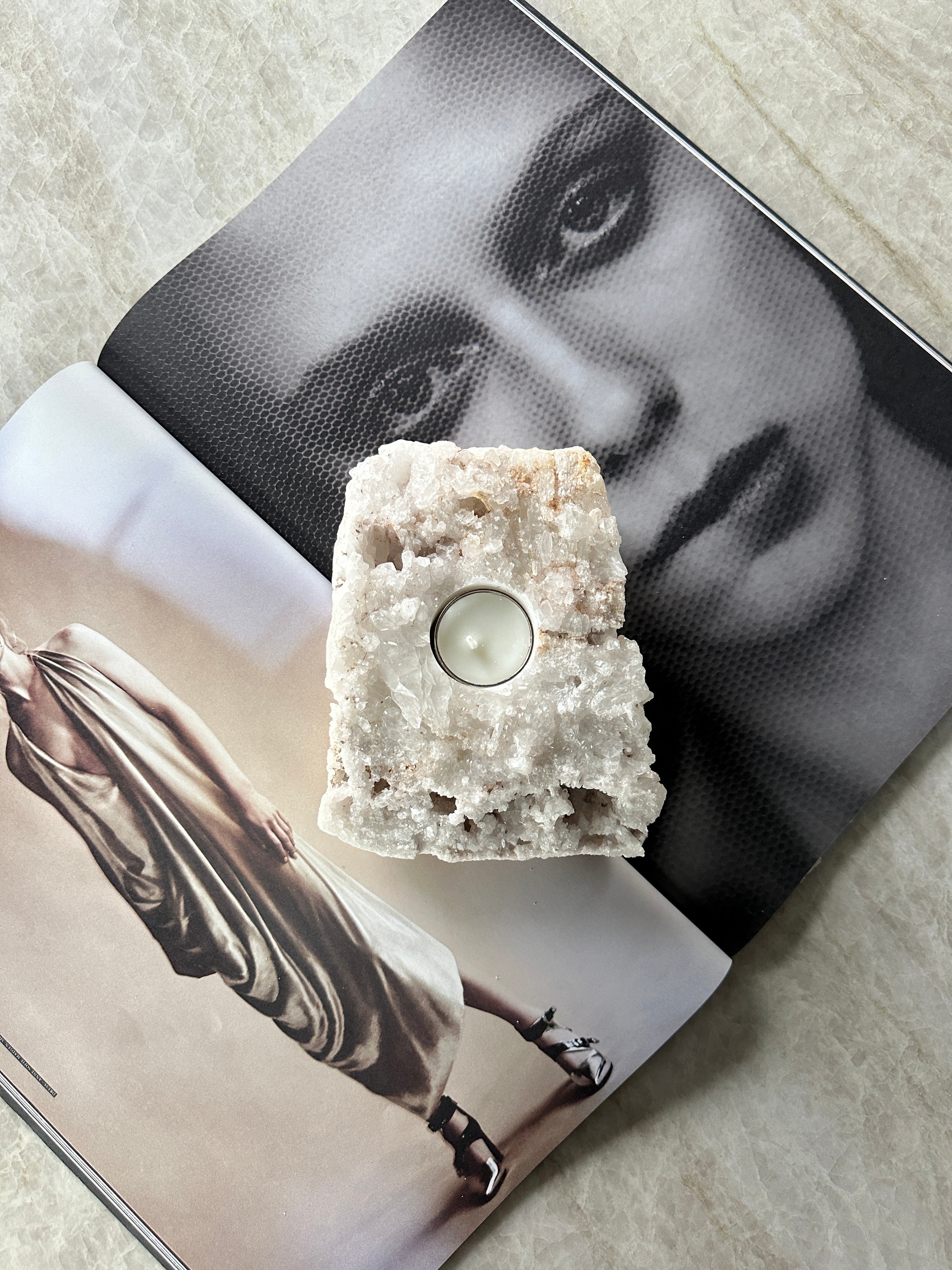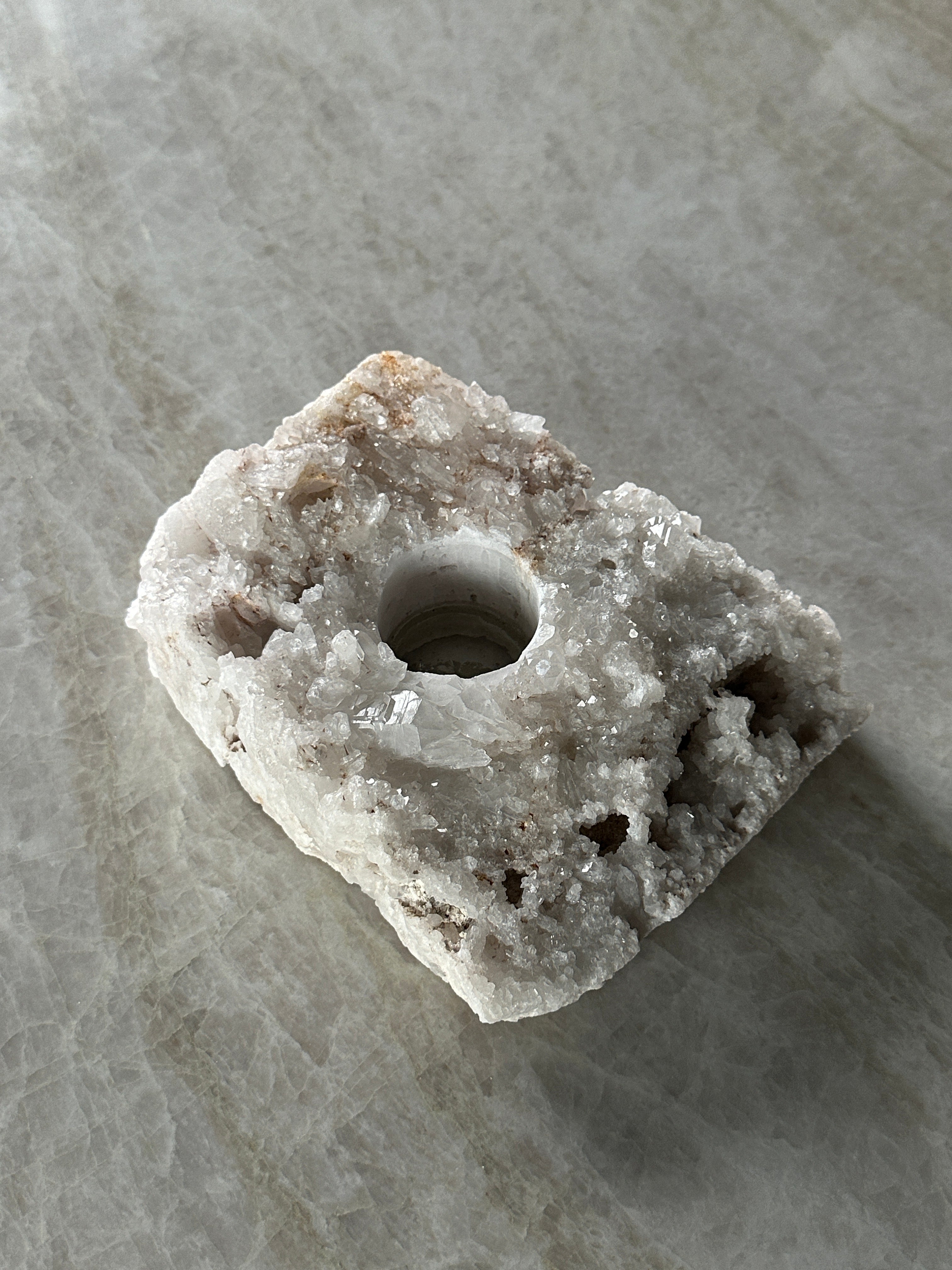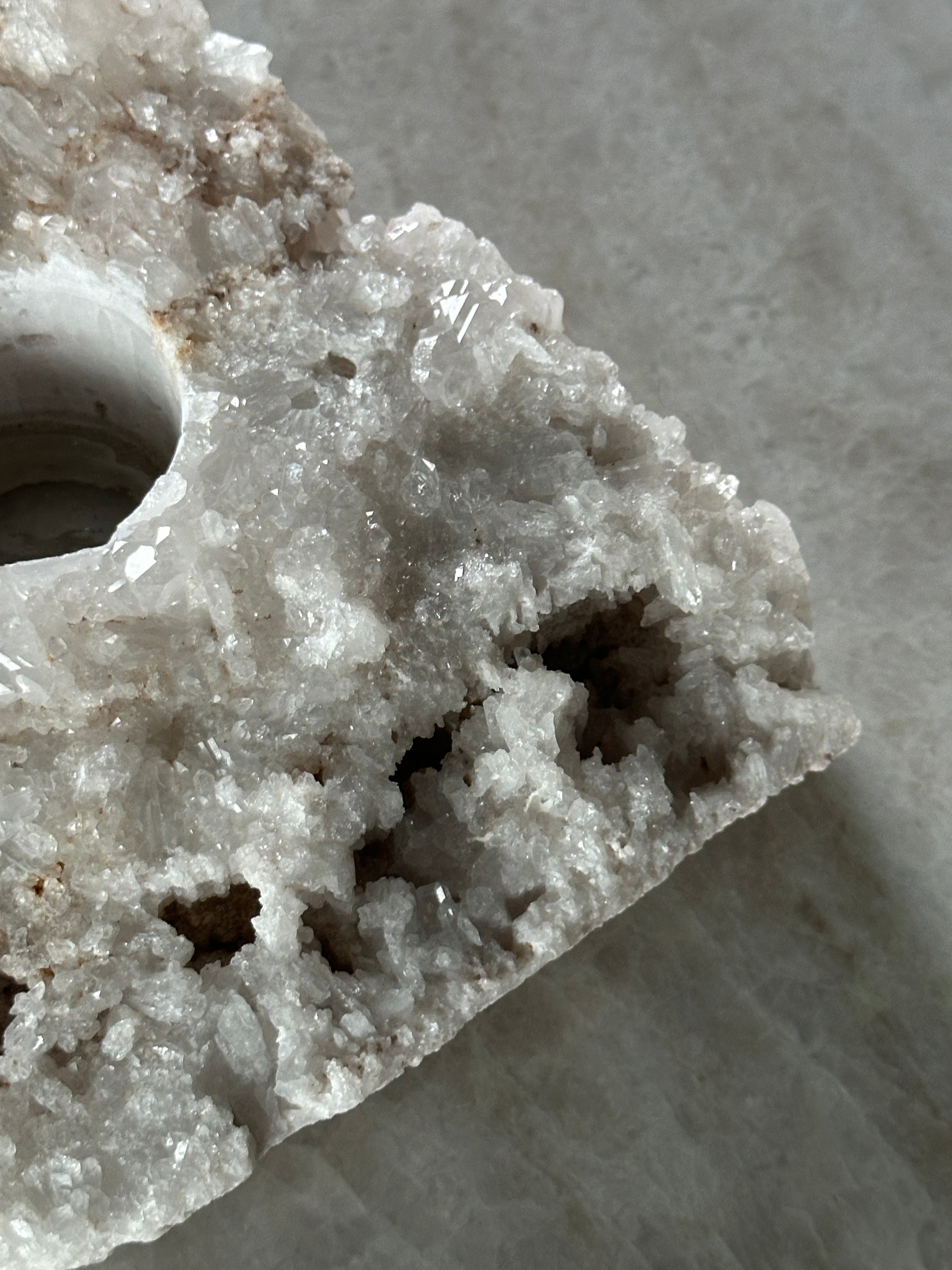 Unik telysholder i kvarts krystall! Hver og en er helt unik og setter prikken over i´en i en hver stue! Gir veldig god stemning med en tent telys samtidig som det er et dekorelement i seg selv når den ikke er i bruk.