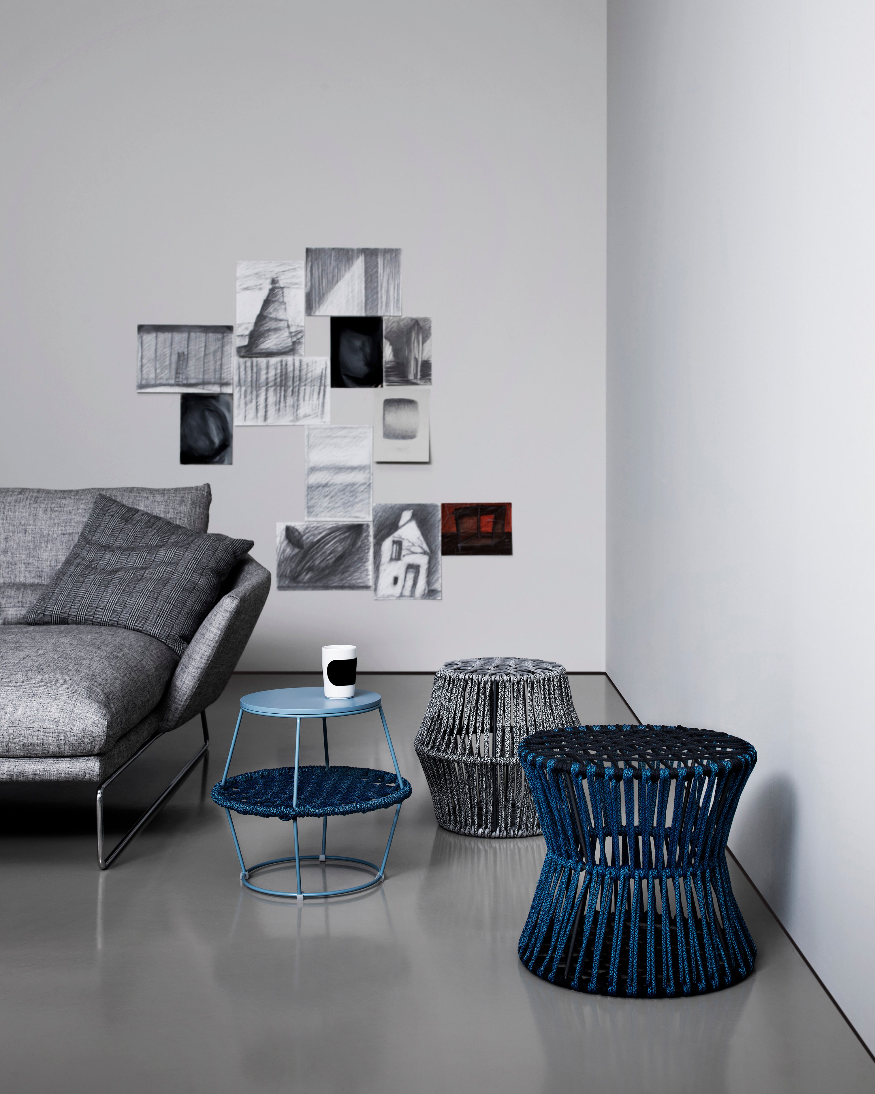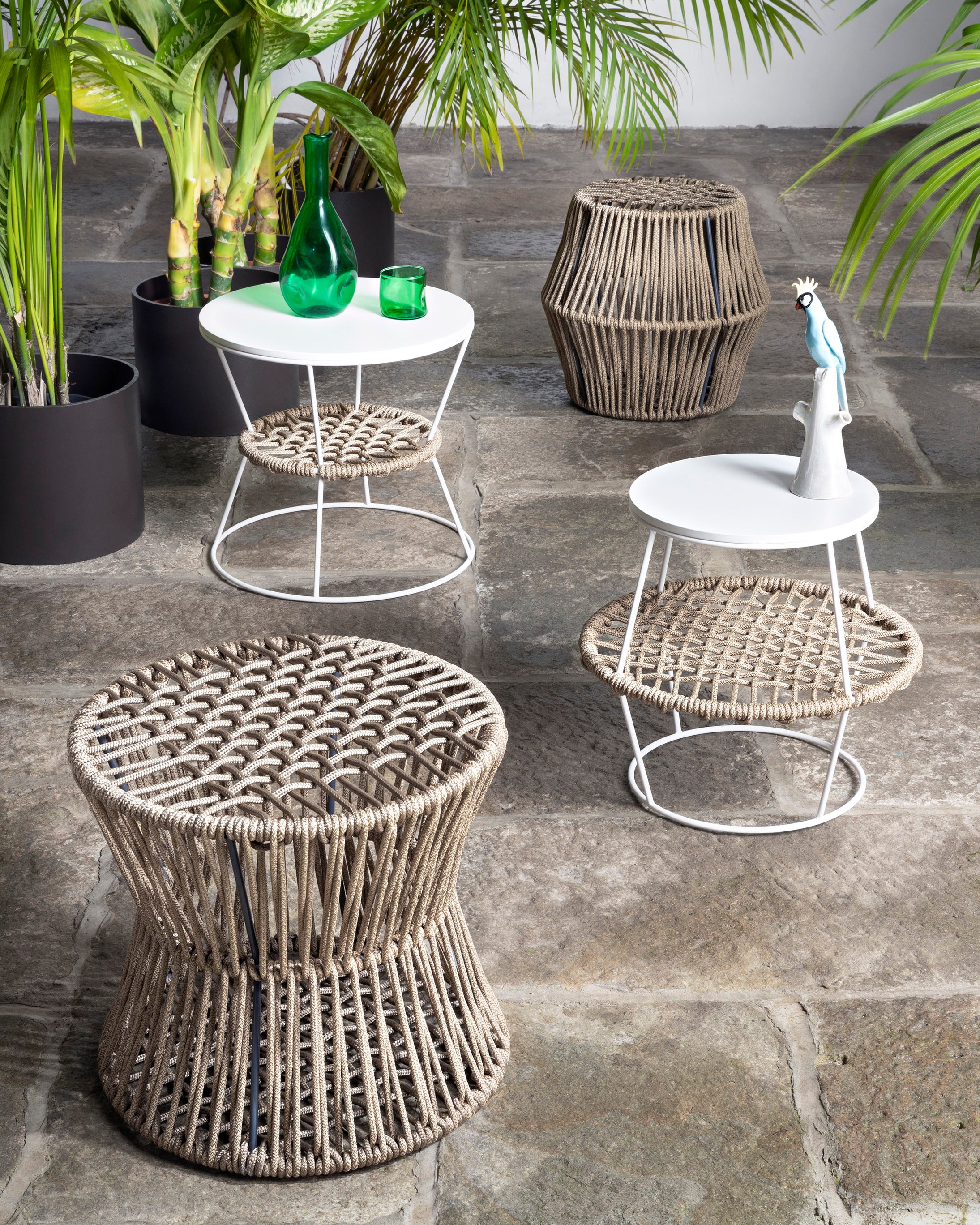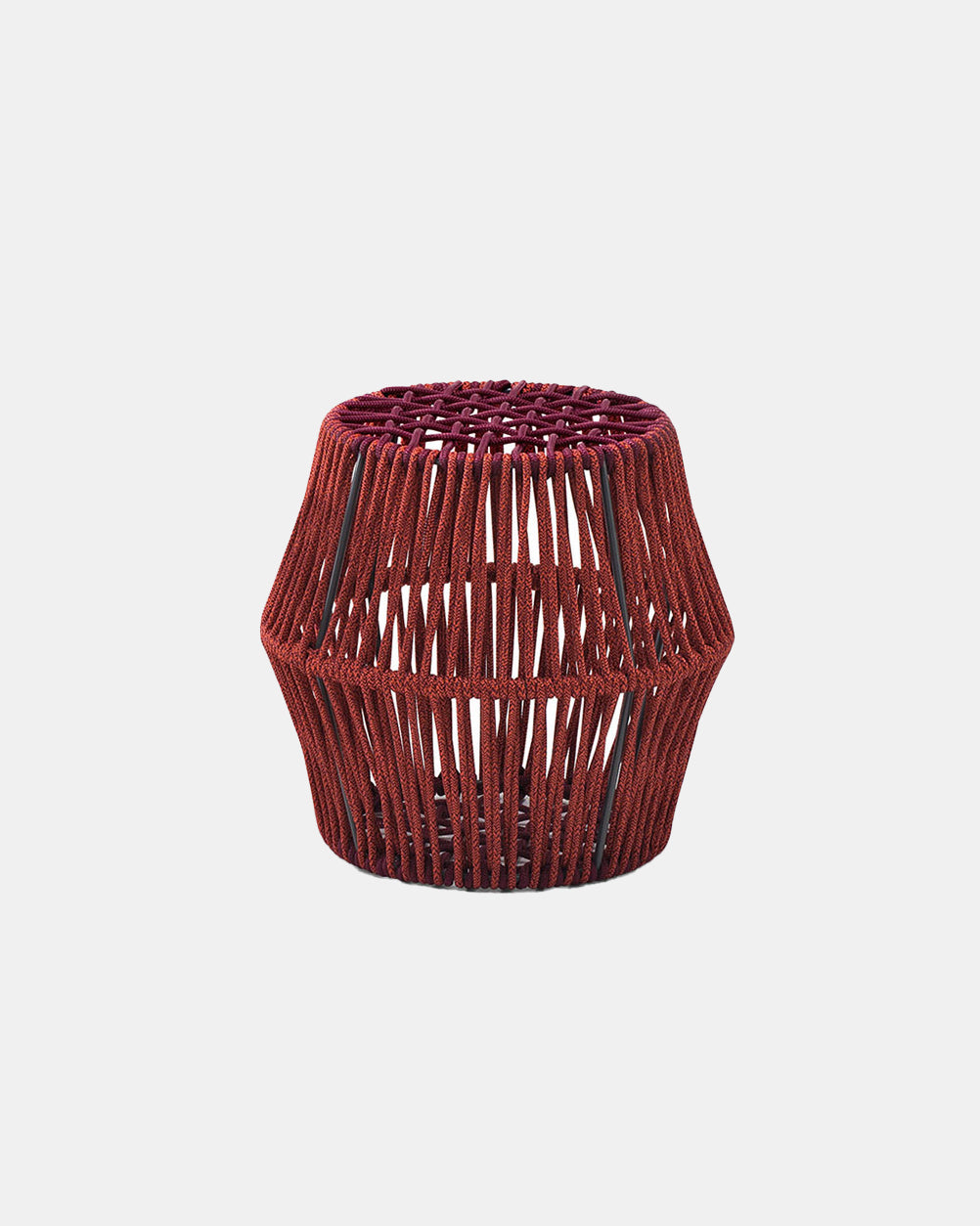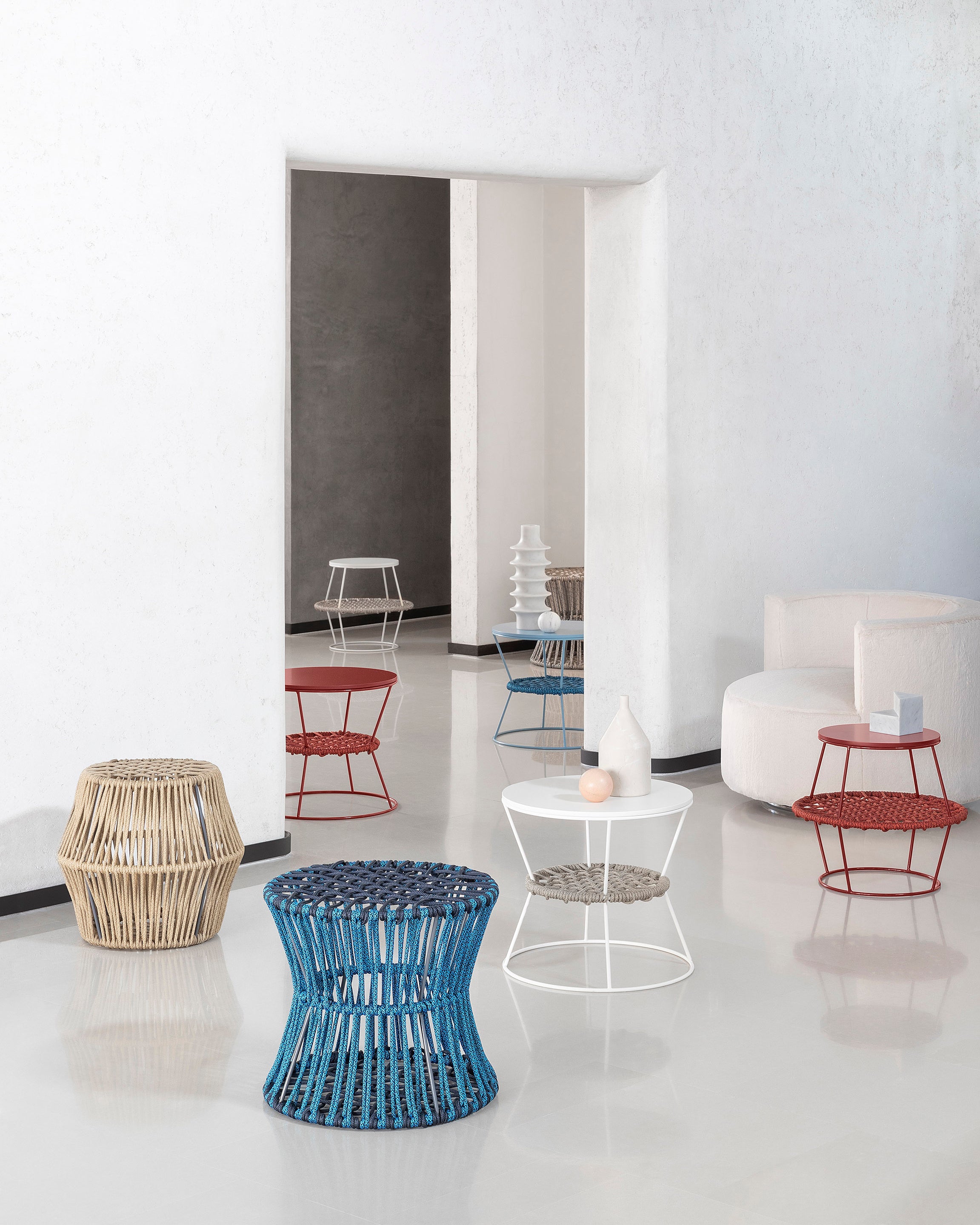 Metall, tre, tau: enkle materialer som gir nytt liv til vanlige gjenstander. Denne kolleksjonen av puffer og salongbord er laget av metallstenger og vevde nautiske tau, blandet sammen som maling på en kunstners palett. Referansen til David Bowies ikoniske Ziggy Stardust er bevisst og gjenspeiler en ironisk revolusjon i tilbehørsmøbler for avslapning. Silhuettene av tønne- og timeglassformer smelter sammen og skaper små øyer som utvider seg. Fargene og volumene forsterkes i kombinasjonen av de blandede fargene på tauverket, og gir en ny idé om tilbehørsmøblering med uendelige muligheter for å tilpasse rommet. Det tofargede flettede tauet er en eksklusiv kombinasjon fra Saba. Kan brukes innendørs og utendørs.