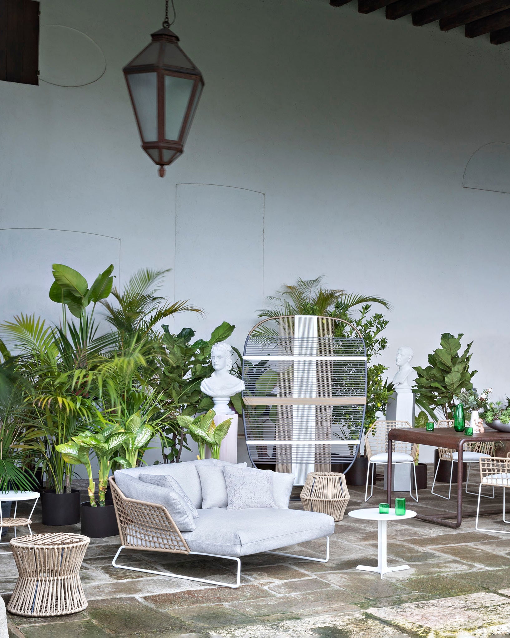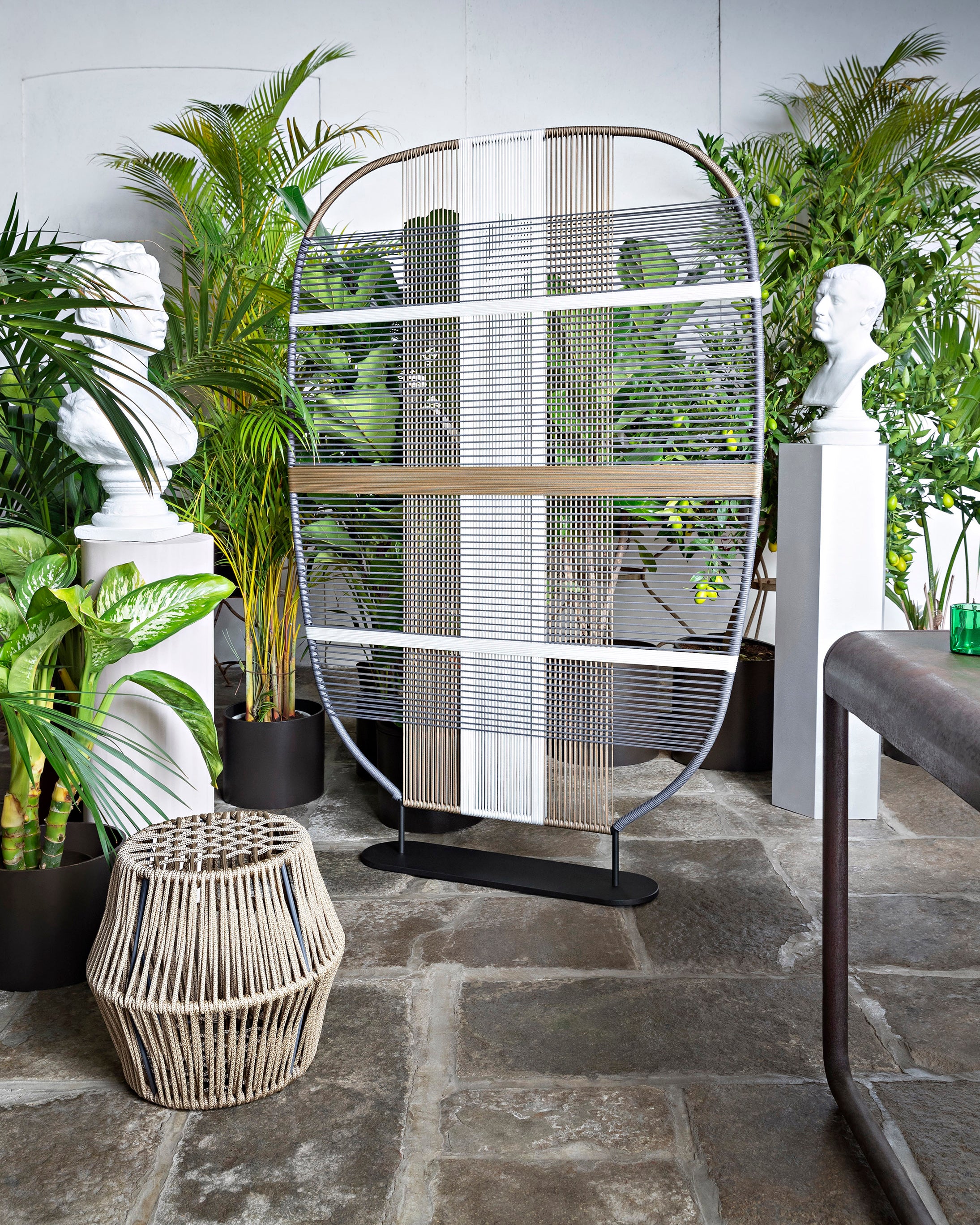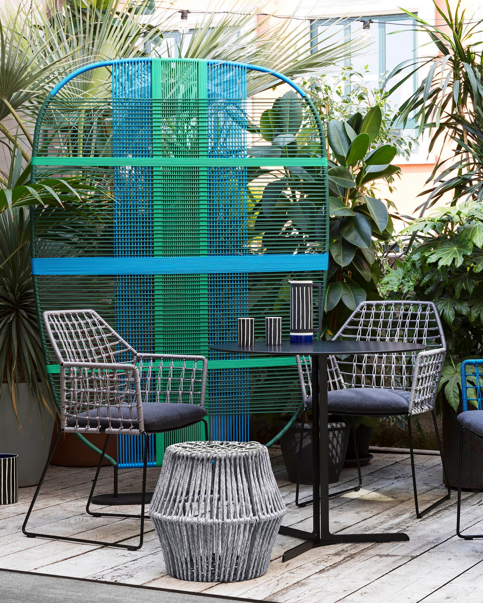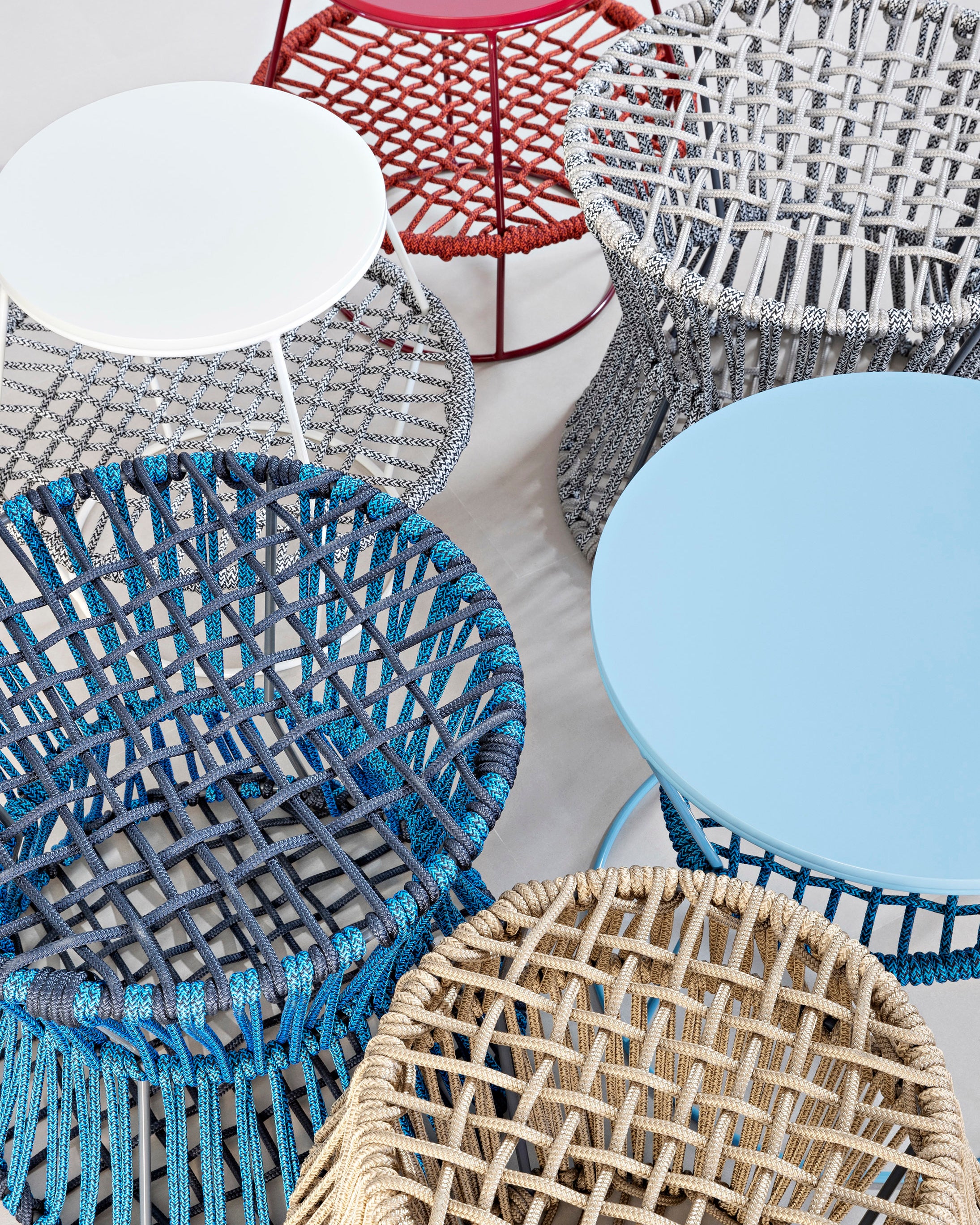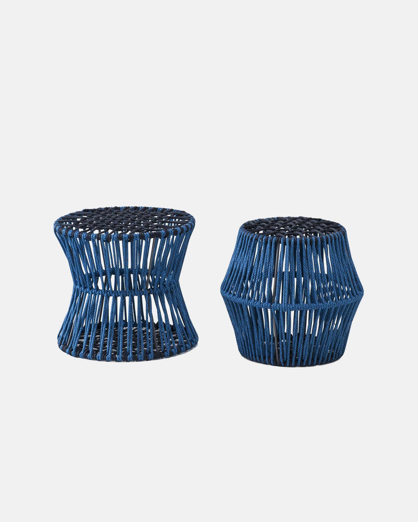 Metall, tre, tau: enkle materialer som gir nytt liv til vanlige gjenstander. Denne kolleksjonen av puffer og salongbord er laget av metallstenger og vevde nautiske tau, blandet sammen som maling på en kunstners palett. Referansen til David Bowies ikoniske Ziggy Stardust er bevisst og gjenspeiler en ironisk revolusjon i tilbehørsmøbler for avslapning. Silhuettene av tønne- og timeglassformer smelter sammen og skaper små øyer som utvider seg. Fargene og volumene forsterkes i kombinasjonen av de blandede fargene på tauverket, og gir en ny idé om tilbehørsmøblering med uendelige muligheter for å tilpasse rommet. Det tofargede flettede tauet er en eksklusiv kombinasjon fra Saba. Kan brukes innendørs og utendørs.