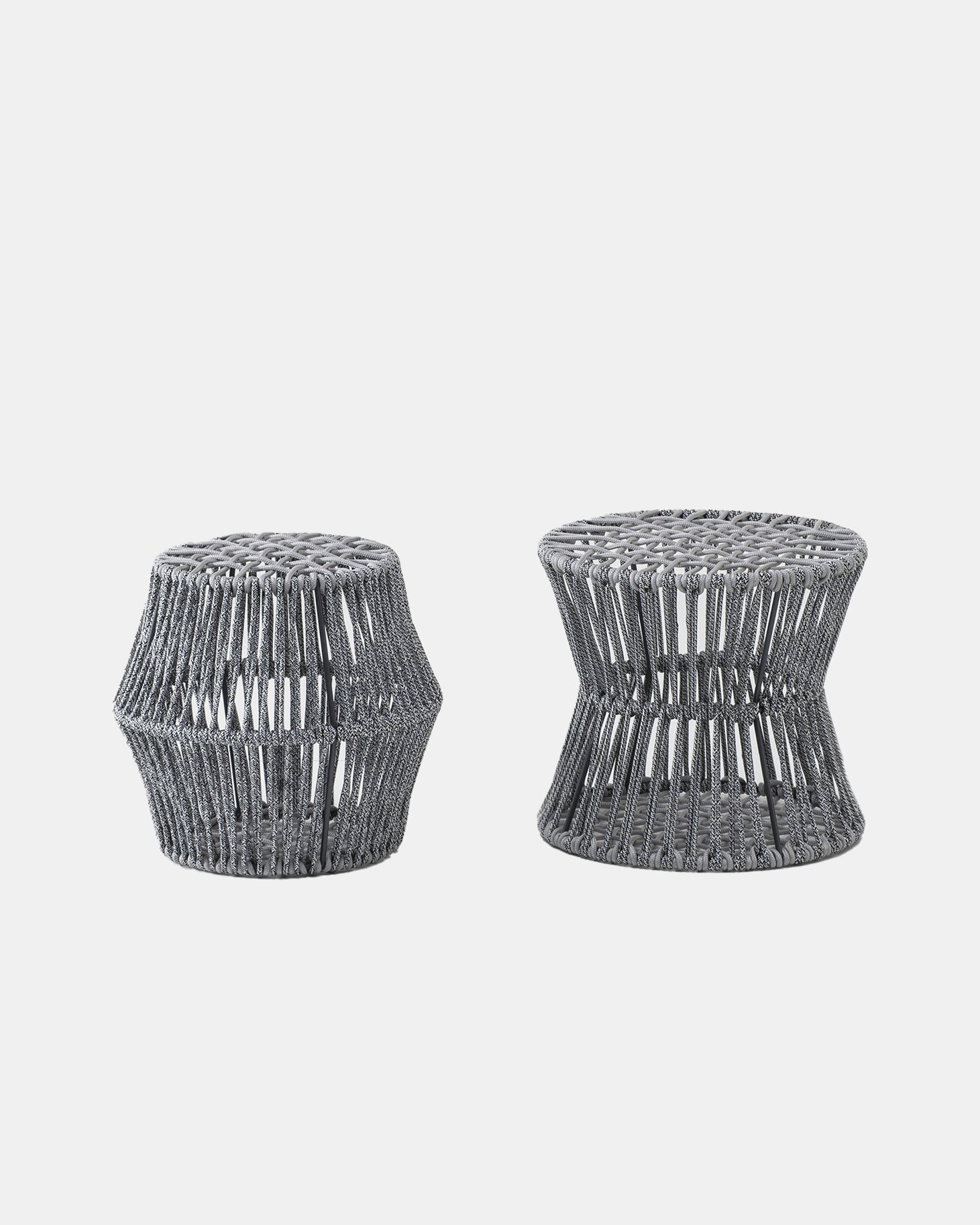 Struktur: Laget av lakkert ståltråd med en diameter på 8 mm, og flettet polyester tau med en diameter på 6 mm. Overflaten på det lave bordet er av MDF med en lakkert finish, 19 mm tykkelse. Møbelet er egnet for utendørs bruk.