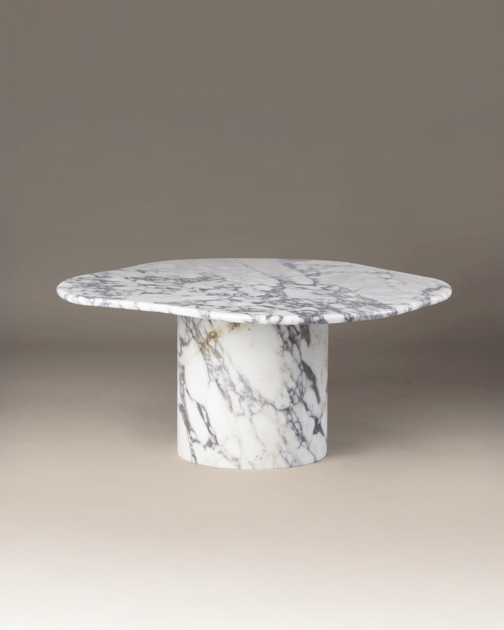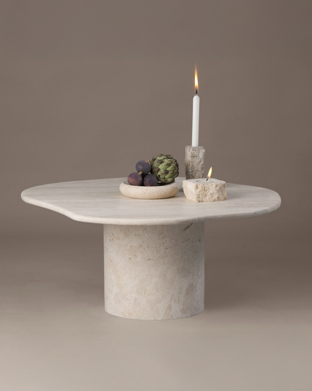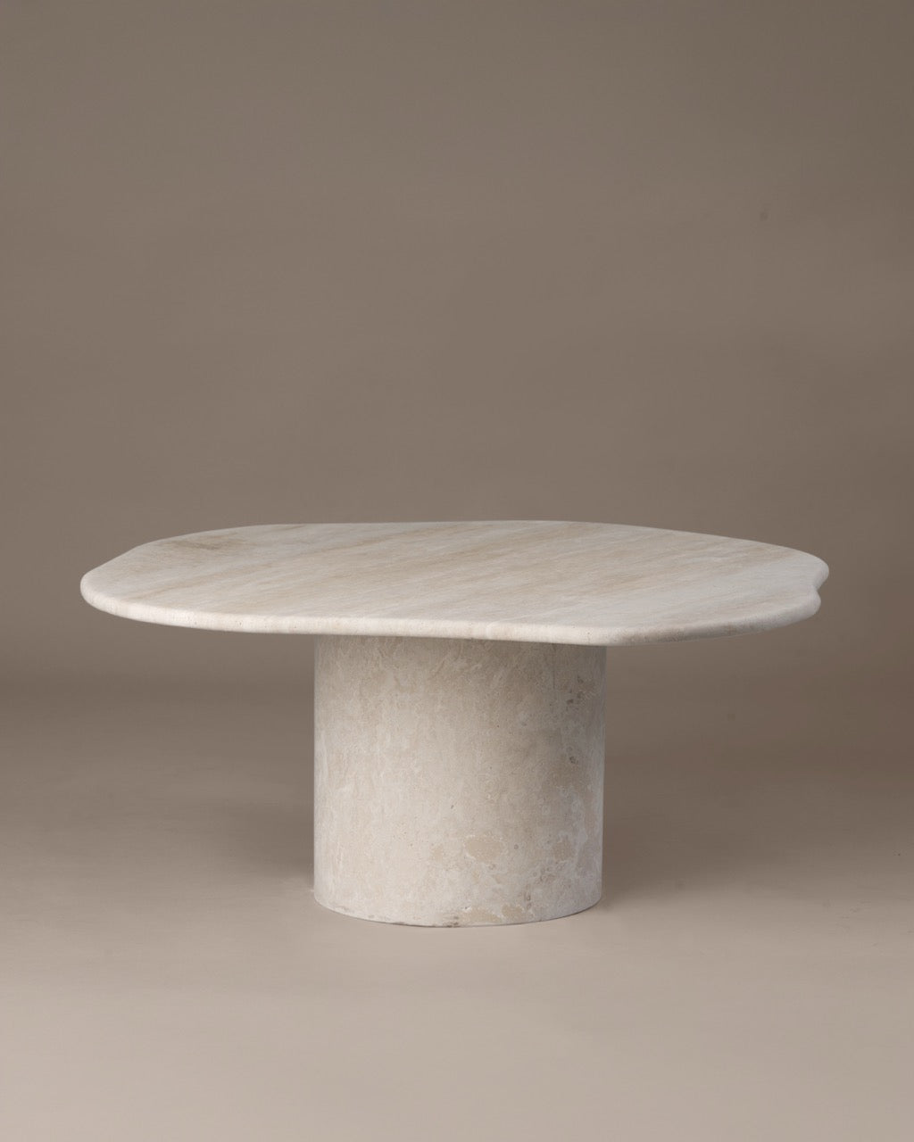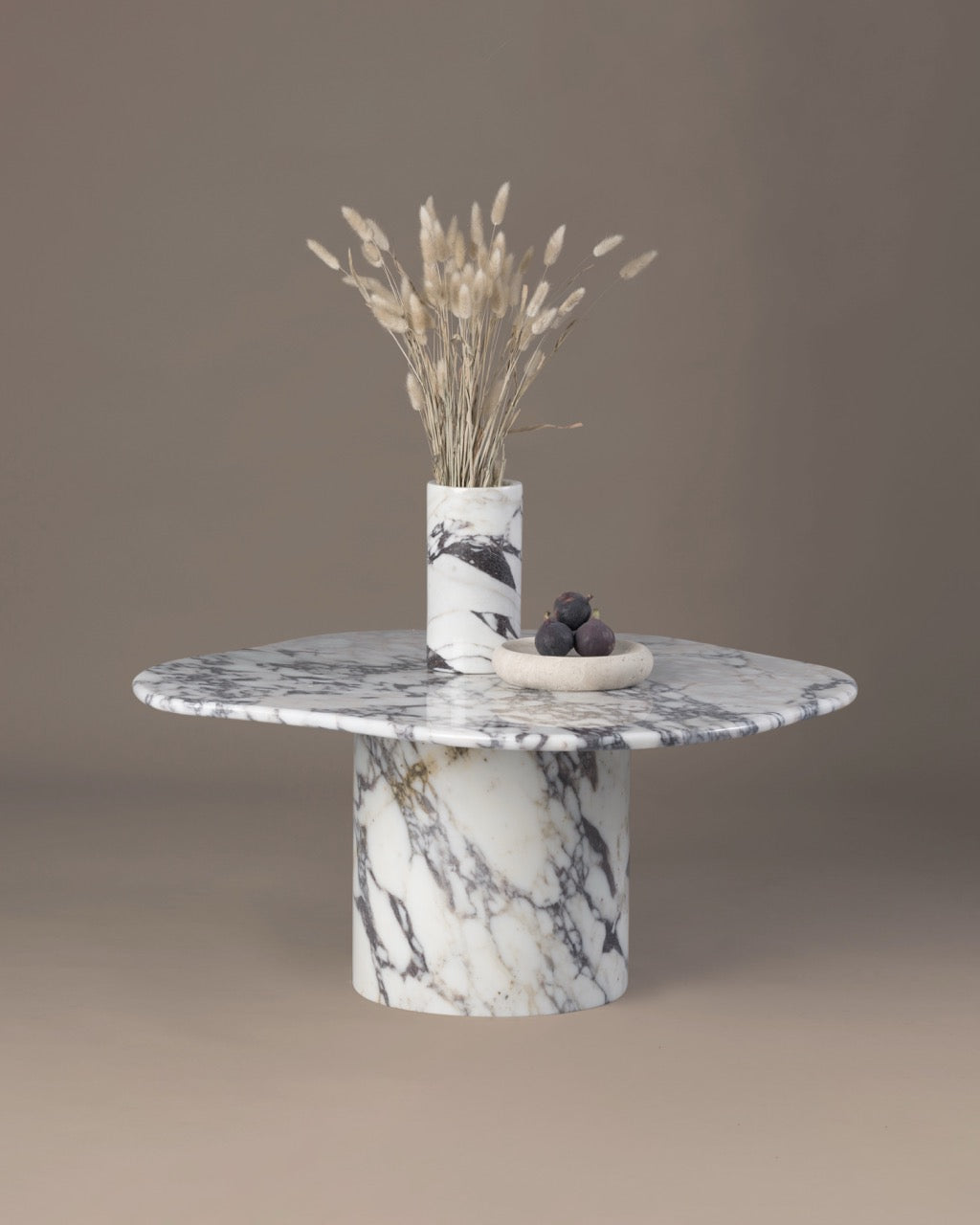 Tilgjengelig i eksklusiv travertin og Calacatta Viola-marmor, kombinerer Flusso skulpturell design med praktisk funksjonalitet. Hvert bord er unikt, med naturlige variasjoner i farge og mønster, som gir det en karakter og sjarm som bare ekte naturmaterialer kan tilby.