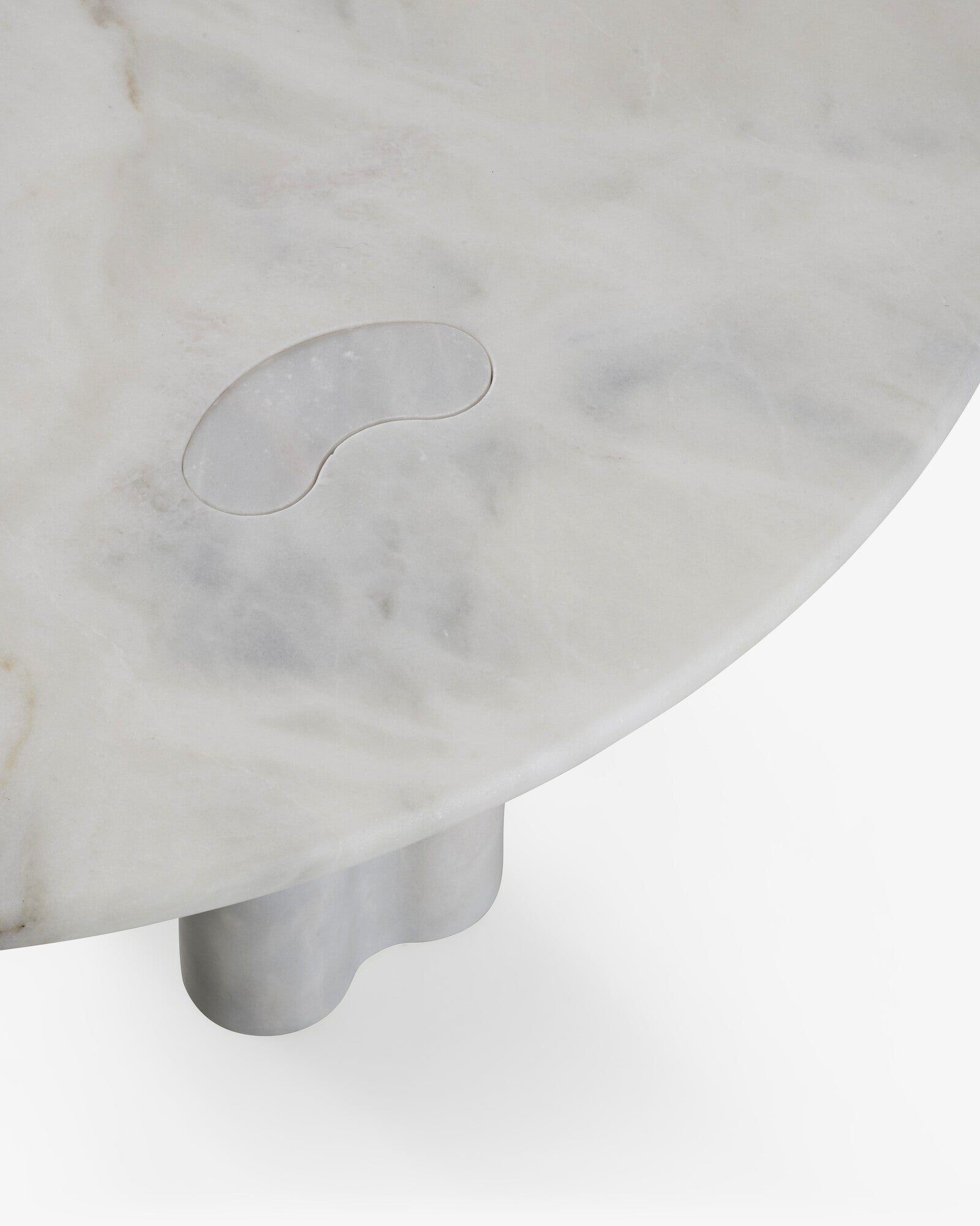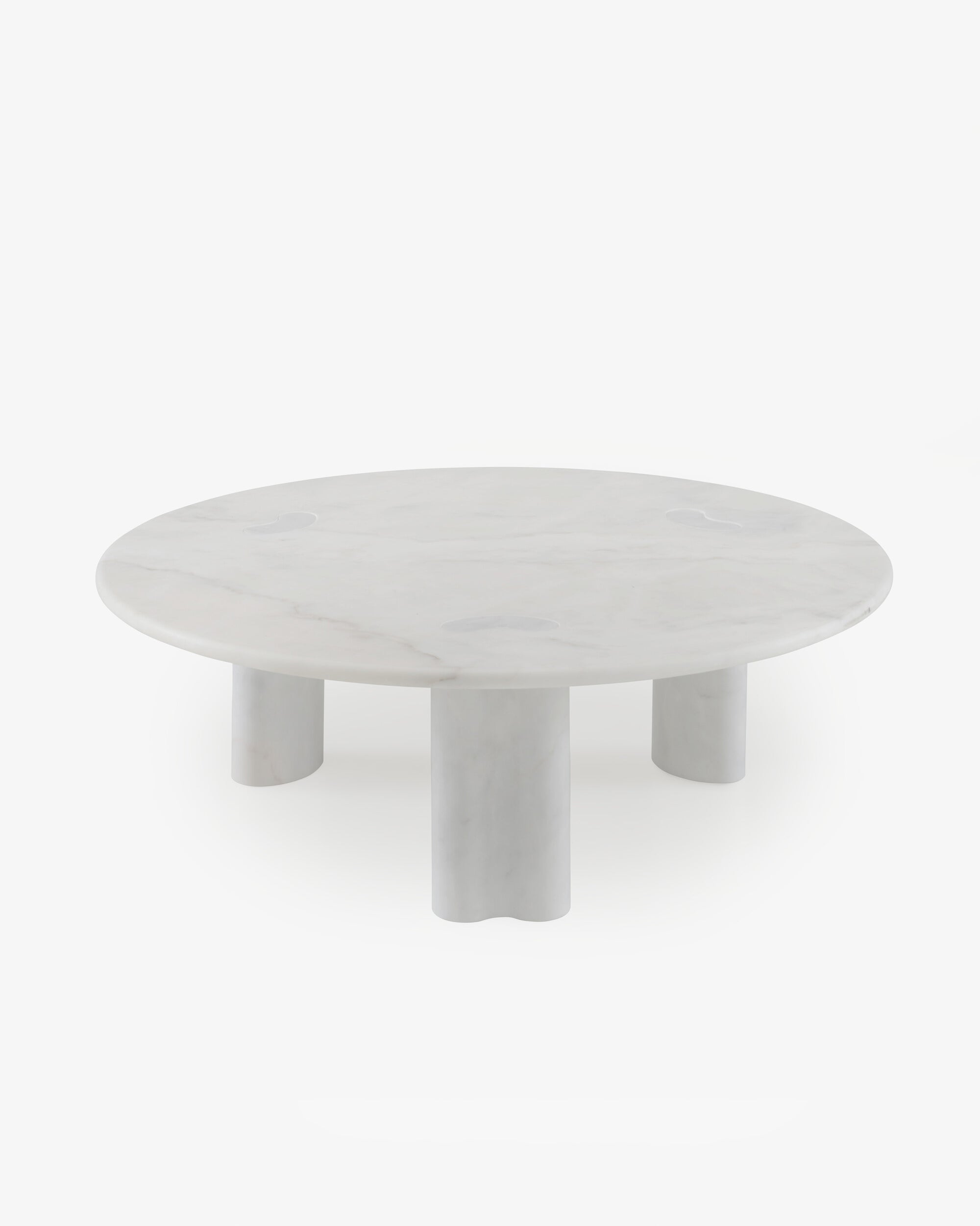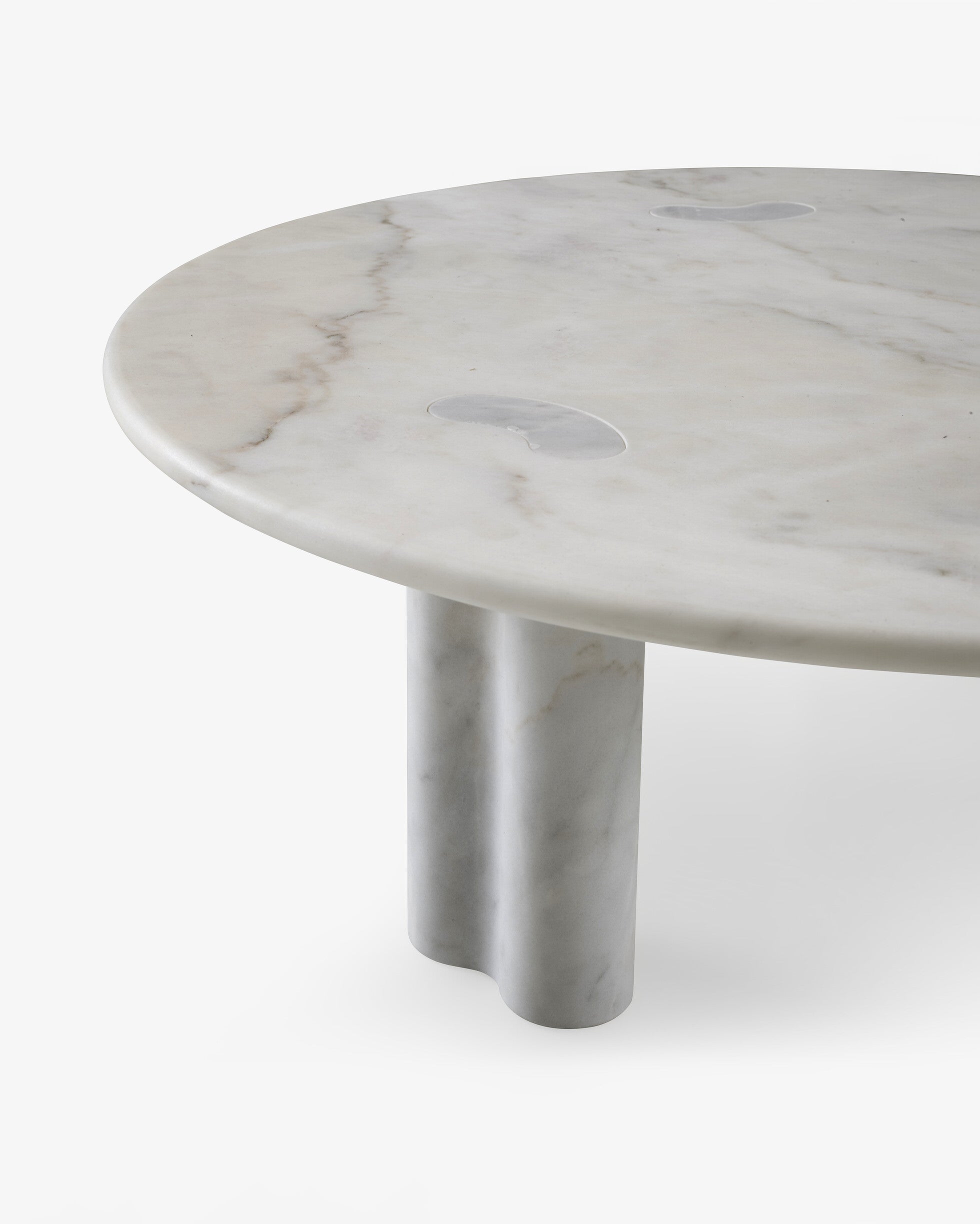 Lavt bord i hvit Estremoz marmor med finslipt finish, som har vært igjennom en vannavvisende behandling. De bønneformede bena er forsenket og vises på oversiden av toppen som er en fin detalj i designet. Platen på bordet er avrundet og 2 cm tykk. Hvert ben er uavhengig og festet under toppen ved hjelp av en metallplate.