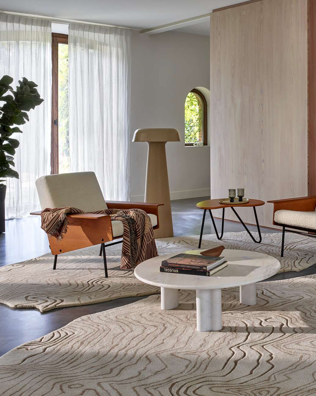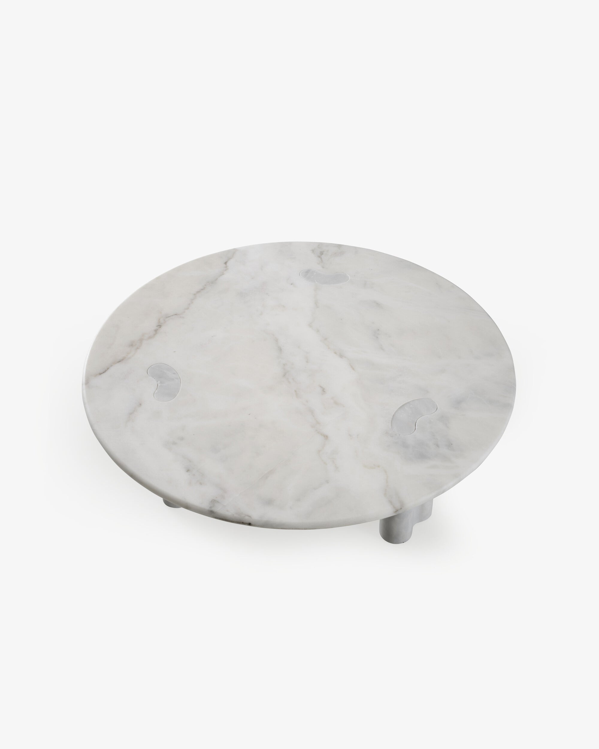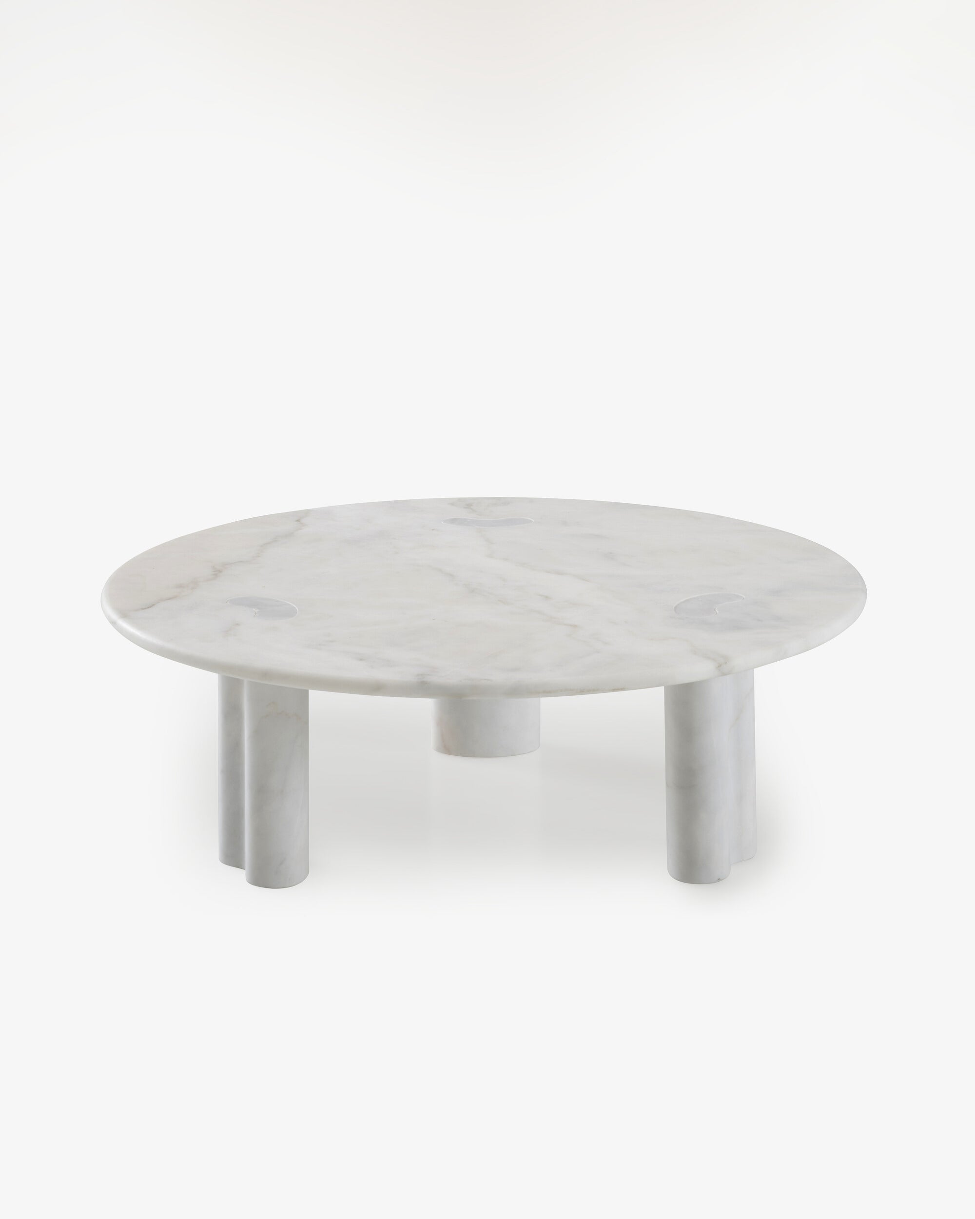 Lavt bord i hvit Estremoz marmor med finslipt finish, som har vært igjennom en vannavvisende behandling. De bønneformede bena er forsenket og vises på oversiden av toppen som er en fin detalj i designet. Platen på bordet er avrundet og 2 cm tykk. Hvert ben er uavhengig og festet under toppen ved hjelp av en metallplate.