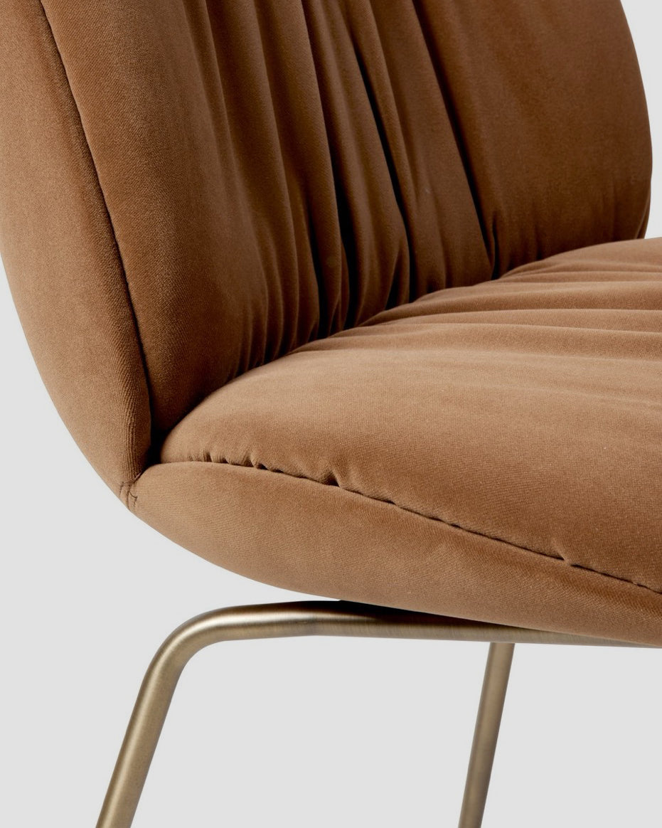 Beetle Soft kan tilpasses med et bredt spekter av tekstiler, blant annet GUBIs eksklusive Fustagno, en italiensk vevd bomullsfløyel med rik tekstur og retro-inspirert uttrykk. Stolen deler base og konstruksjon med resten av Beetle-kolleksjonen, inkludert de karakteristiske koniske bena. Den er dessuten GreenGuard Gold-sertifisert, noe som sikrer lave utslipp og et sunnere innemiljø.