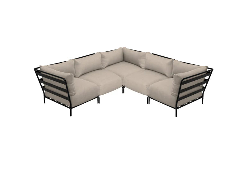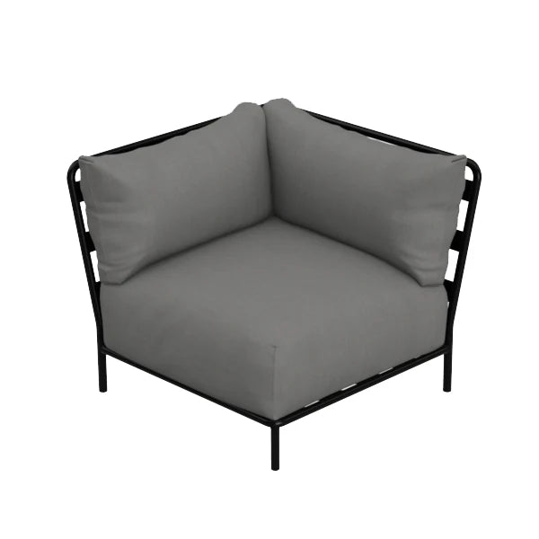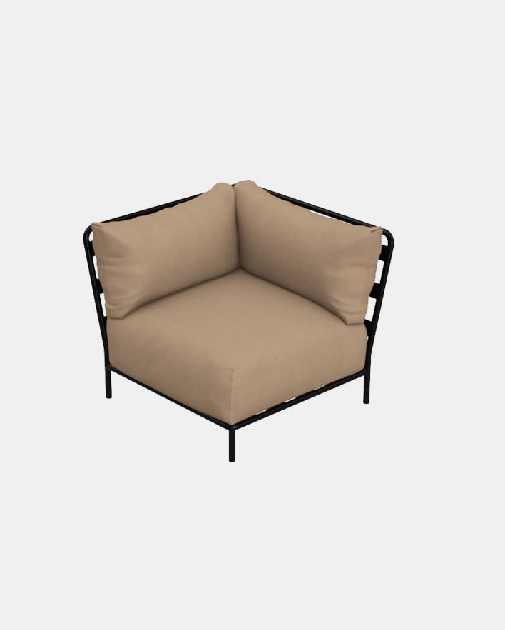 BRICK hjørnemodul er en elegant utendørs sofakomponent, med en pulverlakkert ramme i rustfritt stål og tre puter.