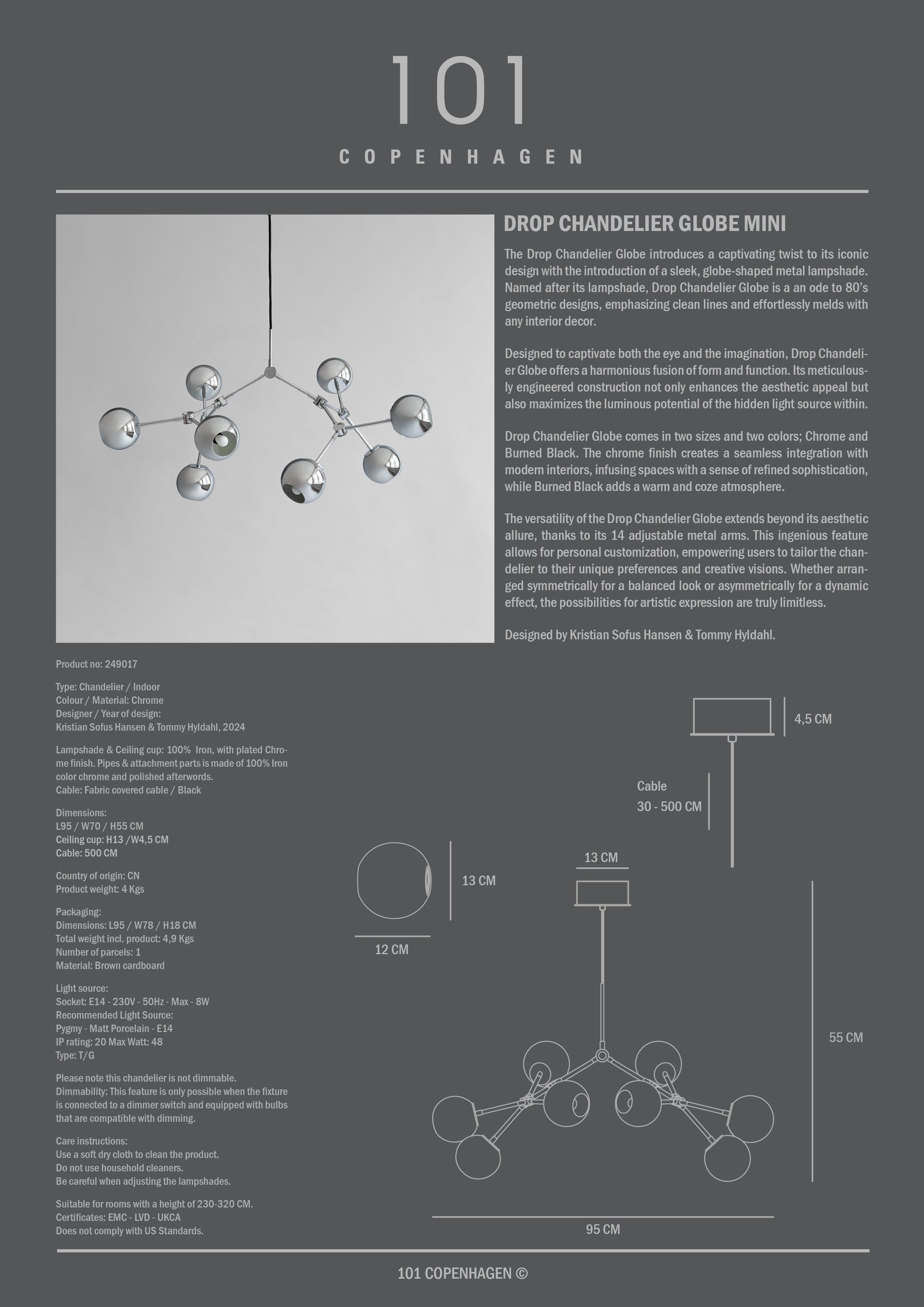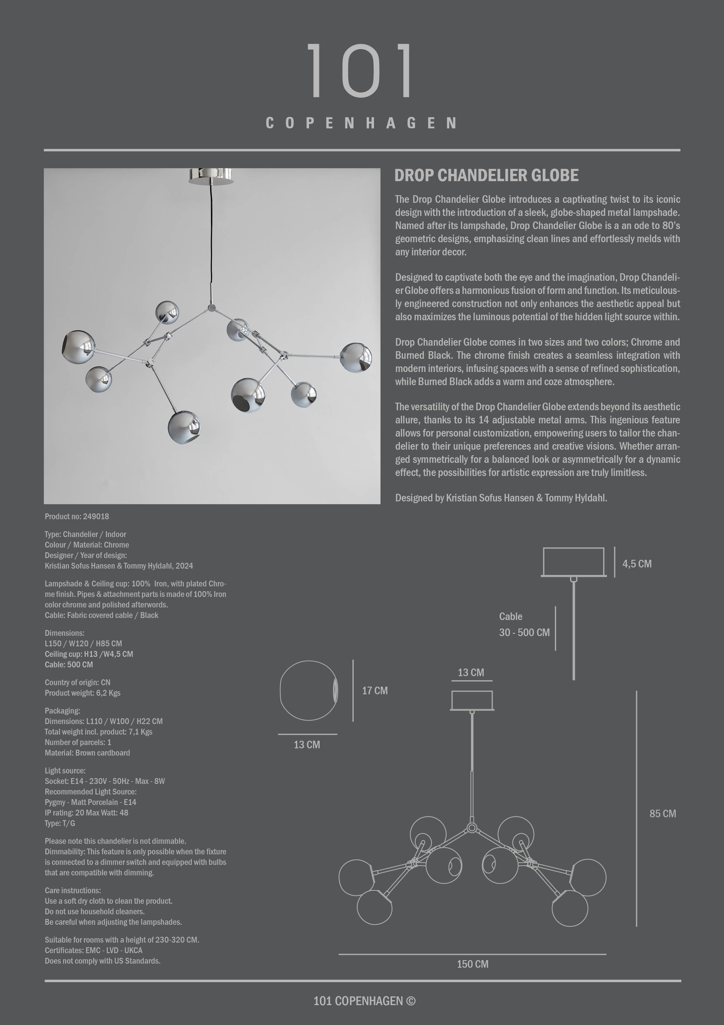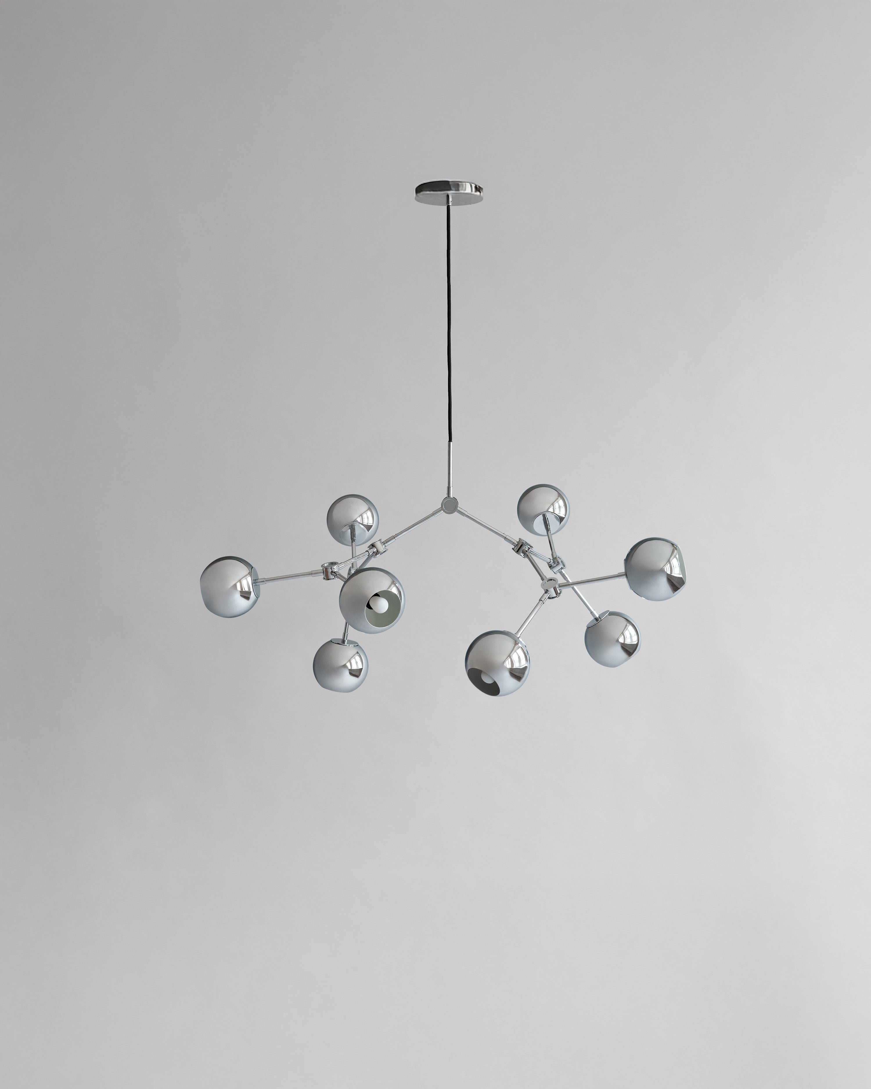 Drop Chandelier Globe introduserer en fengslende vri på sin ikoniske design med introduksjonen av en elegant, globusformet metalllampeskjerm. Drop Chandelier Globe er oppkalt etter lampeskjermen, og er en link til 80-tallets geometriske design, som legger vekt på rene linjer og en fascinerende kromfinish som enkelt smelter sammen med enhver interiørdekor, samtidig som den subtilt reflekterer omgivelsene.