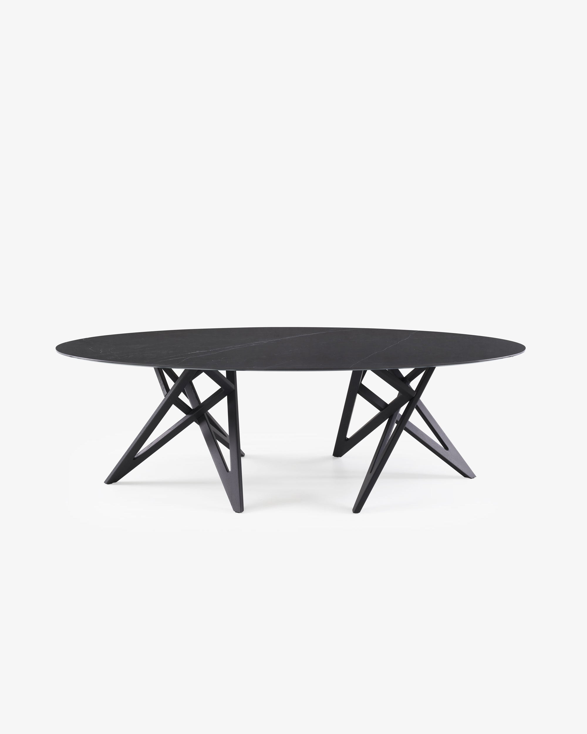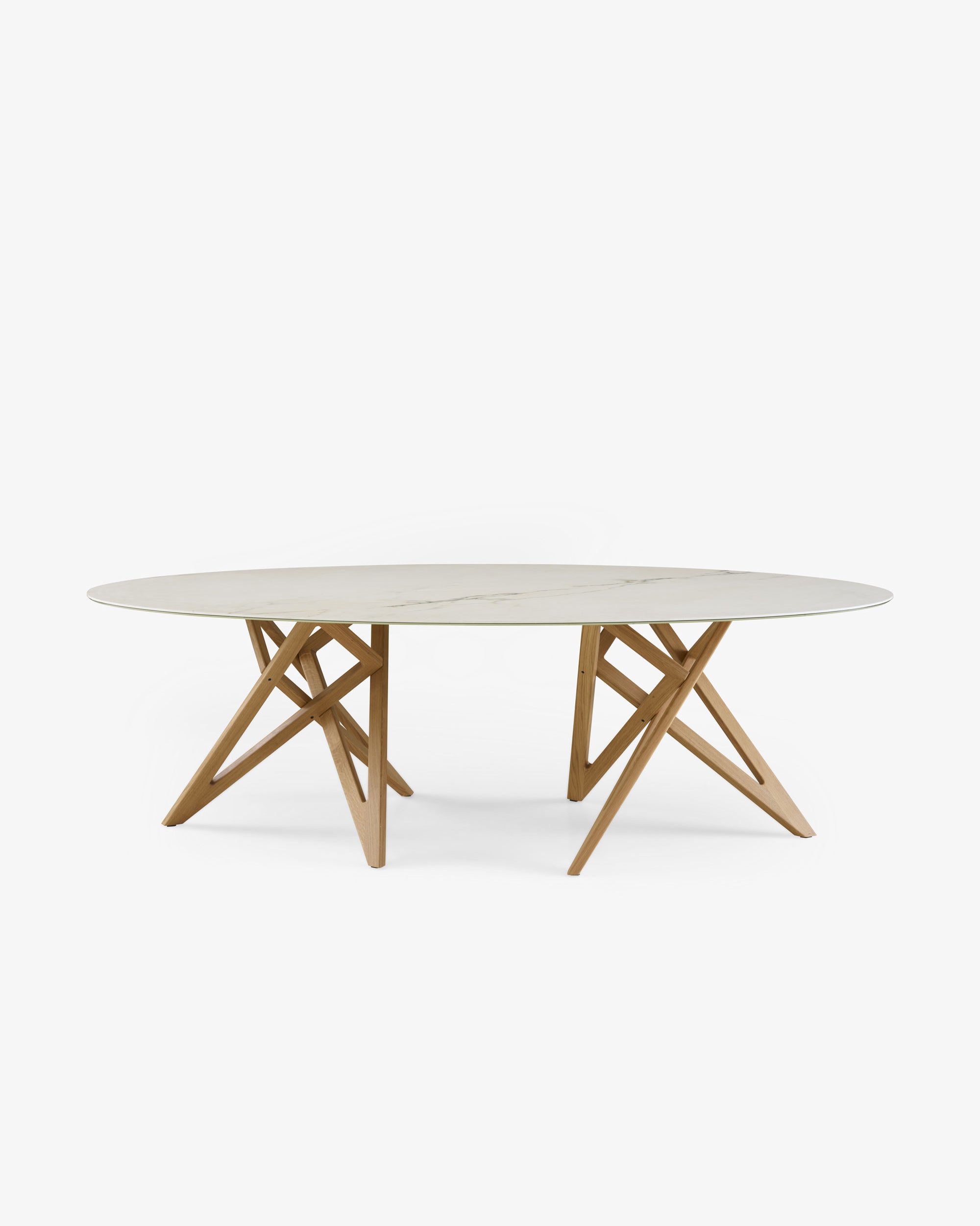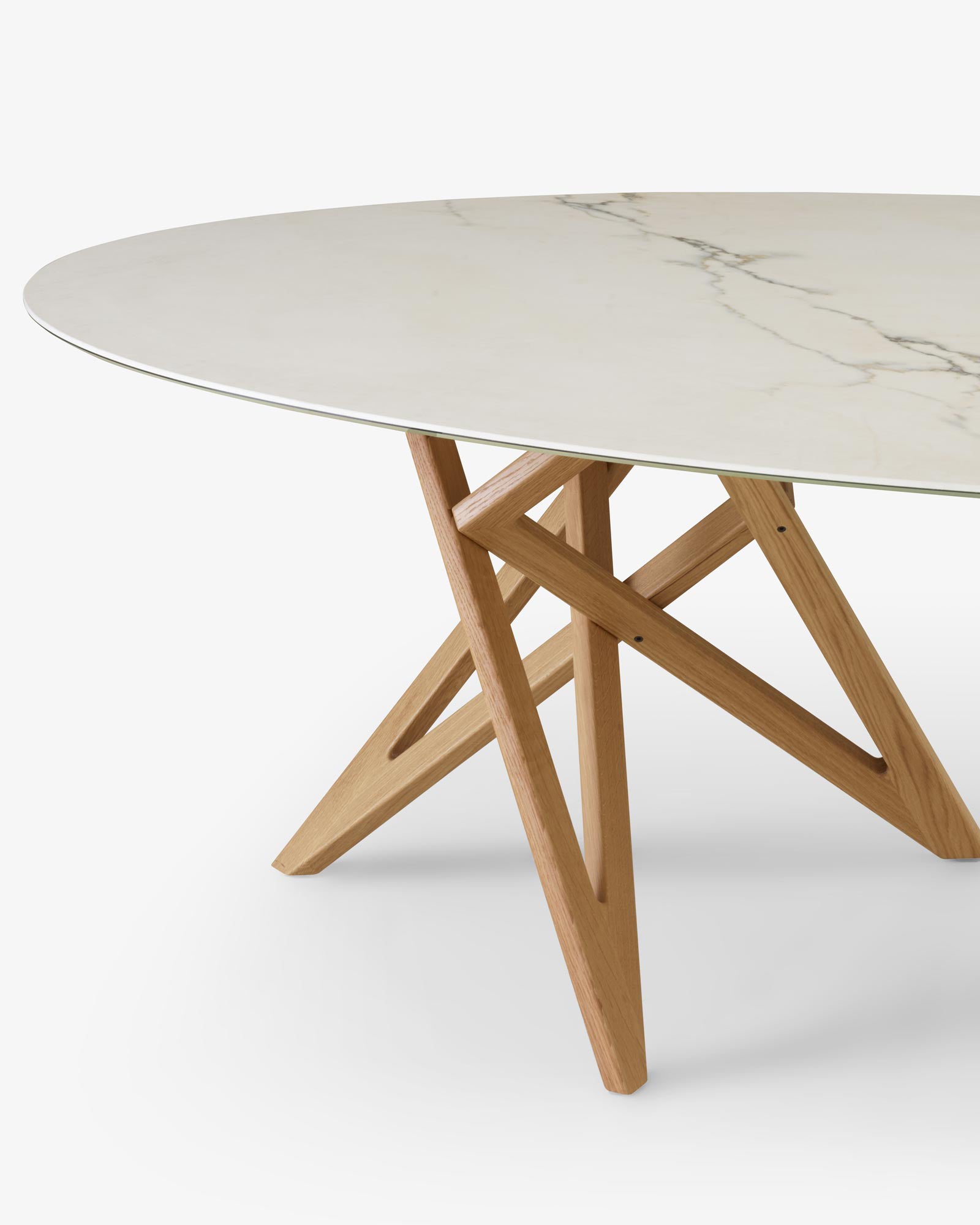 Ennea spisebord er et uttrykk for raffinert geometri og balanse. Navnet “Ennea,” som betyr ni på gresk, gjenspeiles i basens design: tre identiske “rektangulære” trekanter i solid ask som skaper ni vektorer i rommet. Denne unike pyramidestrukturen minner om en krystall og balanserer letthet og styrke på en sofistikert måte.