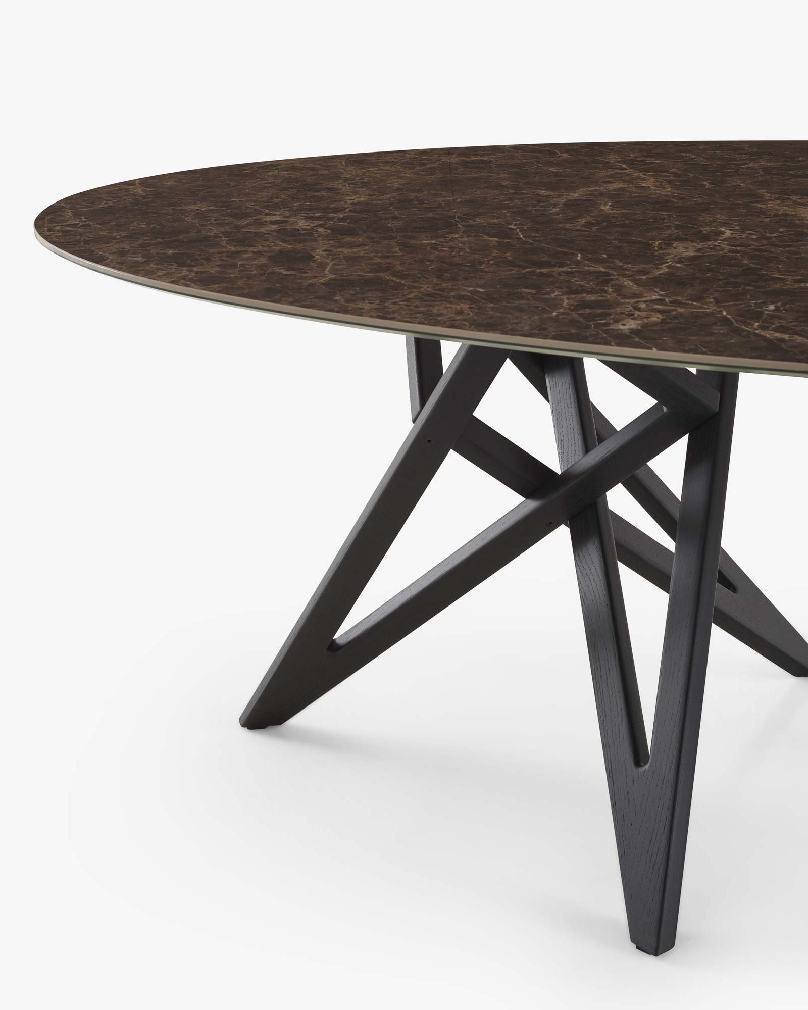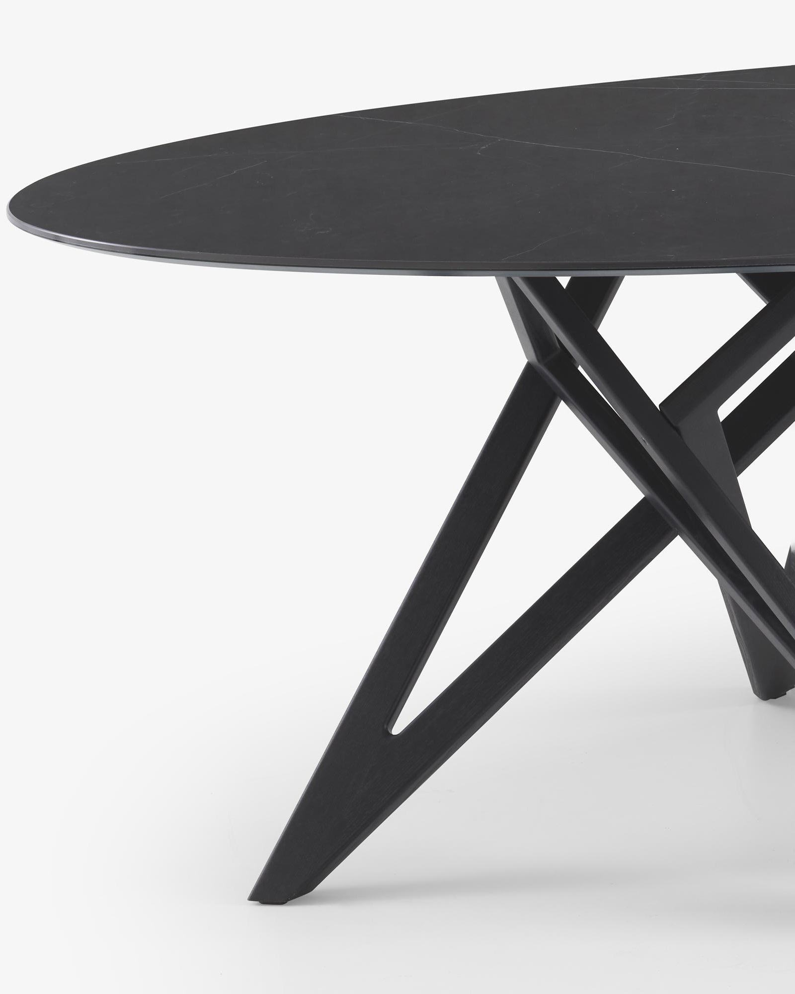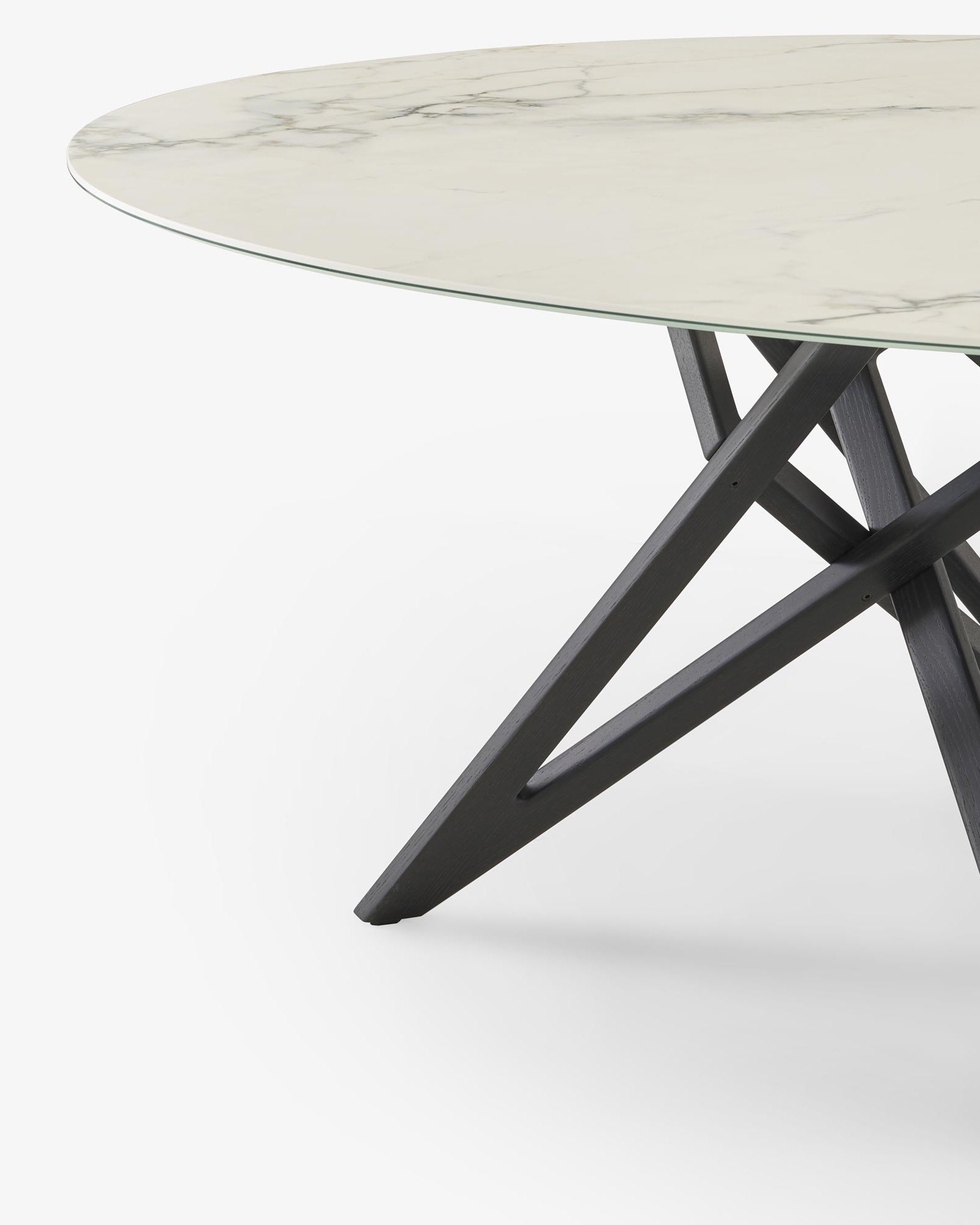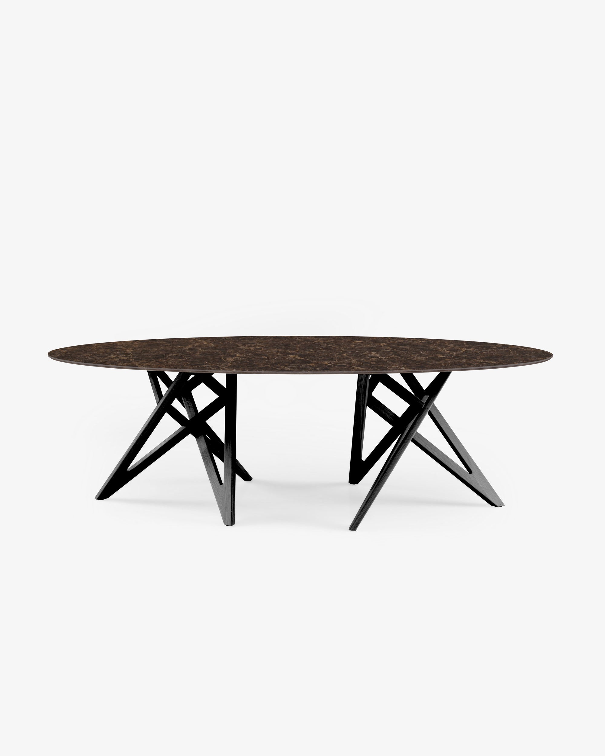 Ennea spisebord er et uttrykk for raffinert geometri og balanse. Navnet “Ennea,” som betyr ni på gresk, gjenspeiles i basens design: tre identiske “rektangulære” trekanter i solid ask som skaper ni vektorer i rommet. Denne unike pyramidestrukturen minner om en krystall og balanserer letthet og styrke på en sofistikert måte.