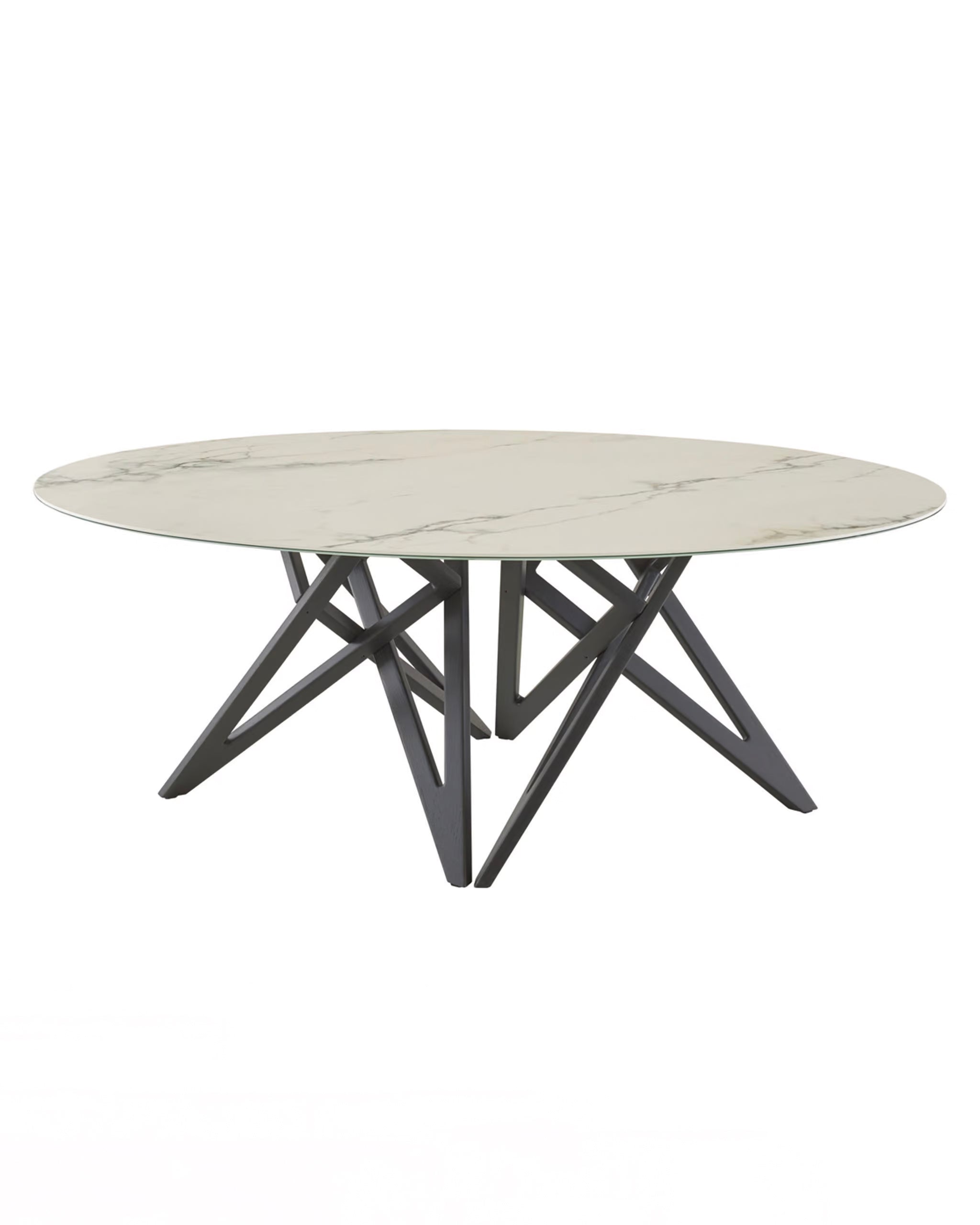 Bordplaten består av hvit marmoreffekt steingods eller Marquinia steingods, 1/4” (6 mm) tykk, limt til en 1/2” (10 mm) tykk glassplate for en total tykkelse på 3/4” (16 mm). Den kombinerer slitestyrke med en estetisk finish som er både tidløs og moderne. Dette bordet forener funksjonalitet med et imponerende og balansert design, som passer perfekt inn i stilrene interiører.