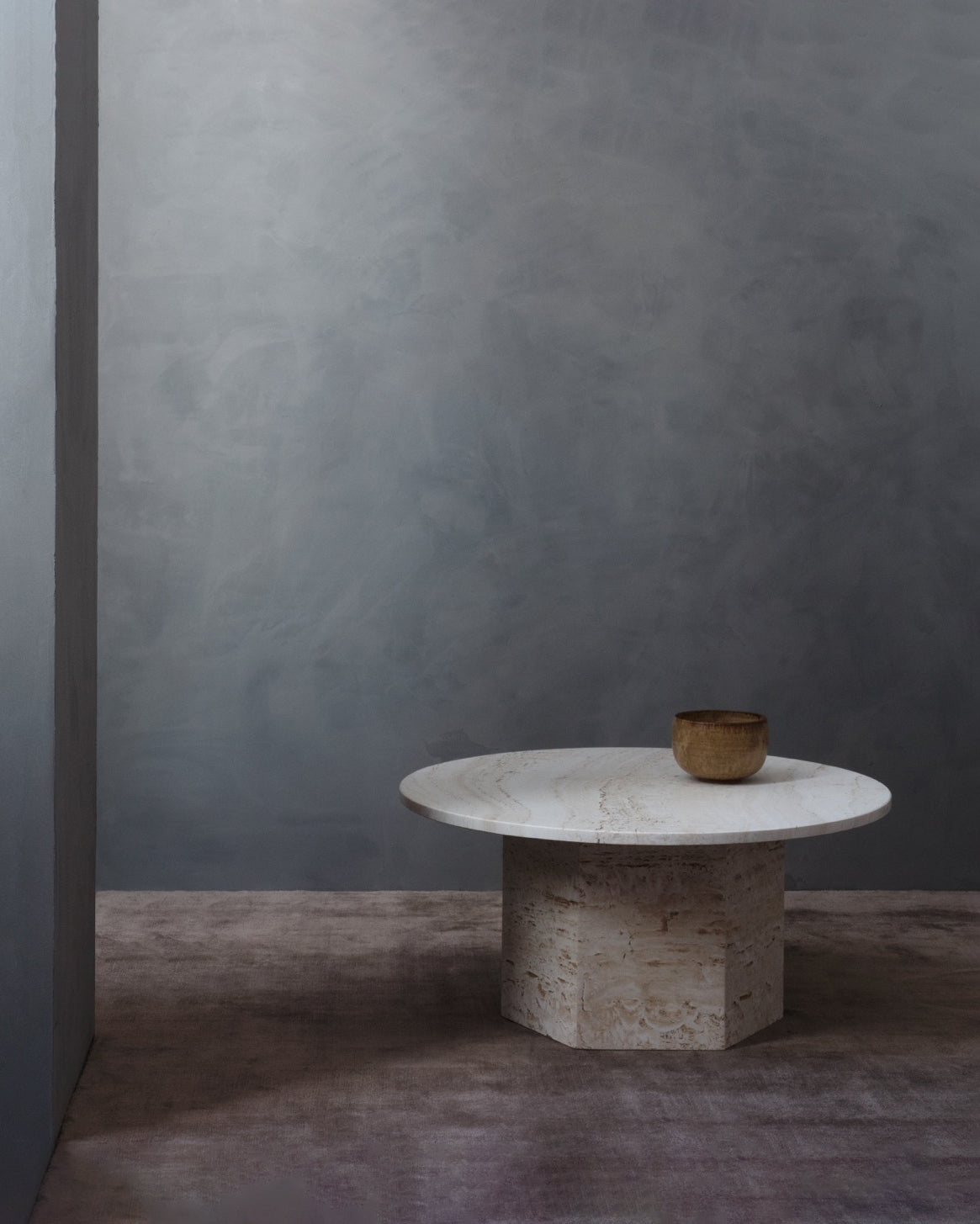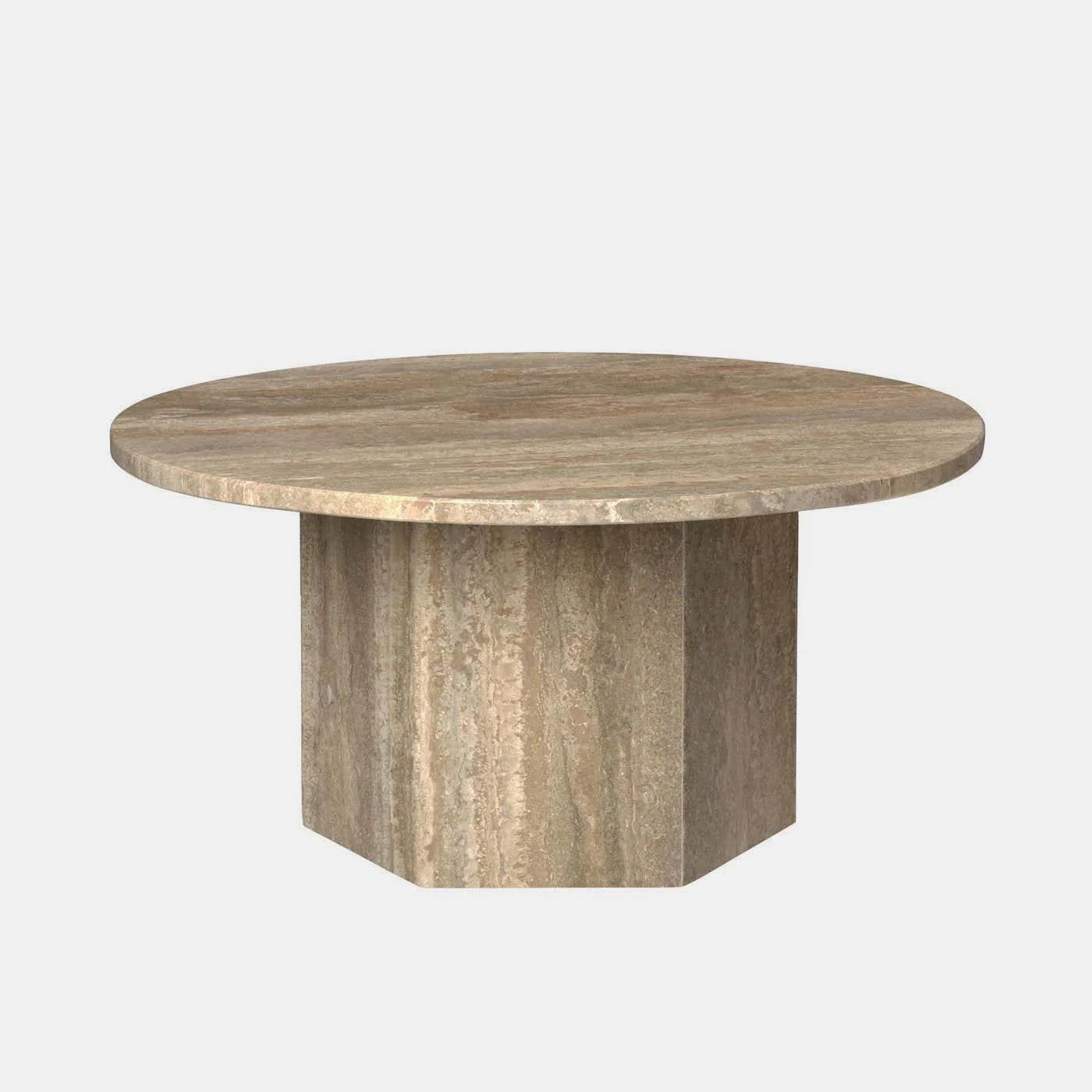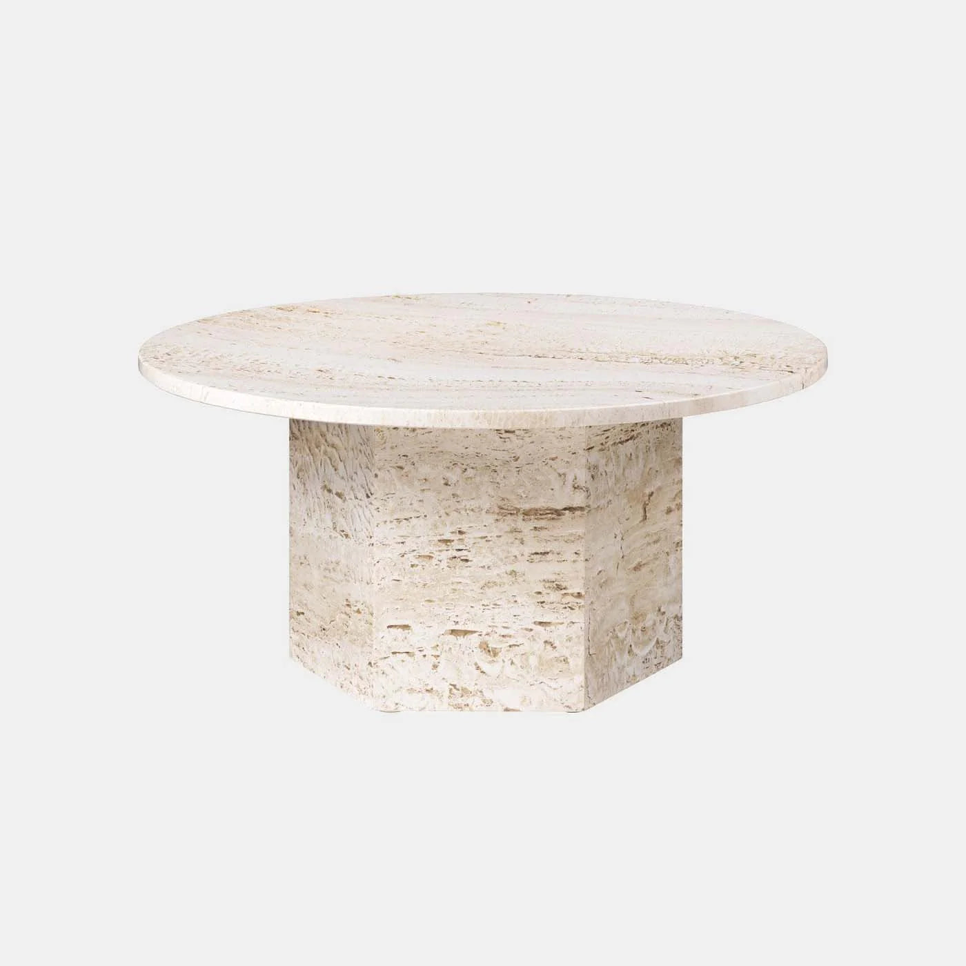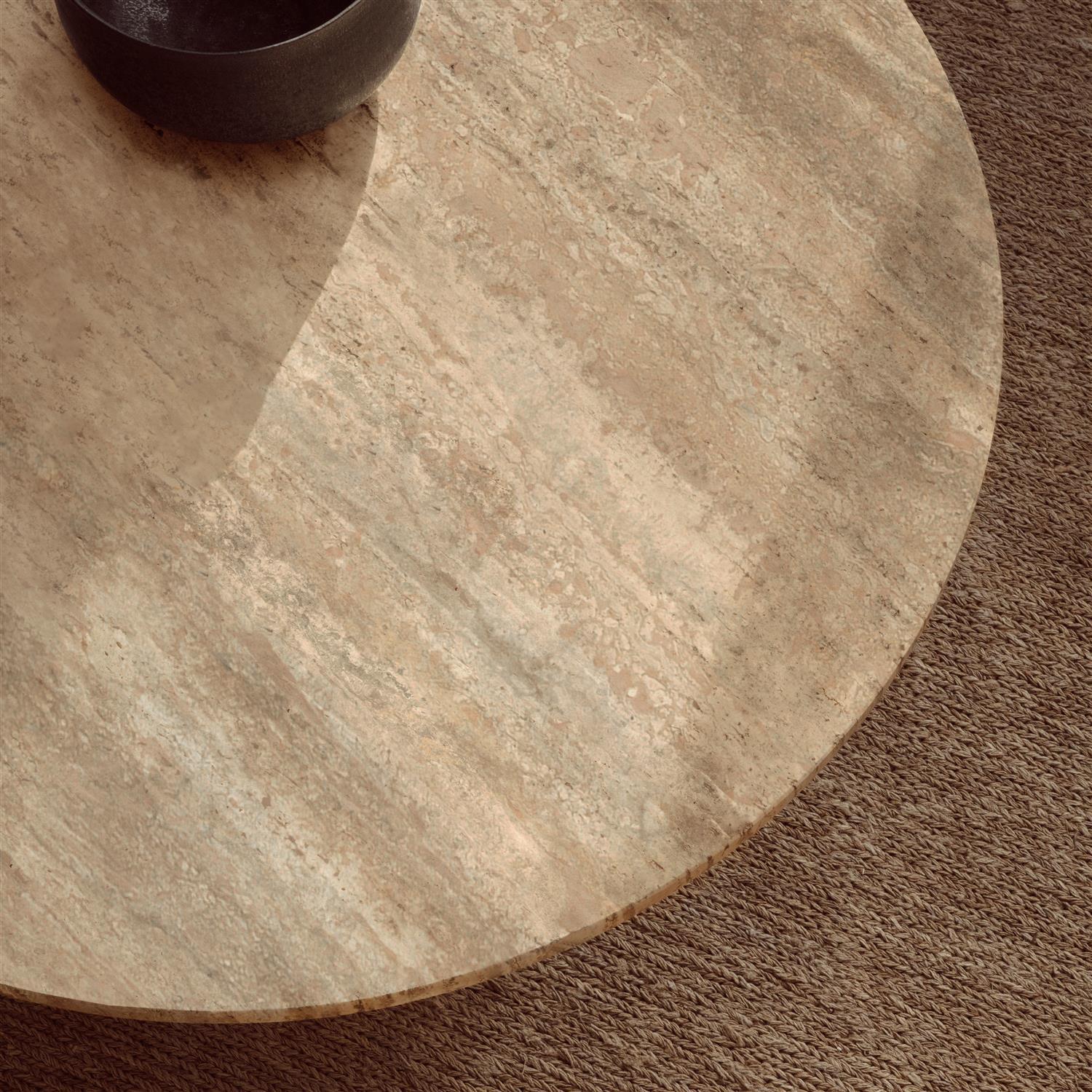 Laget i Italia av travertinstein, fremhever det bordets naturlige skjønnhet med livlige årer, tekstur og en unik patina. Den monolittiske formen består av en kombinasjon av to enkle geometriske figurer – sirkelen og sekskanten – med referanser til ikoniske travertinkonstruksjoner som Colosseum og Peterskirken i Roma.