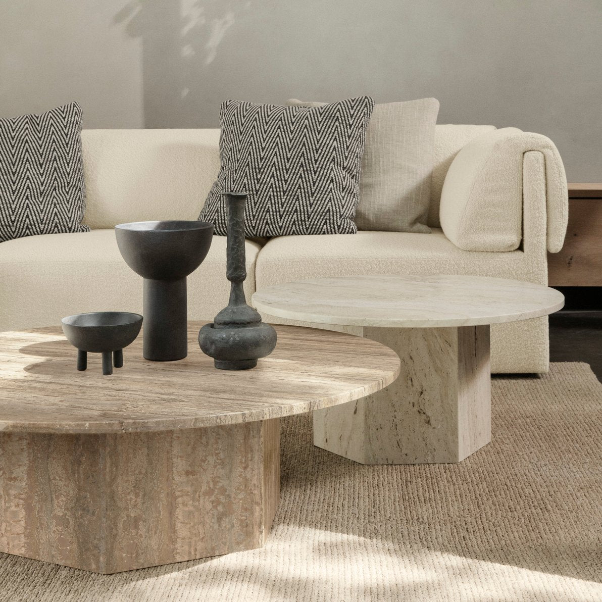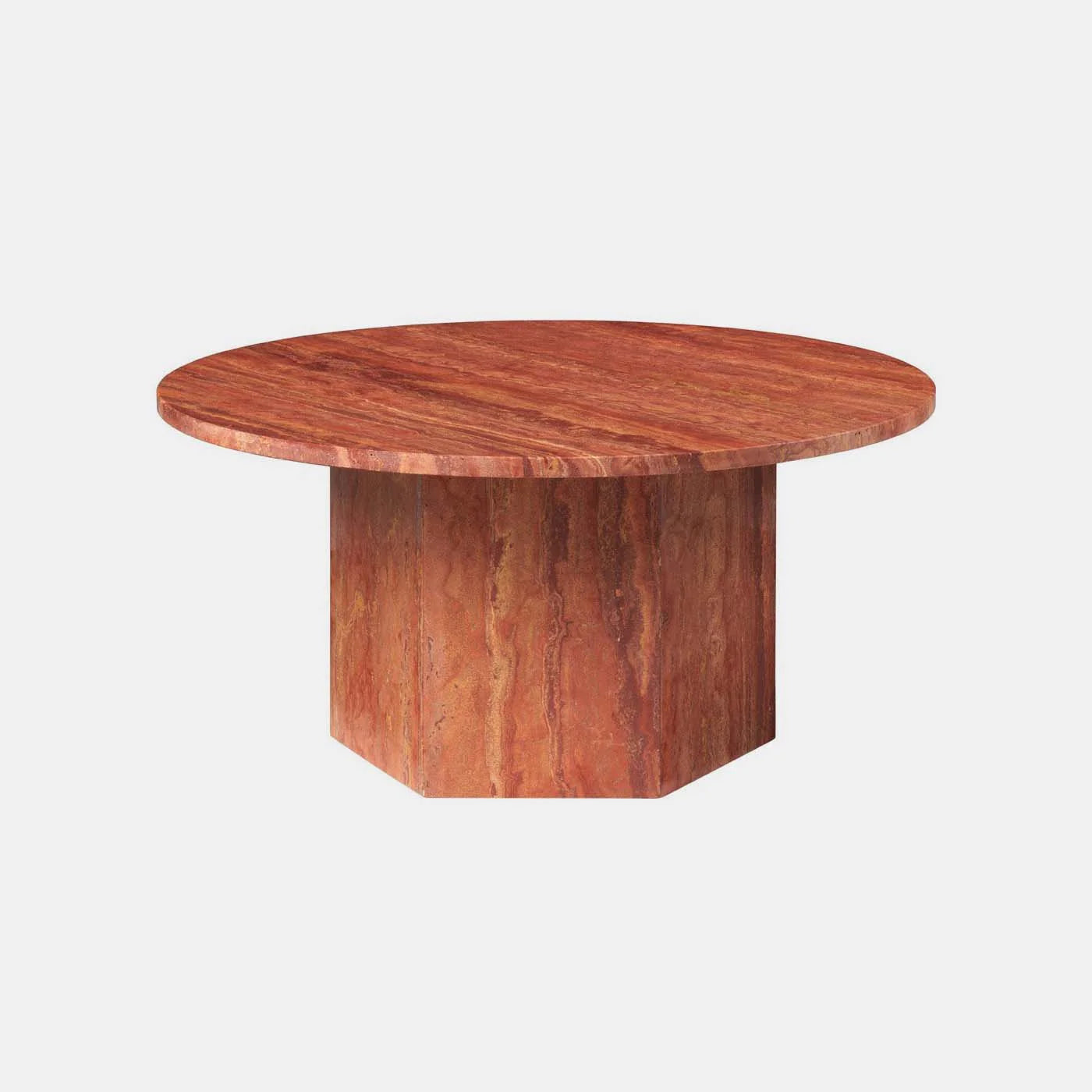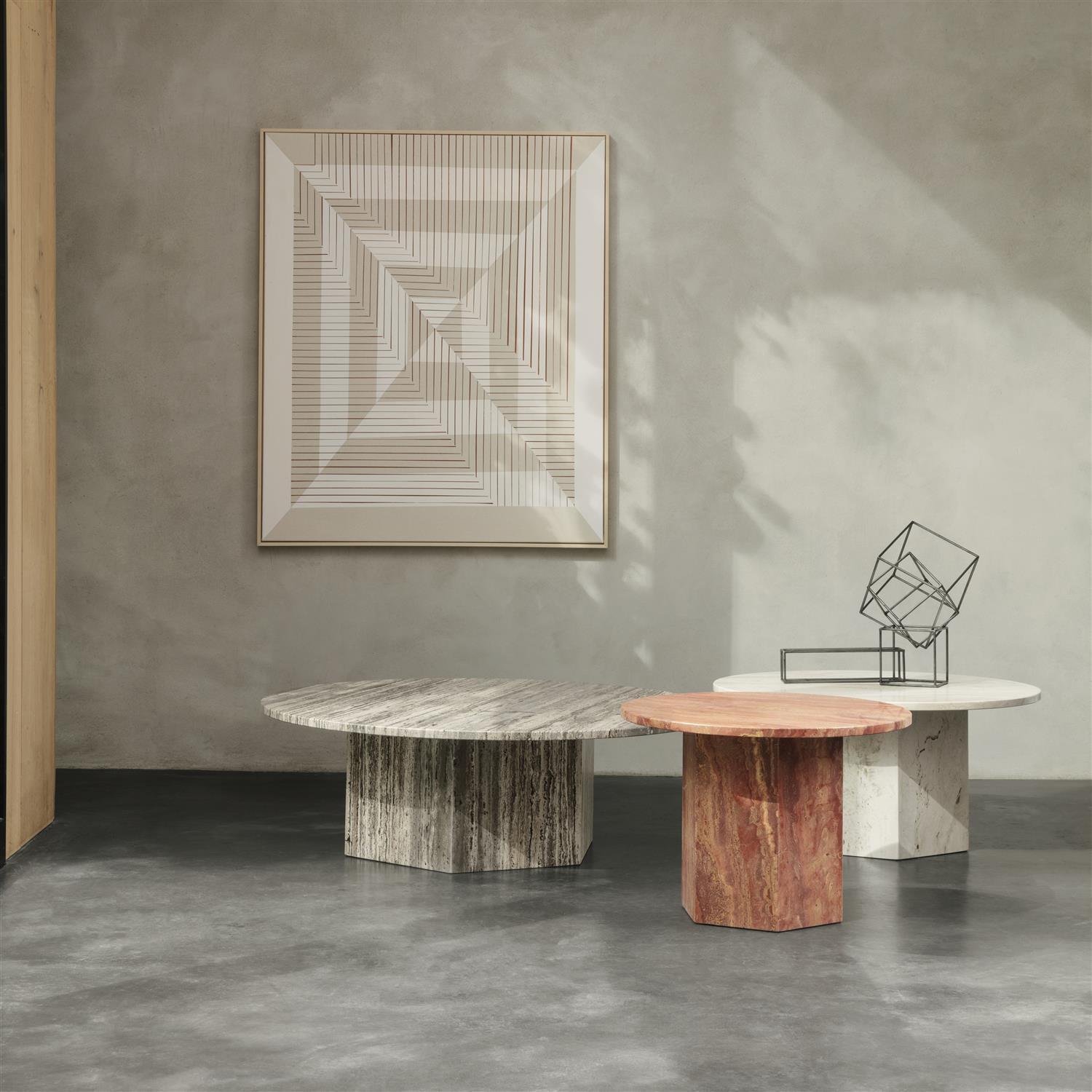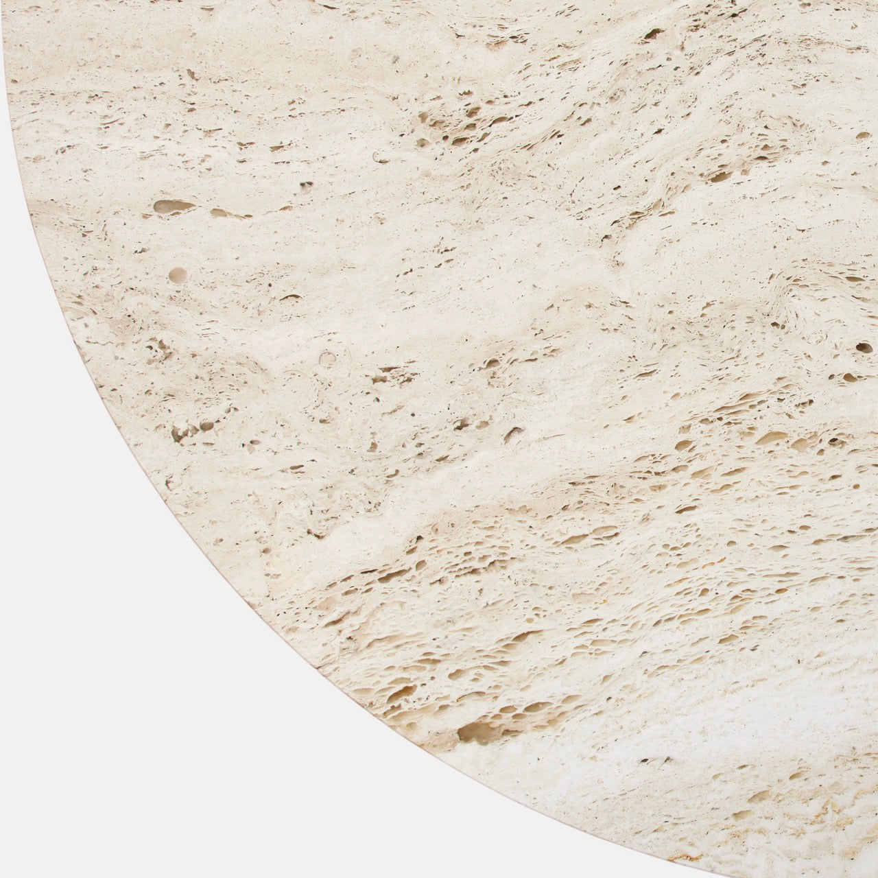 Laget i Italia av travertinstein, fremhever det bordets naturlige skjønnhet med livlige årer, tekstur og en unik patina. Den monolittiske formen består av en kombinasjon av to enkle geometriske figurer – sirkelen og sekskanten – med referanser til ikoniske travertinkonstruksjoner som Colosseum og Peterskirken i Roma.