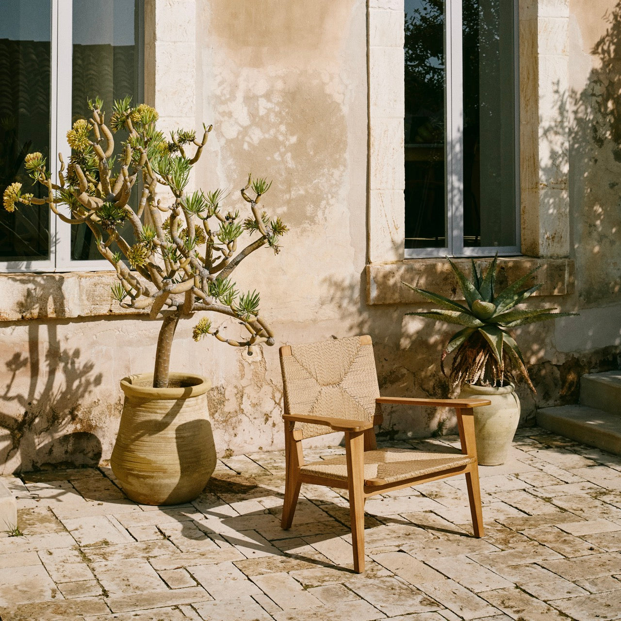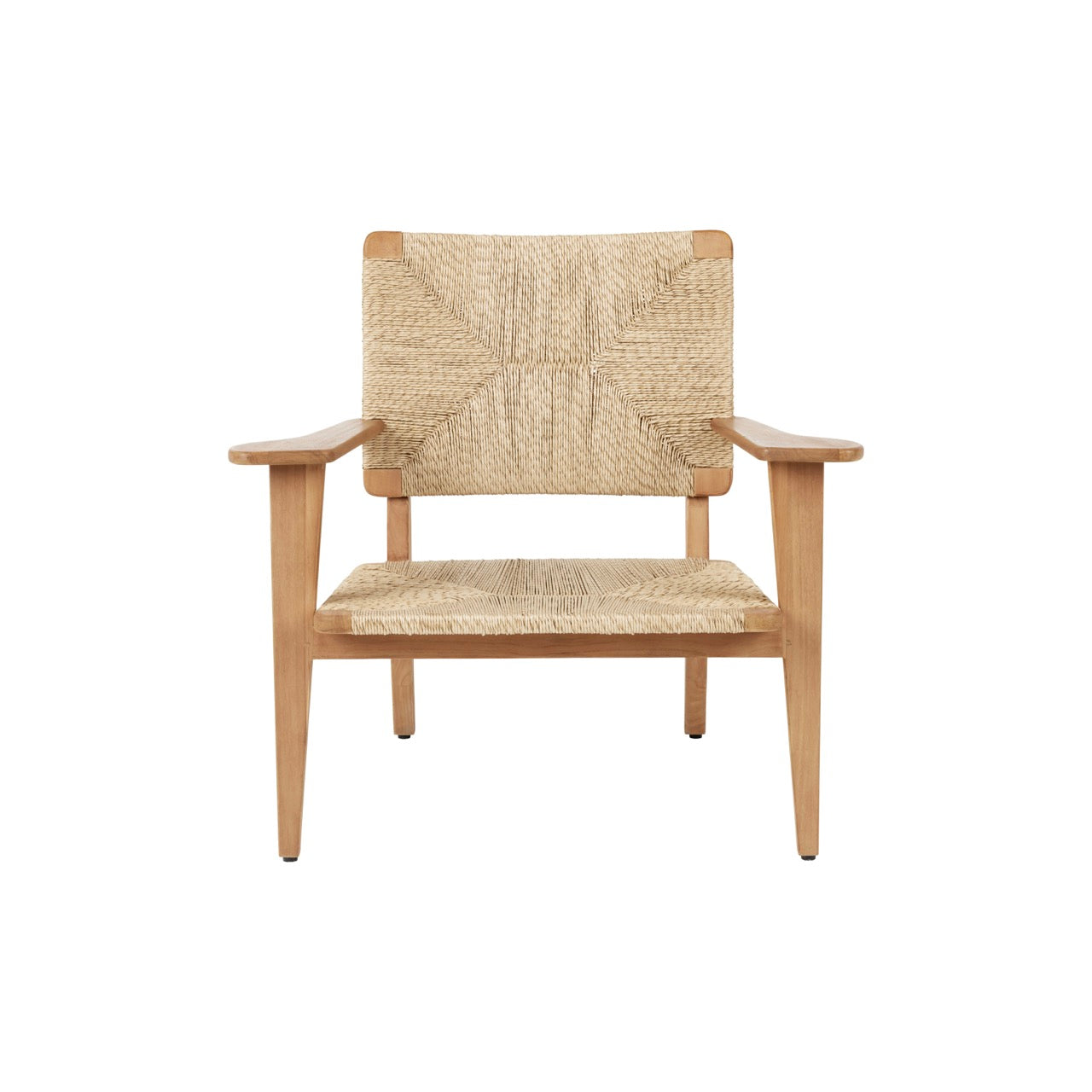 GUBIs F-Chair Outdoor er preget av en robust konstruksjon og et enkelt, men sterkt uttrykk. Lenestolen er egnet for både innendørs og utendørs bruk, og er laget av teak og flettet av polyetylen med høy tetthet, som ligner vannhyasint eller papirgarn i utseende, men tåler all slags vær. Den naturlige teakrammen vil utvikle en utpreget sølvgrå patina over tid, bruk og eksponering for elementene.
