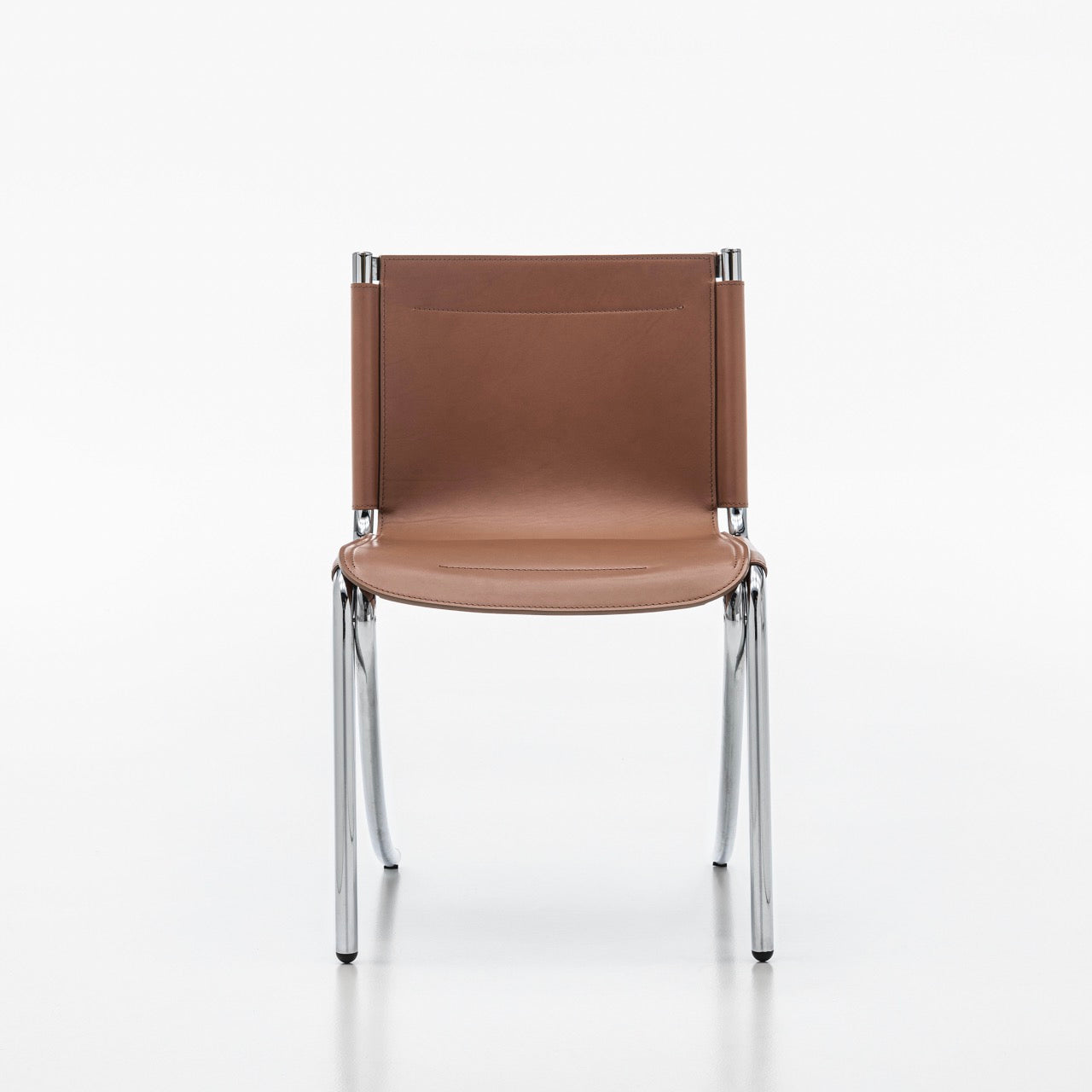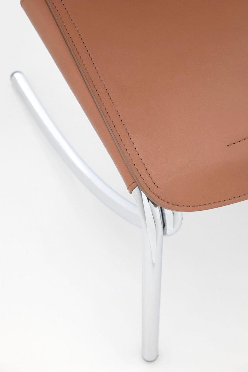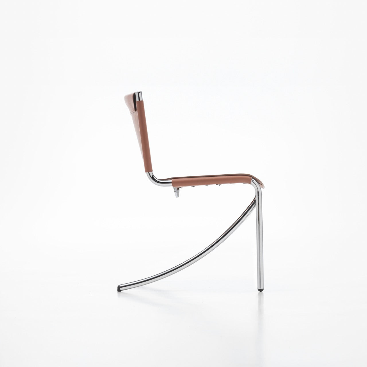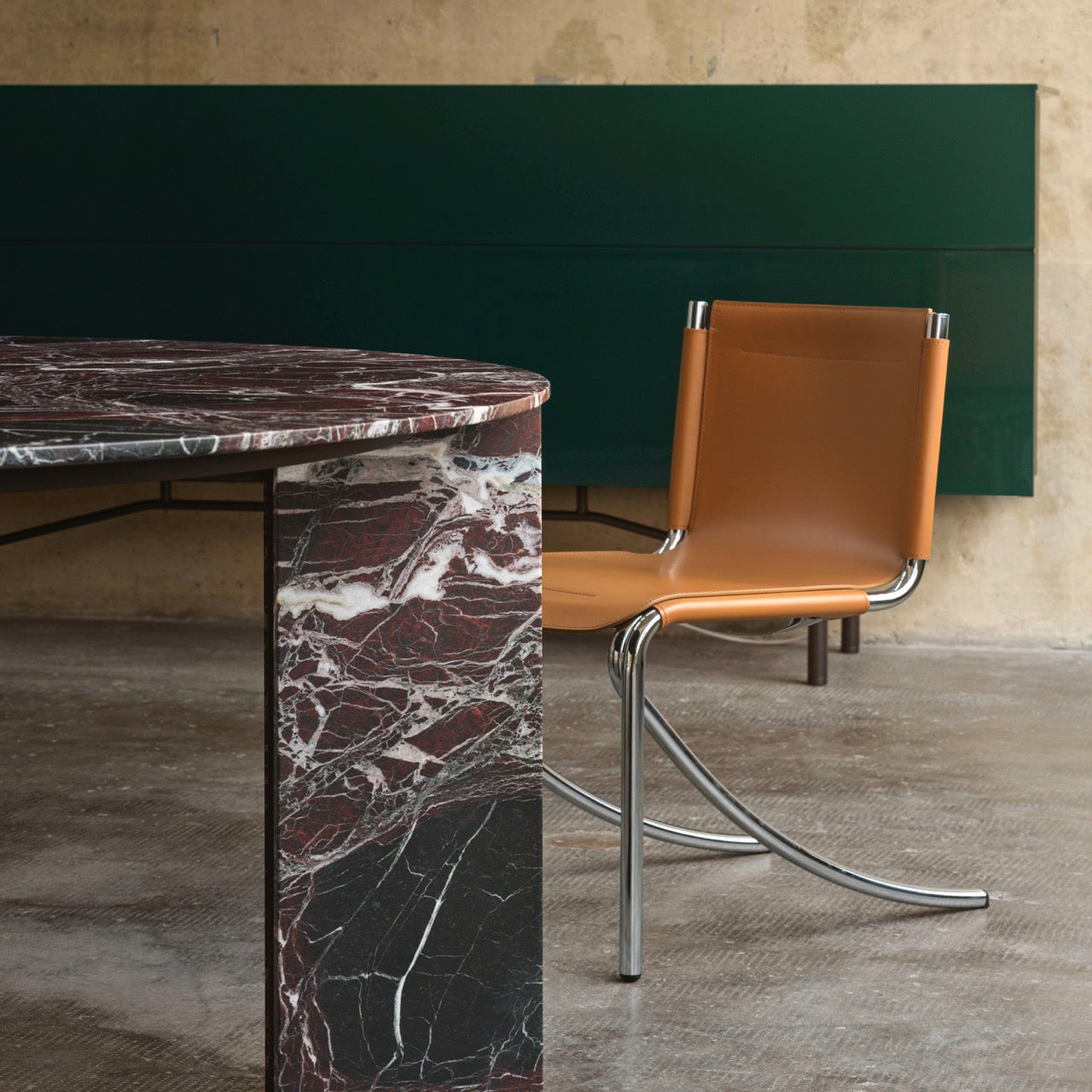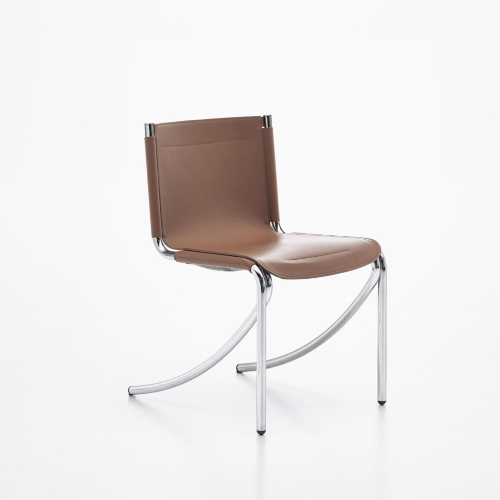 Den rørformede kromrammede Jot-stolen feirer rustfritt stål i Bauhaus-tradisjonen, og tar sin svevende, balletiske form inn i moderne tid med en ny versjon renset for enhver maling eller fargestoff som ville skjule essensen av dens kraftige metall- og råskinnelementer. Et ikonisk eksempel på Giotto Stoppinos mesterlige bruk av utkragede stolstiler og hans utforskende metode med materialer.