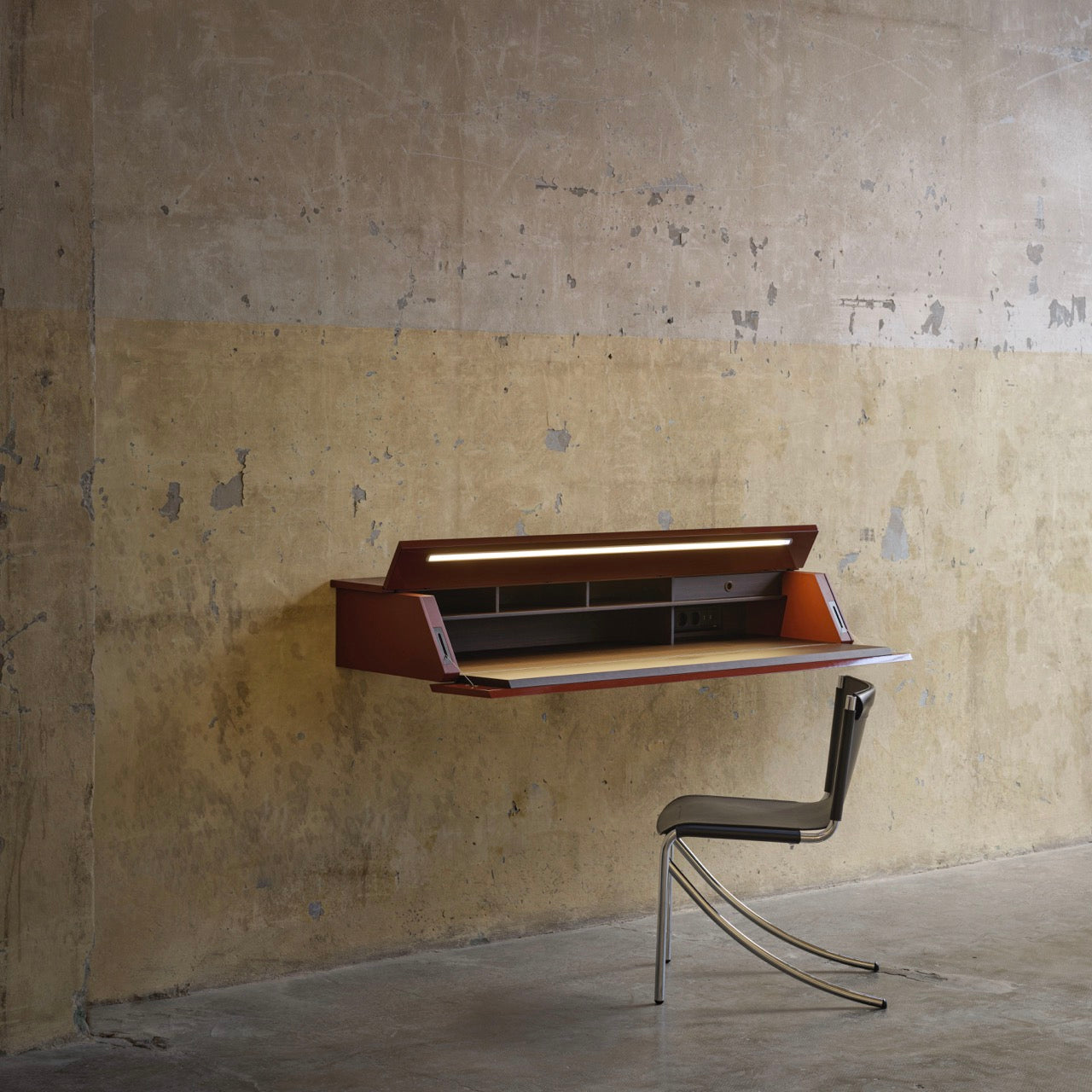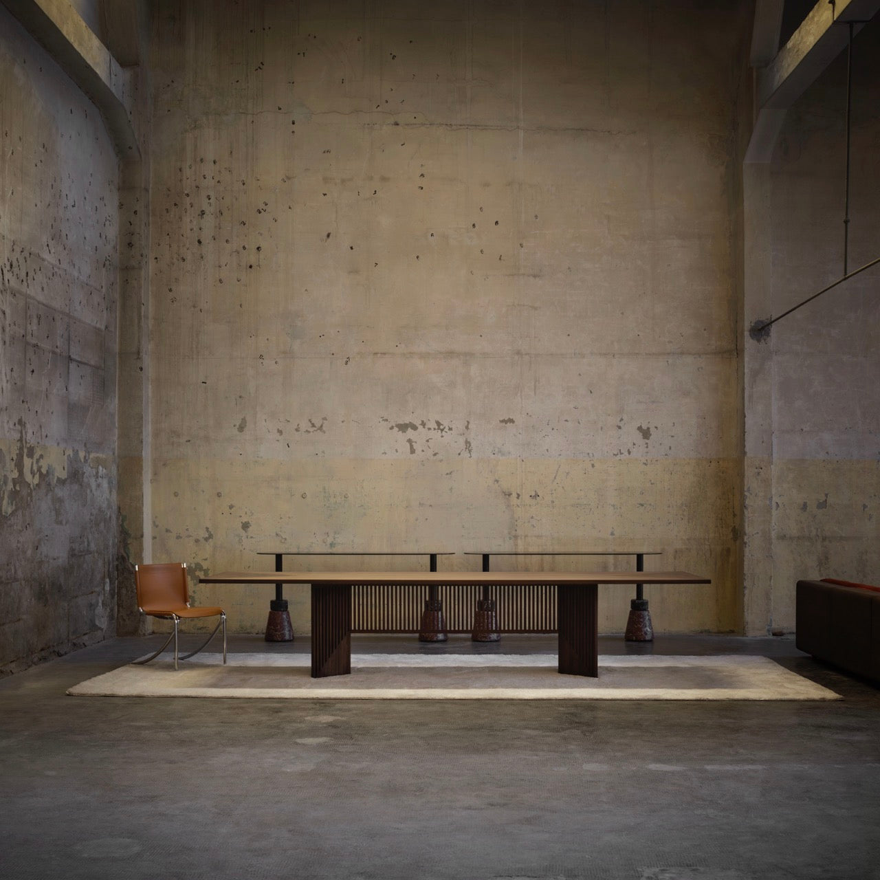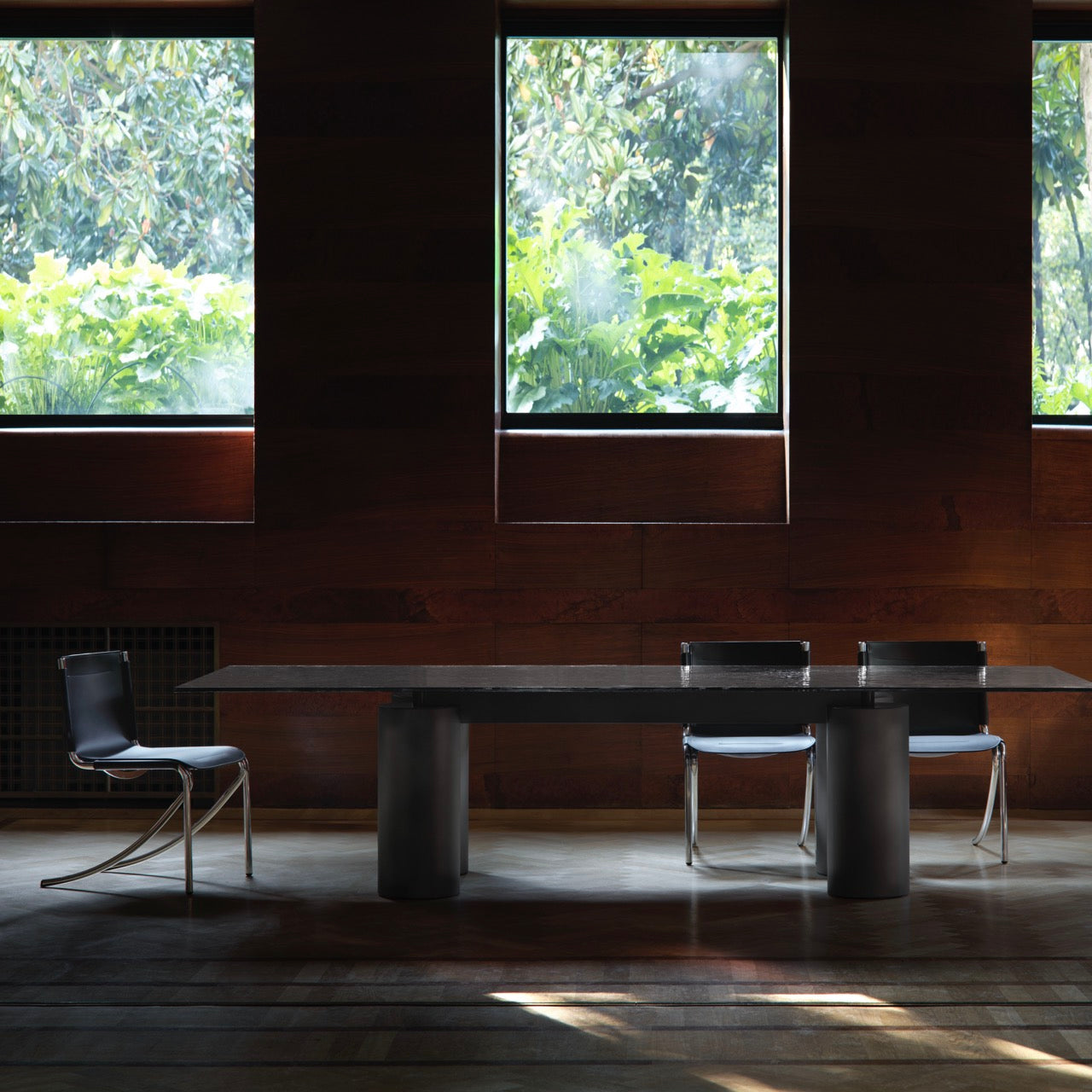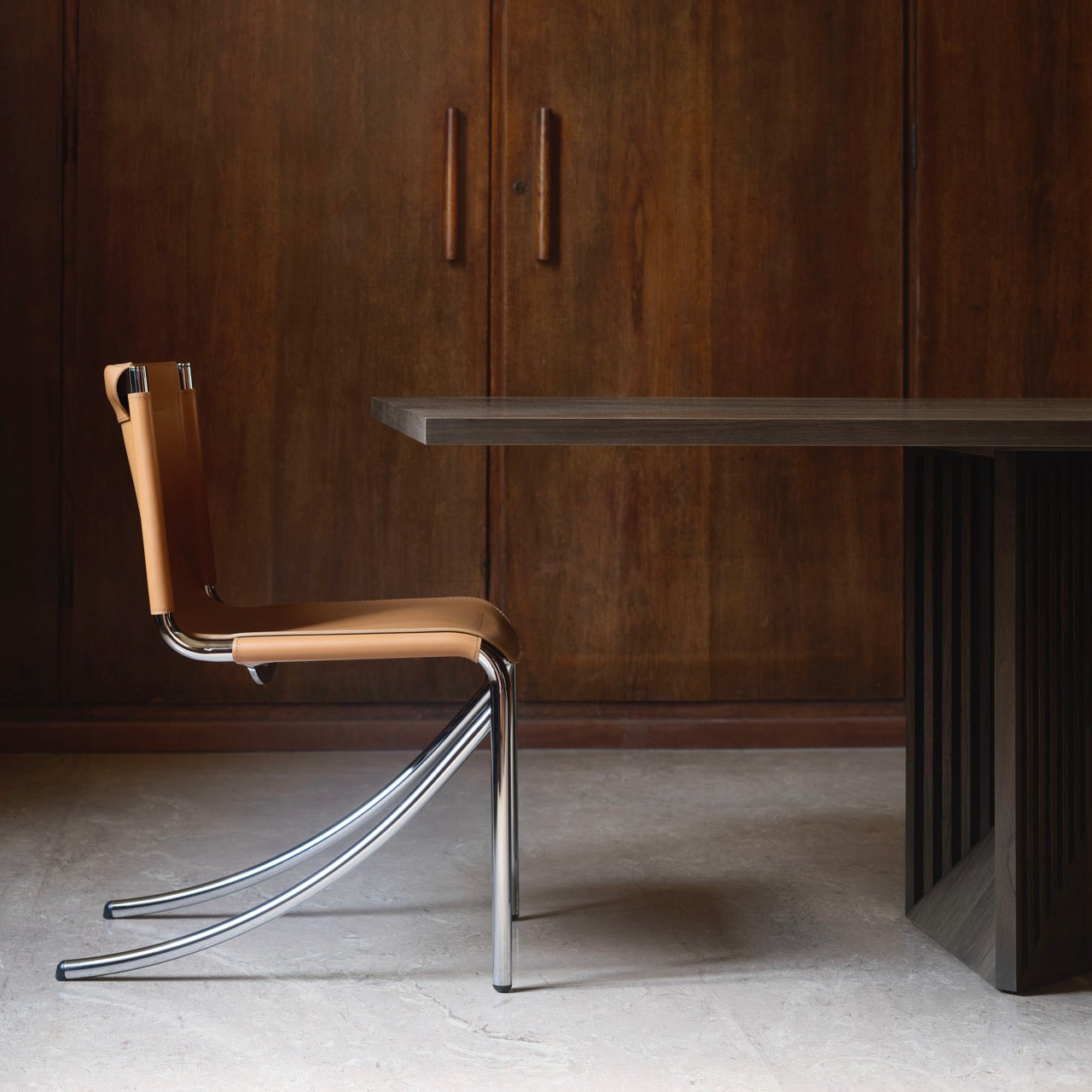 Den rørformede kromrammede Jot-stolen feirer rustfritt stål i Bauhaus-tradisjonen, og tar sin svevende, balletiske form inn i moderne tid med en ny versjon renset for enhver maling eller fargestoff som ville skjule essensen av dens kraftige metall- og råskinnelementer. Et ikonisk eksempel på Giotto Stoppinos mesterlige bruk av utkragede stolstiler og hans utforskende metode med materialer.