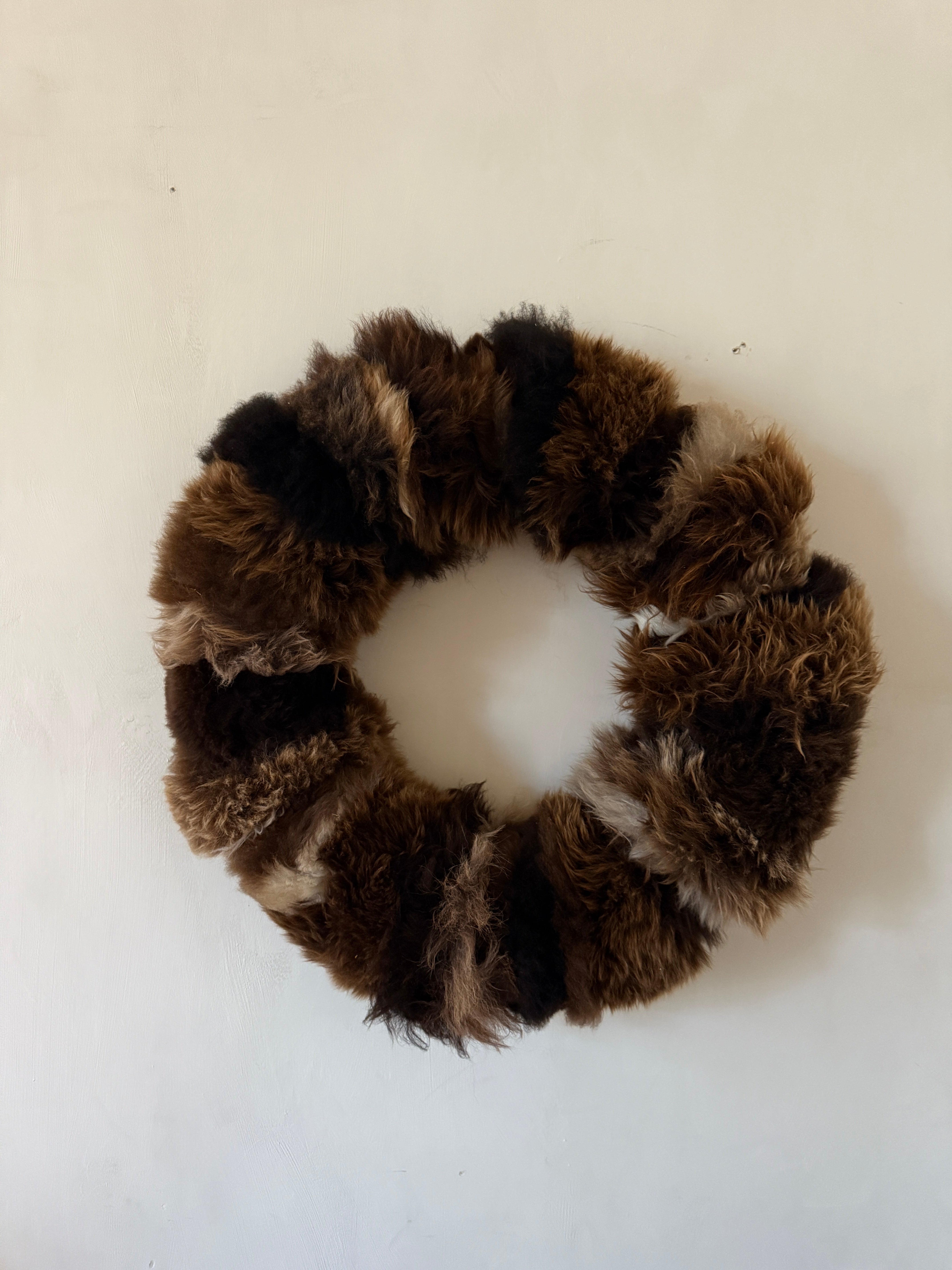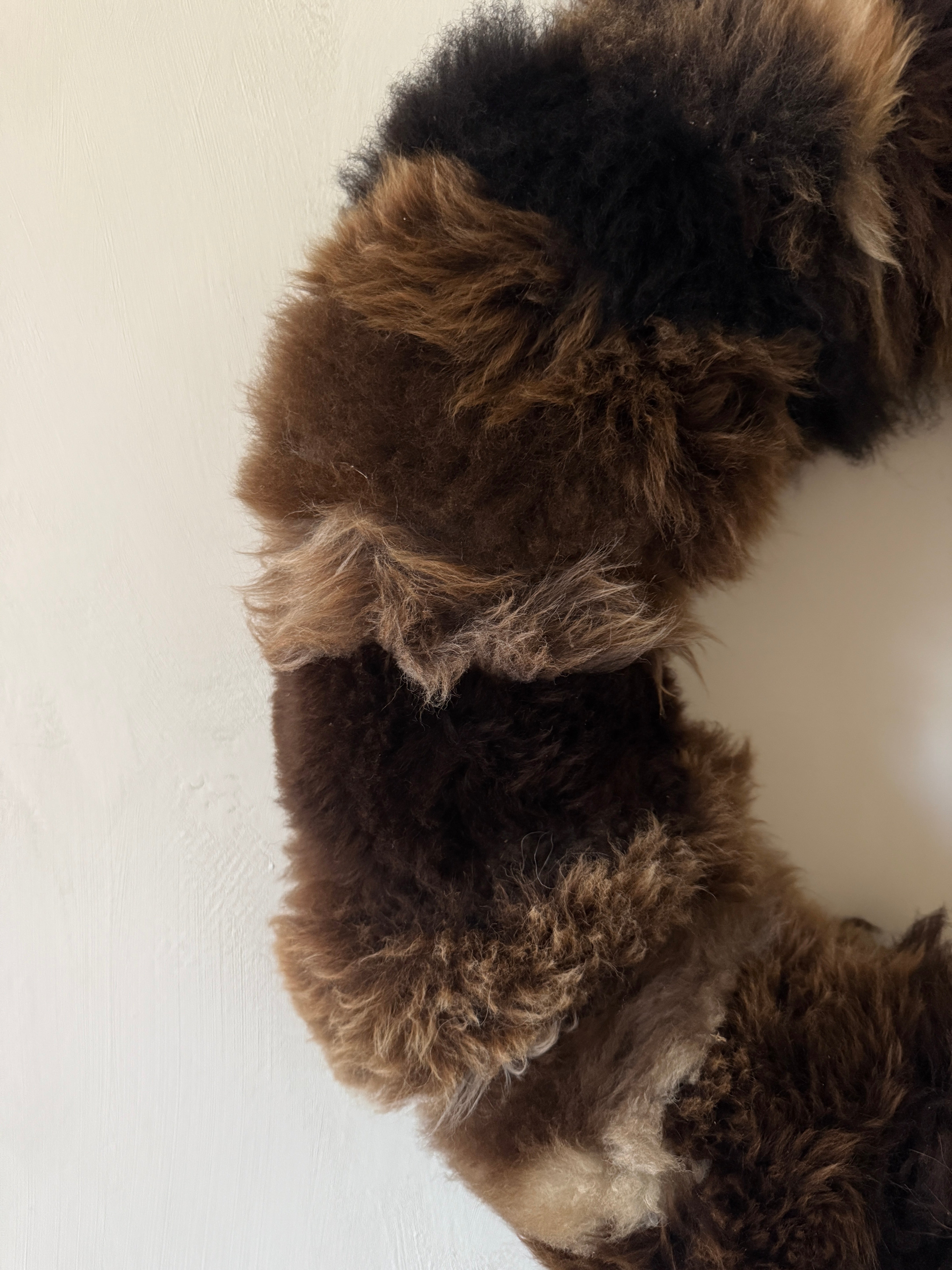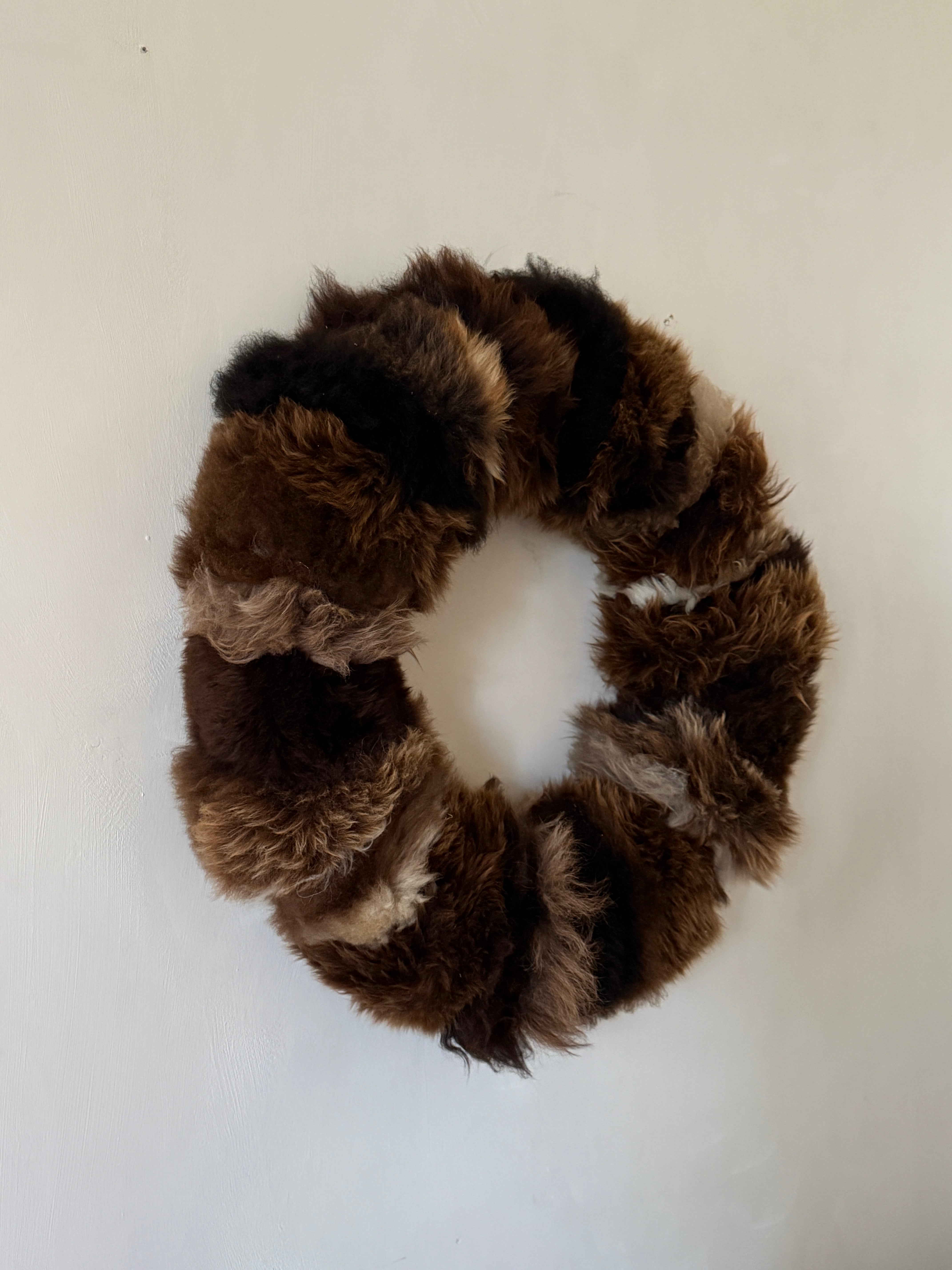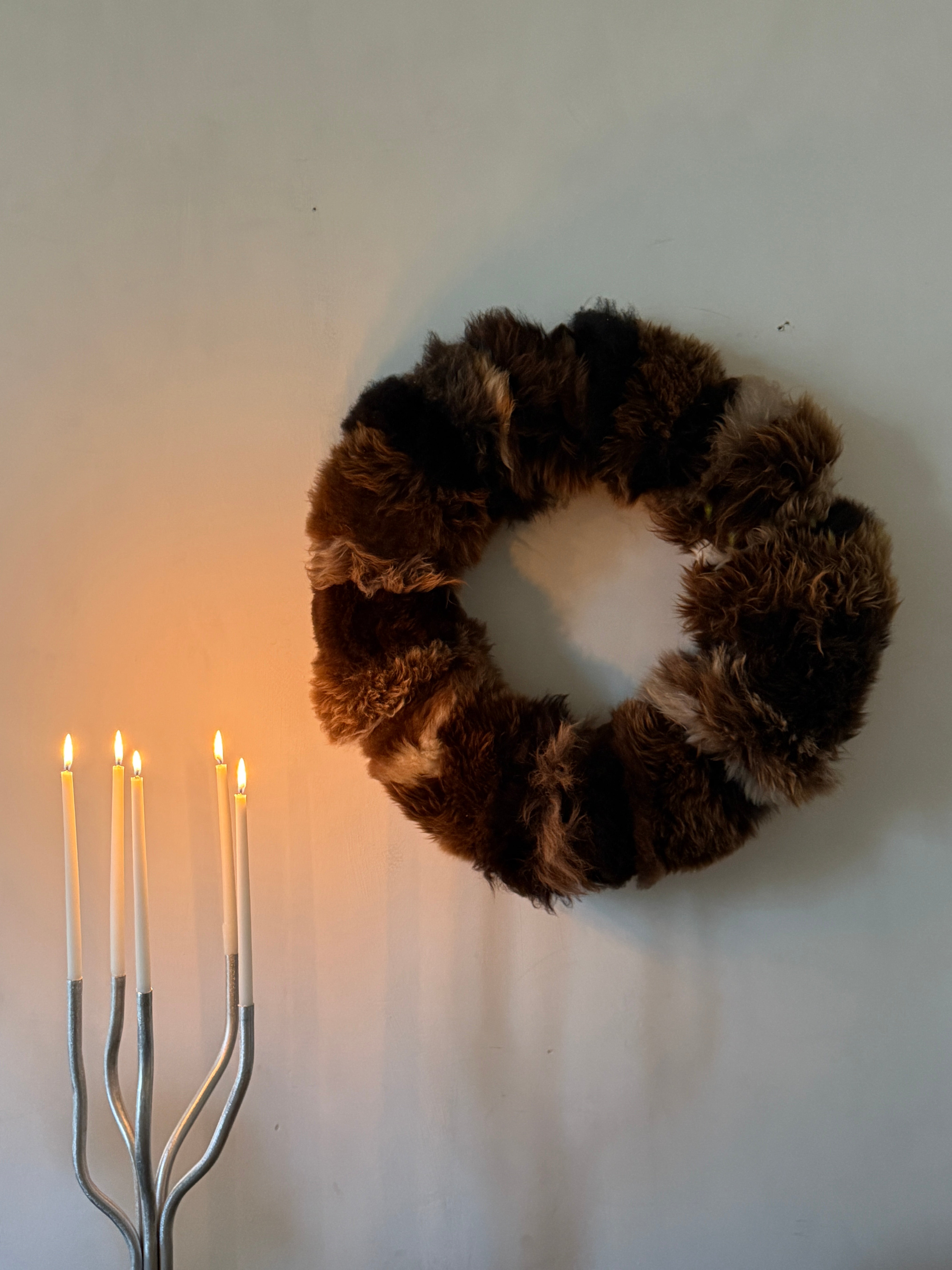 Materiale: Ulike typer naturlig saueskinn. Selve kransen er en stråkrans.