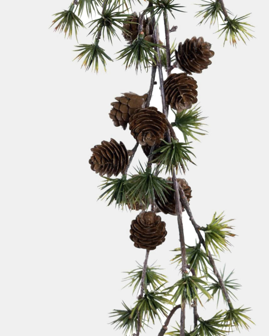 Kunstig lerk girlander med ekte små kongler. Ståltråd kjerne og løkke i enden. Bruk den til dekor på bordet eller heng den opp der du ønsker.