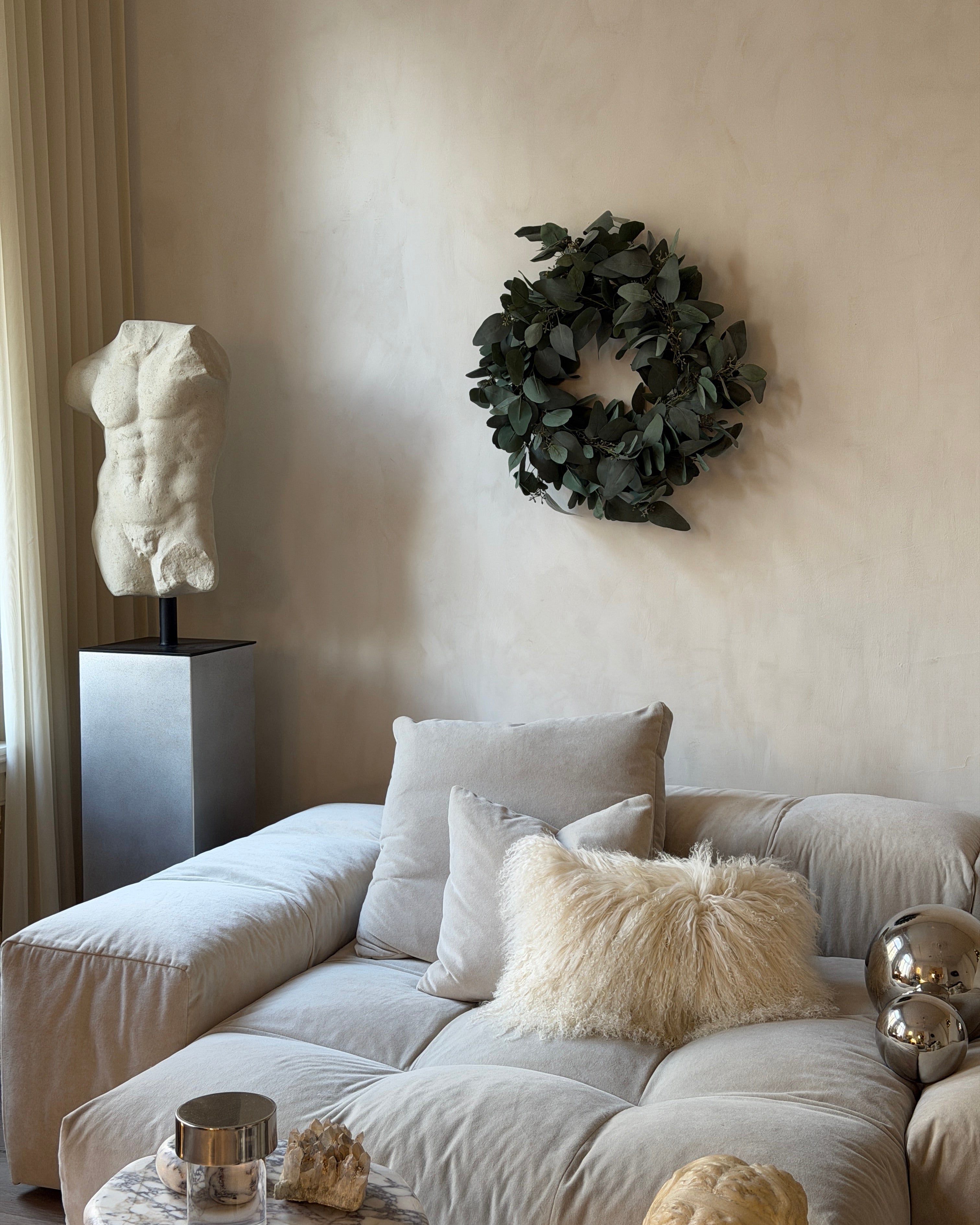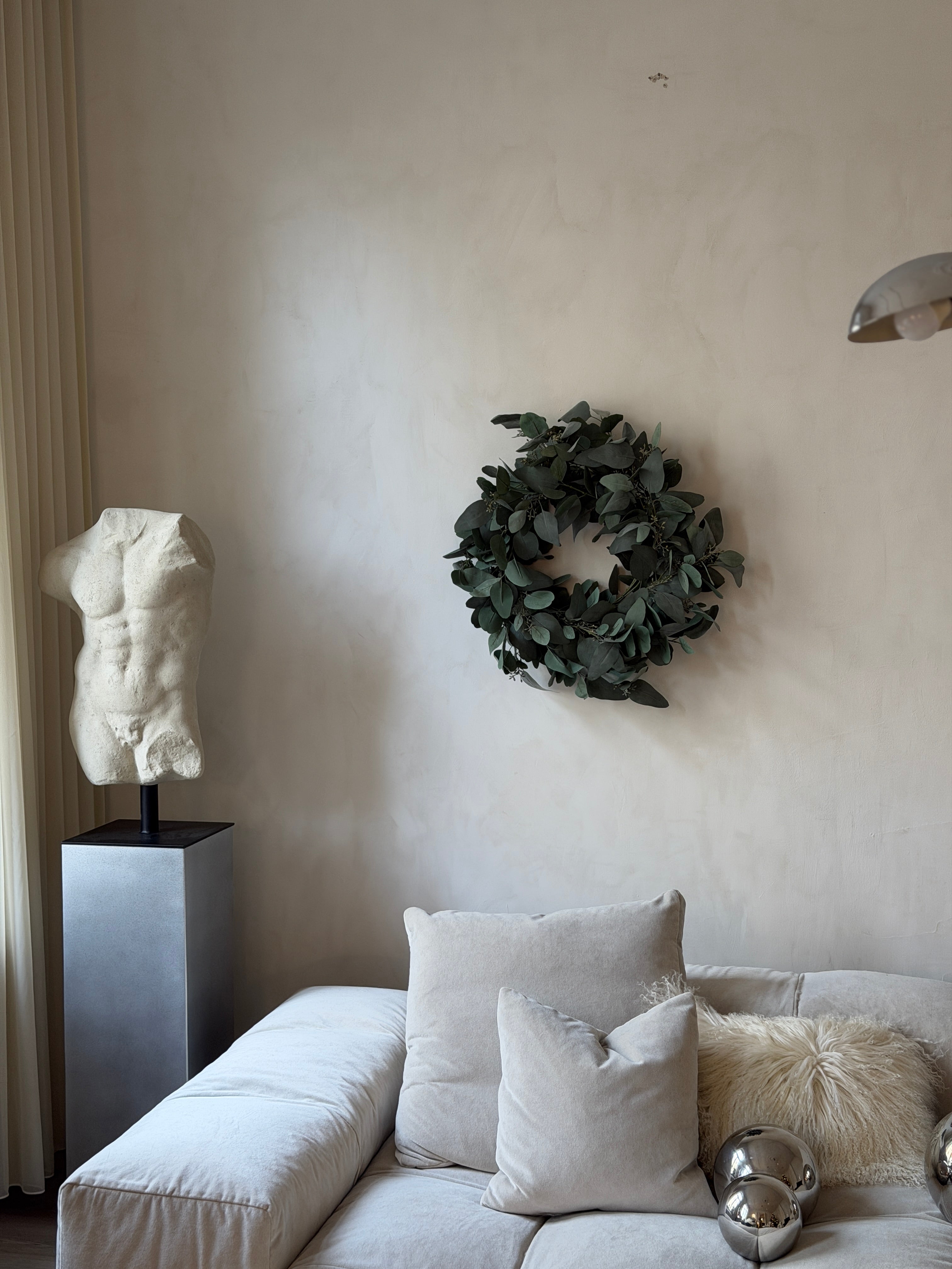 Fyldig og vakker krans av storbladet eucalypthus. Fine, duse grønntoner. Små kremfargede bær. Kransen er like vakker på vegg, som hengende horisontalt fra tak. Rammen bak er i metall. Innvendig omkrets er 30 cm- ytterst ca 60cm
