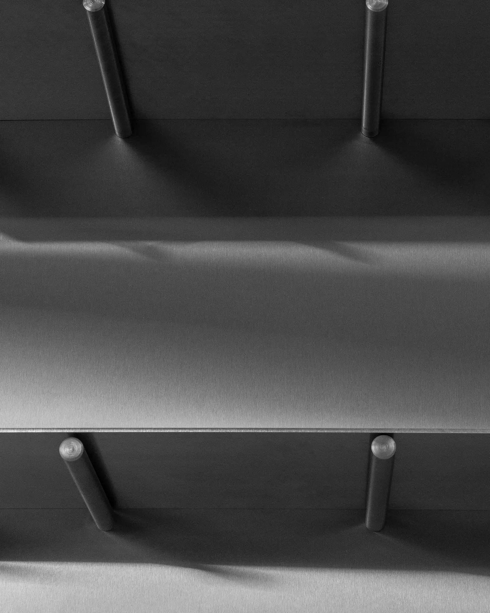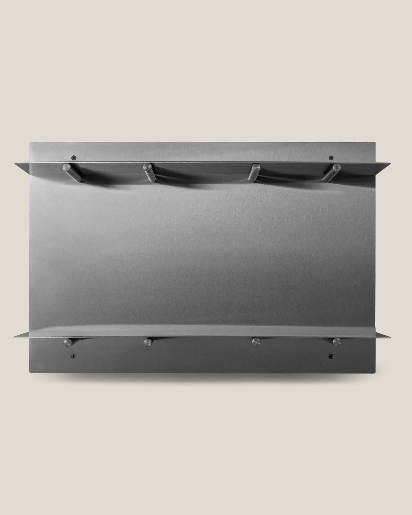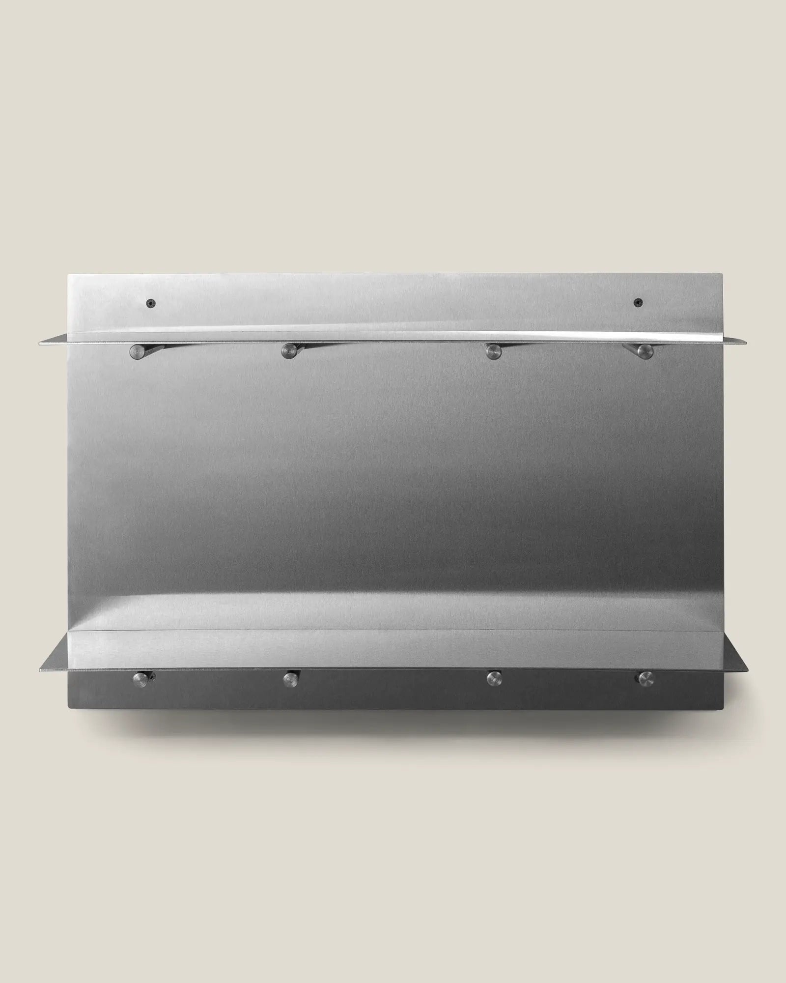 En rå og elegant hylle laget for å tåle tidens tann mens den blander seg inn i ethvert rom, og skaper et minimalt bakteppe for tingene og minnene dine. Den rå rustfrie stålplaten er delt av to forskjellige nivåer med solide stålbolter, og skaper en dynamisk hylle som enkelt kan plasseres og restyles på en rekke måter