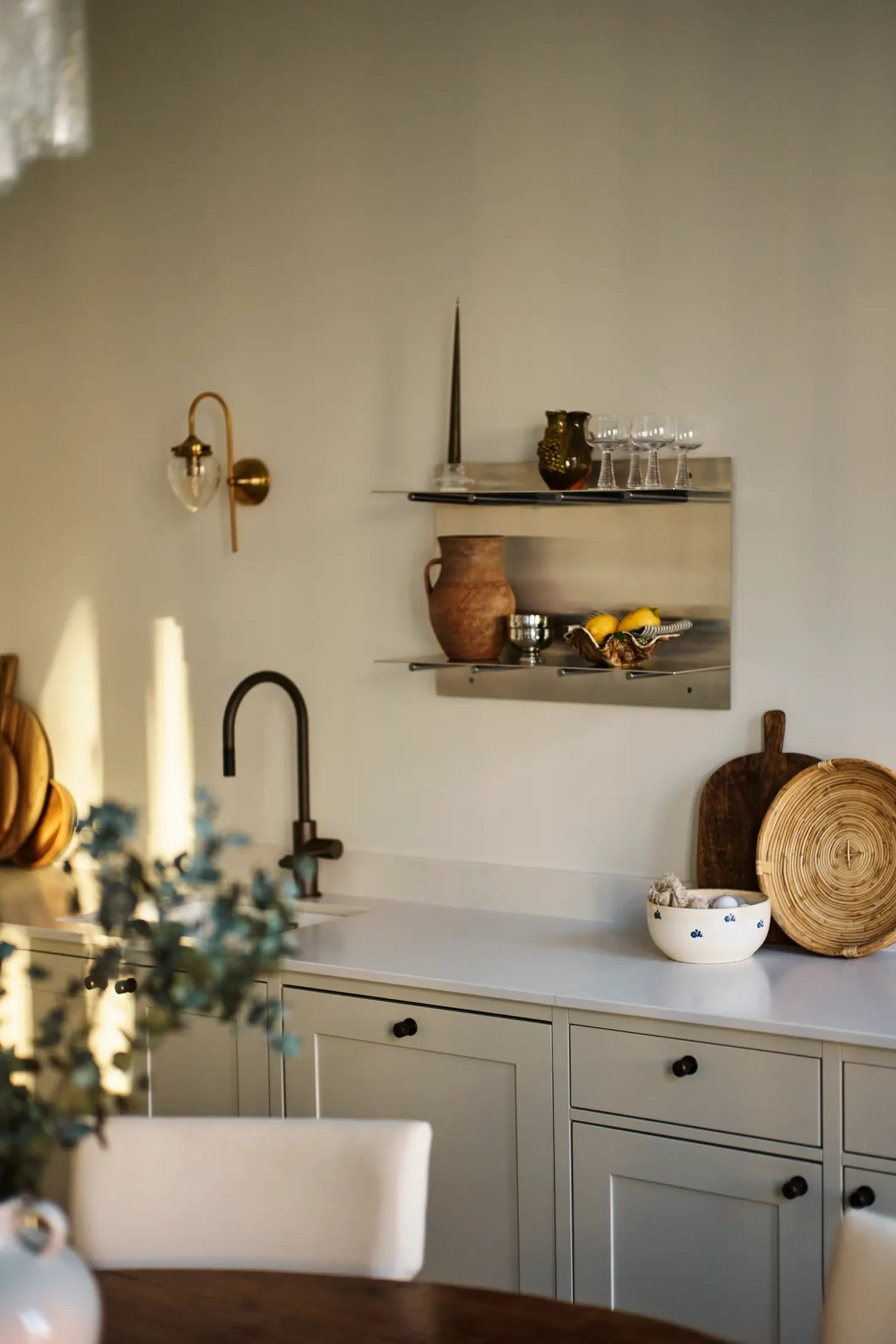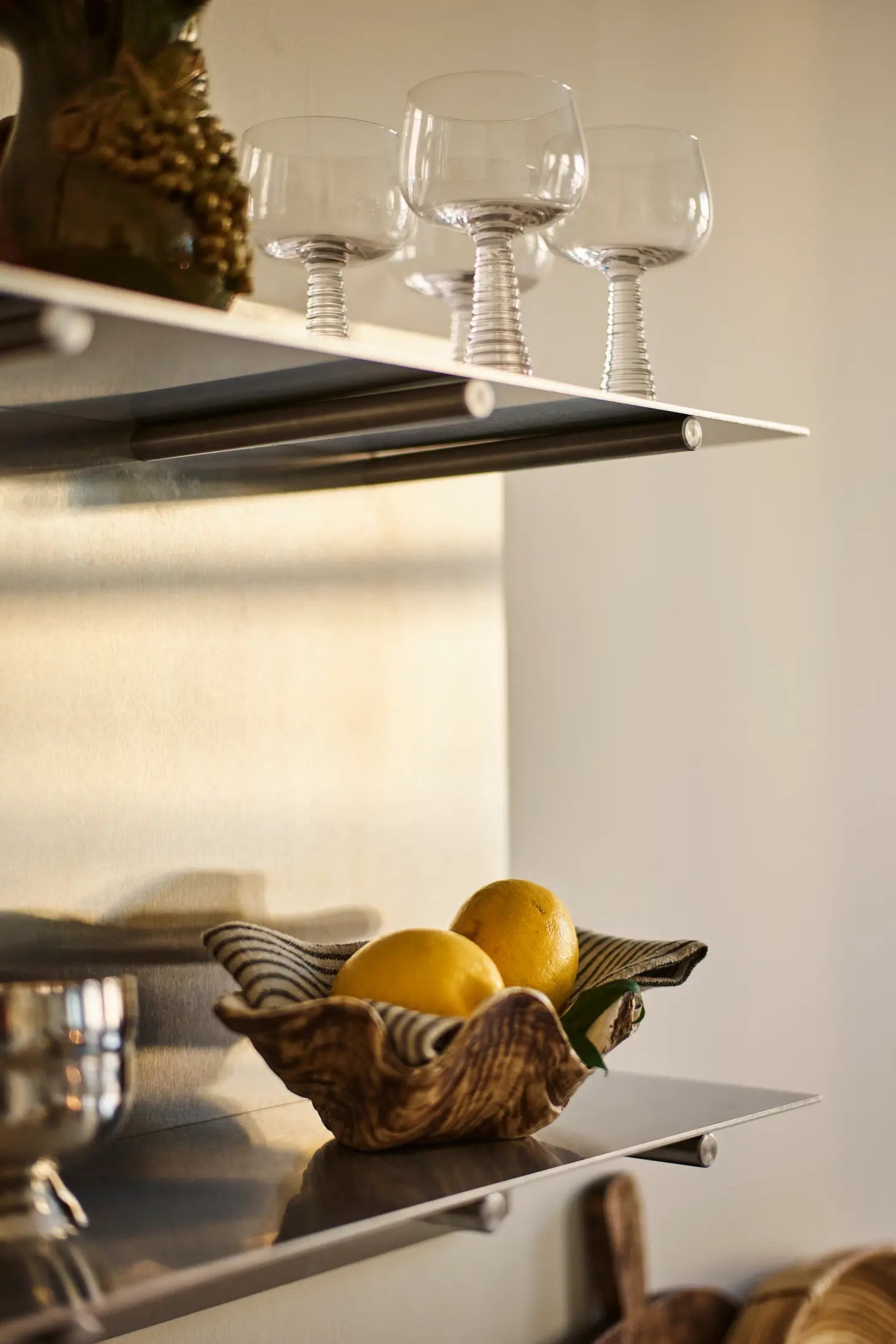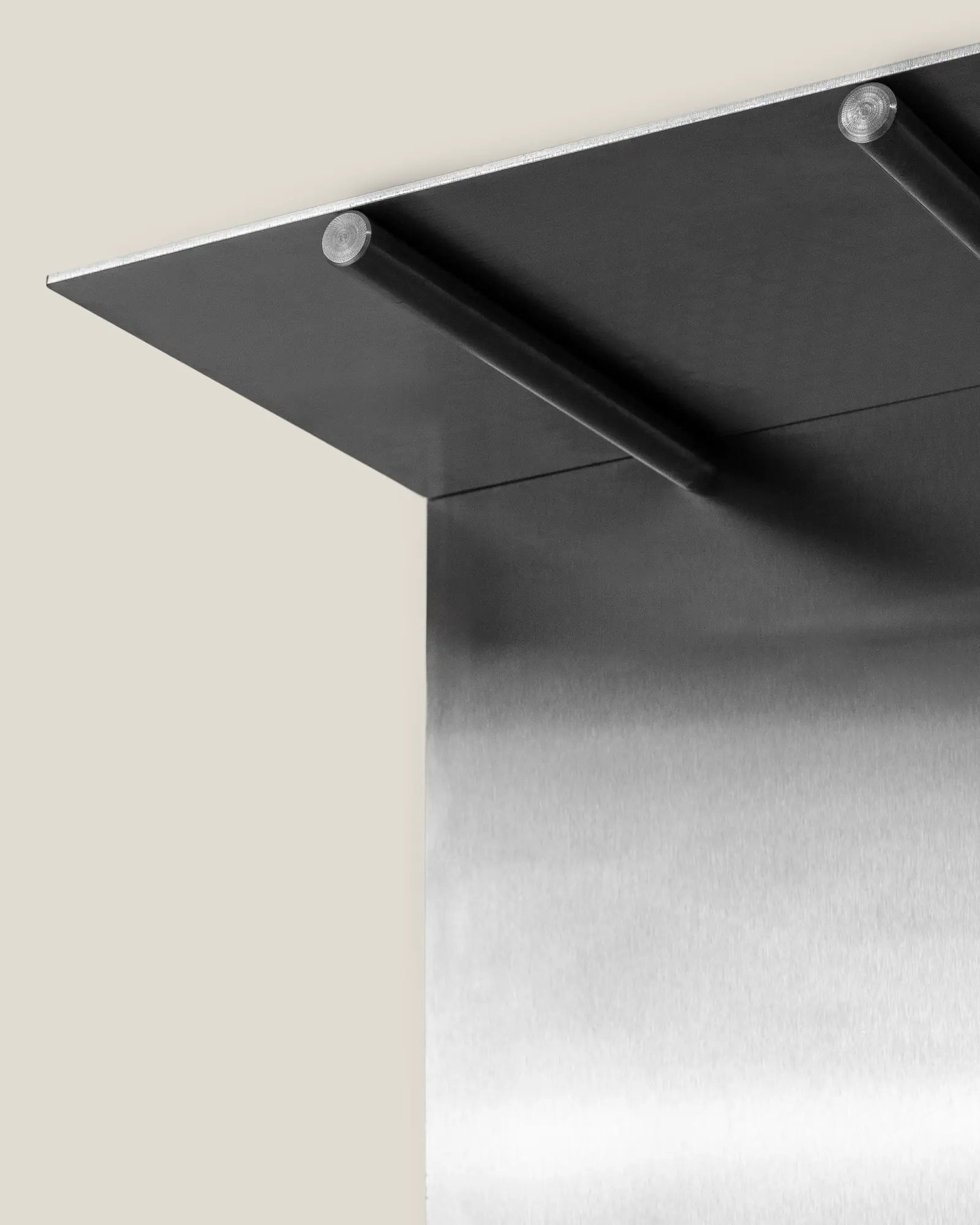 En rå og elegant hylle laget for å tåle tidens tann mens den blander seg inn i ethvert rom, og skaper et minimalt bakteppe for tingene og minnene dine. Den rå rustfrie stålplaten er delt av to forskjellige nivåer med solide stålbolter, og skaper en dynamisk hylle som enkelt kan plasseres og restyles på en rekke måter