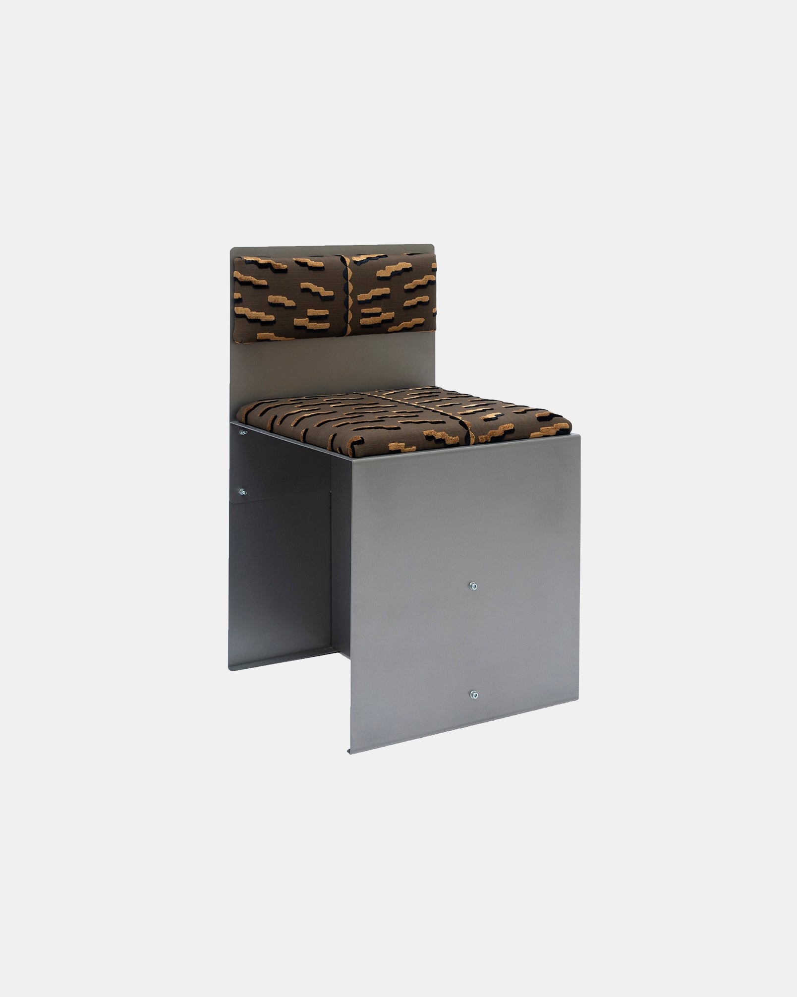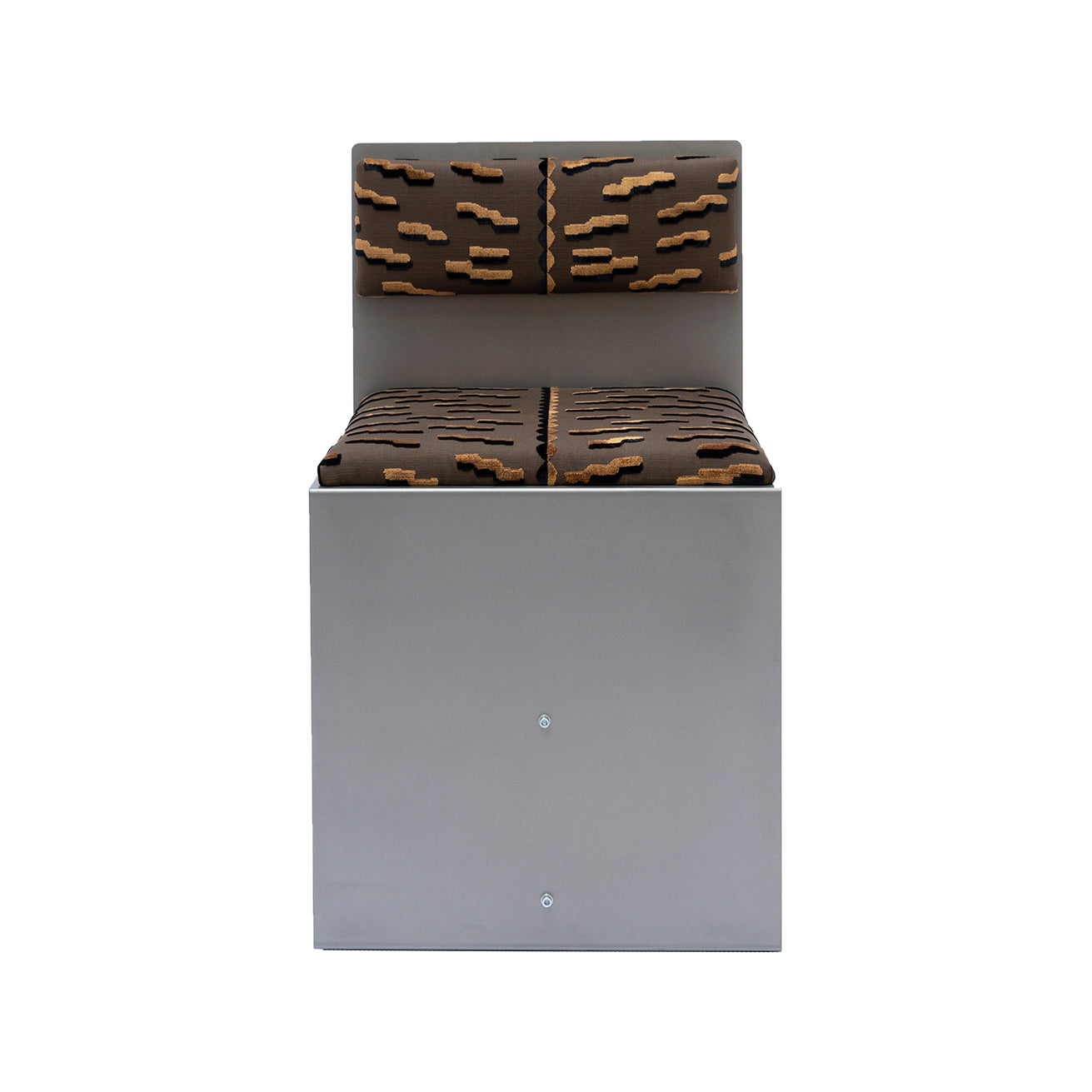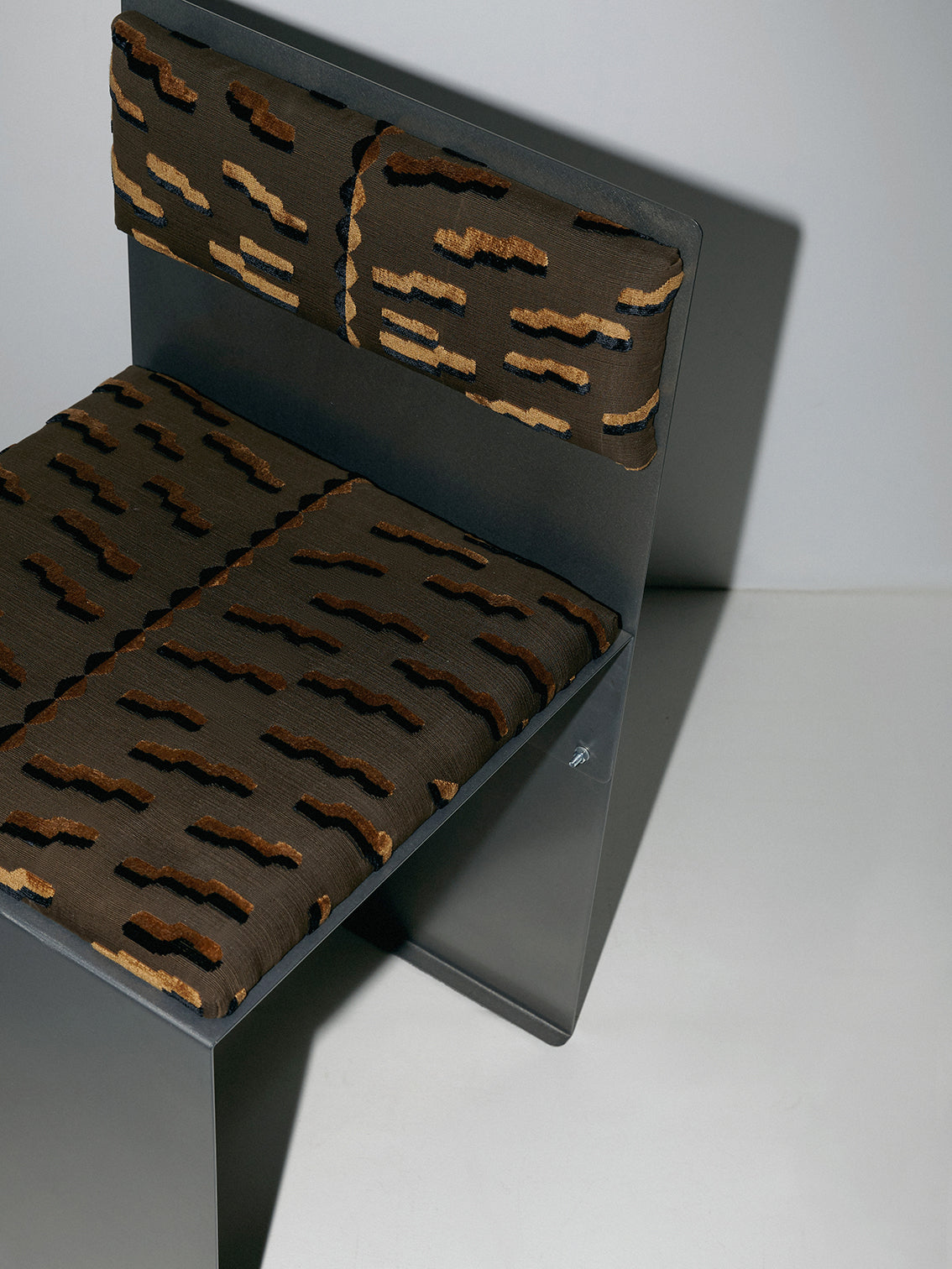 En utrolig kul spisestol laget med en røff aluminiumsramme, med store puter trukket i lekkert Dedar tekstil. En skikkelig statement stol!